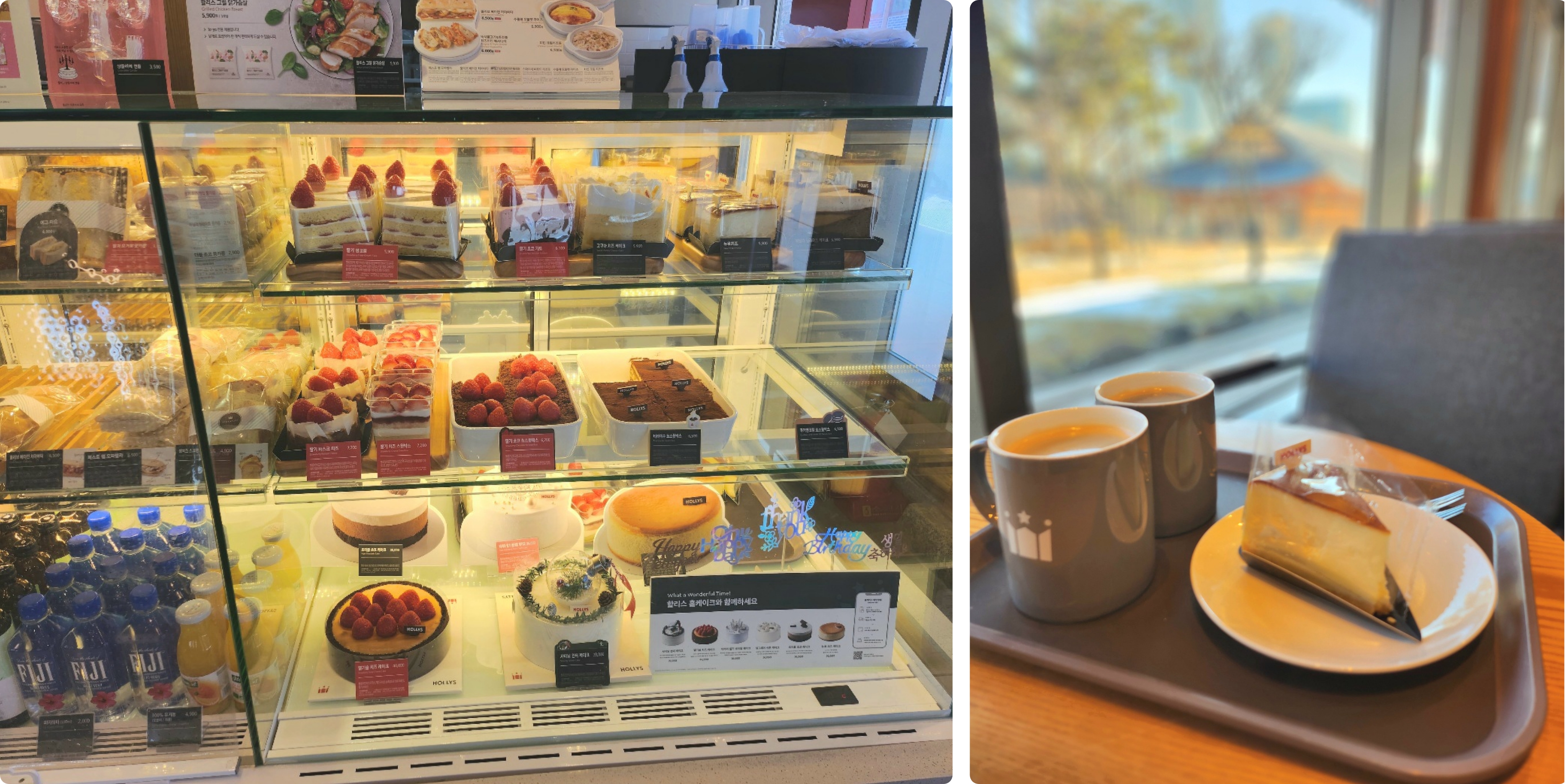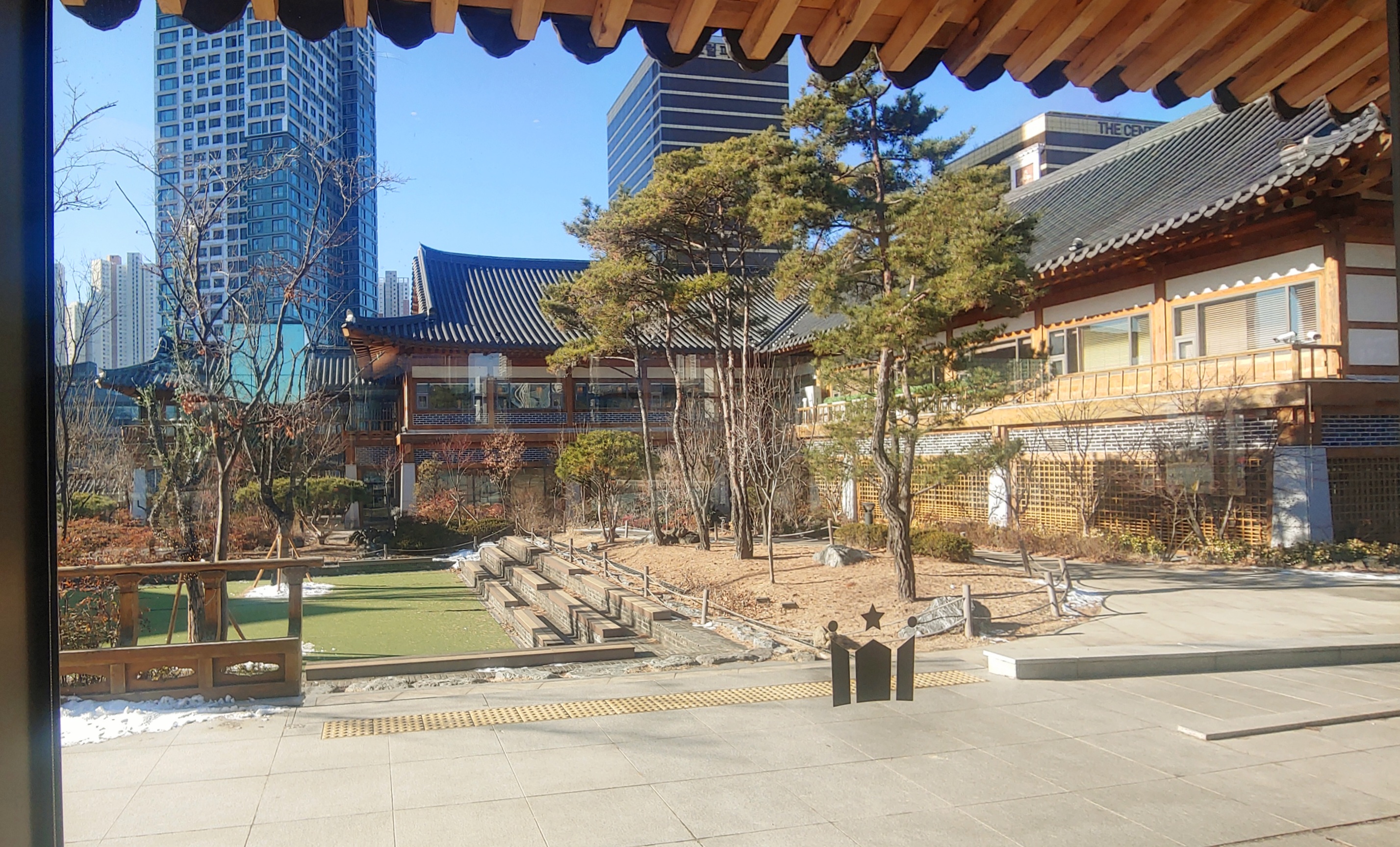프랜차이즈 카페이지만 창밖의 처마 너머로 한옥과 센트럴파크를 볼 수있다는 점이 특징이다.