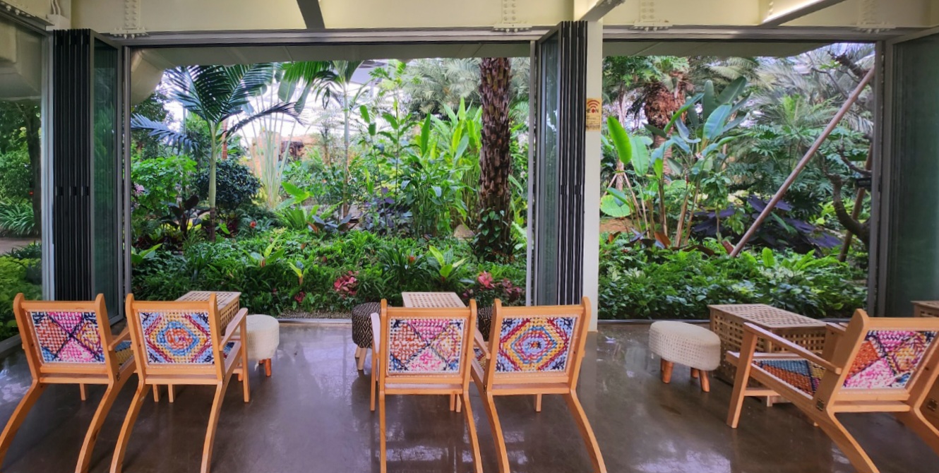1층 좌석은 대부분 식물원을 바라보는 방향으로 다양하게 배치되어 있다. 1층의 폴딩도어가 오픈되는 공간이 가장 개방감이 좋다.