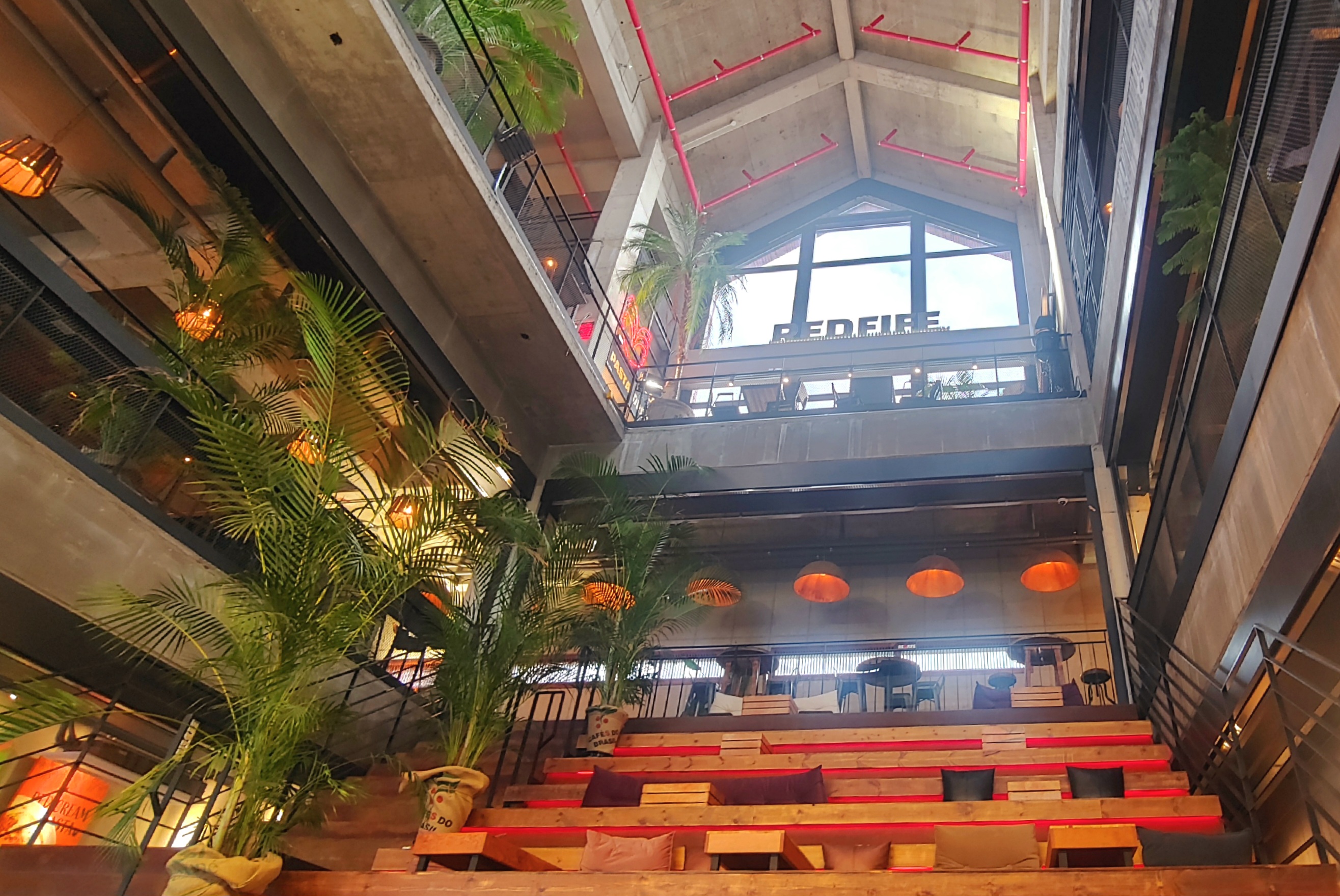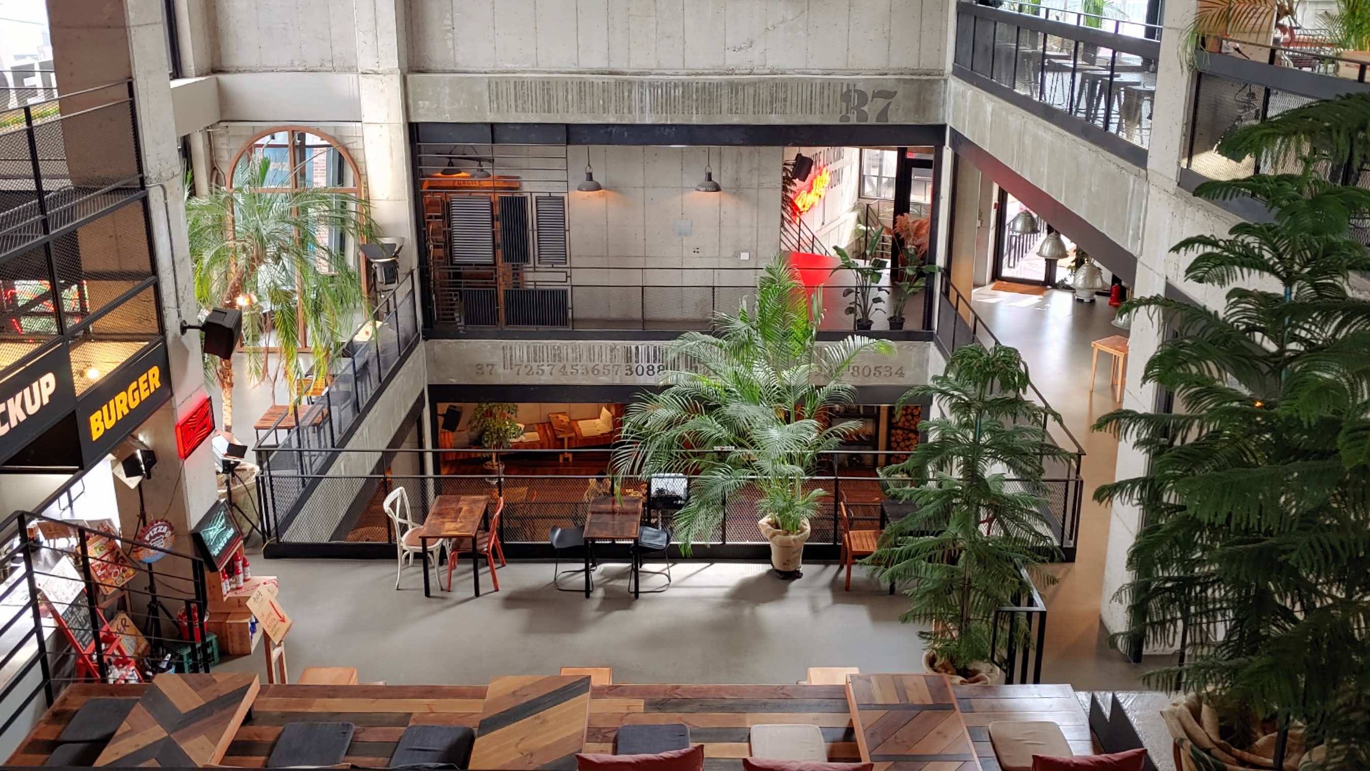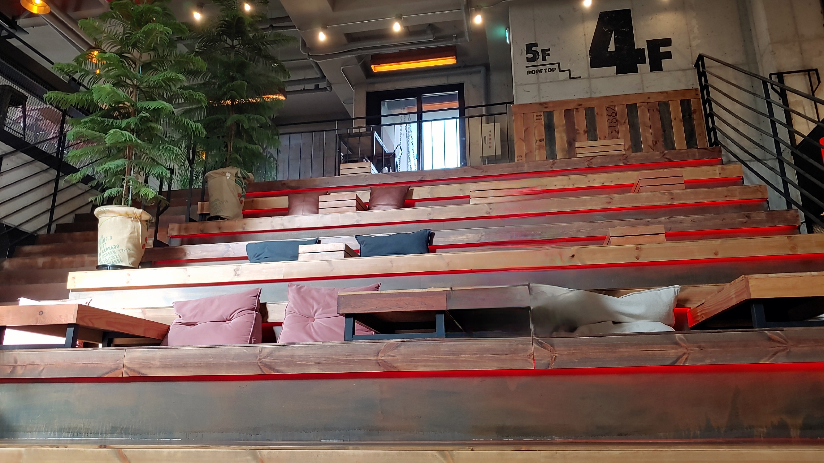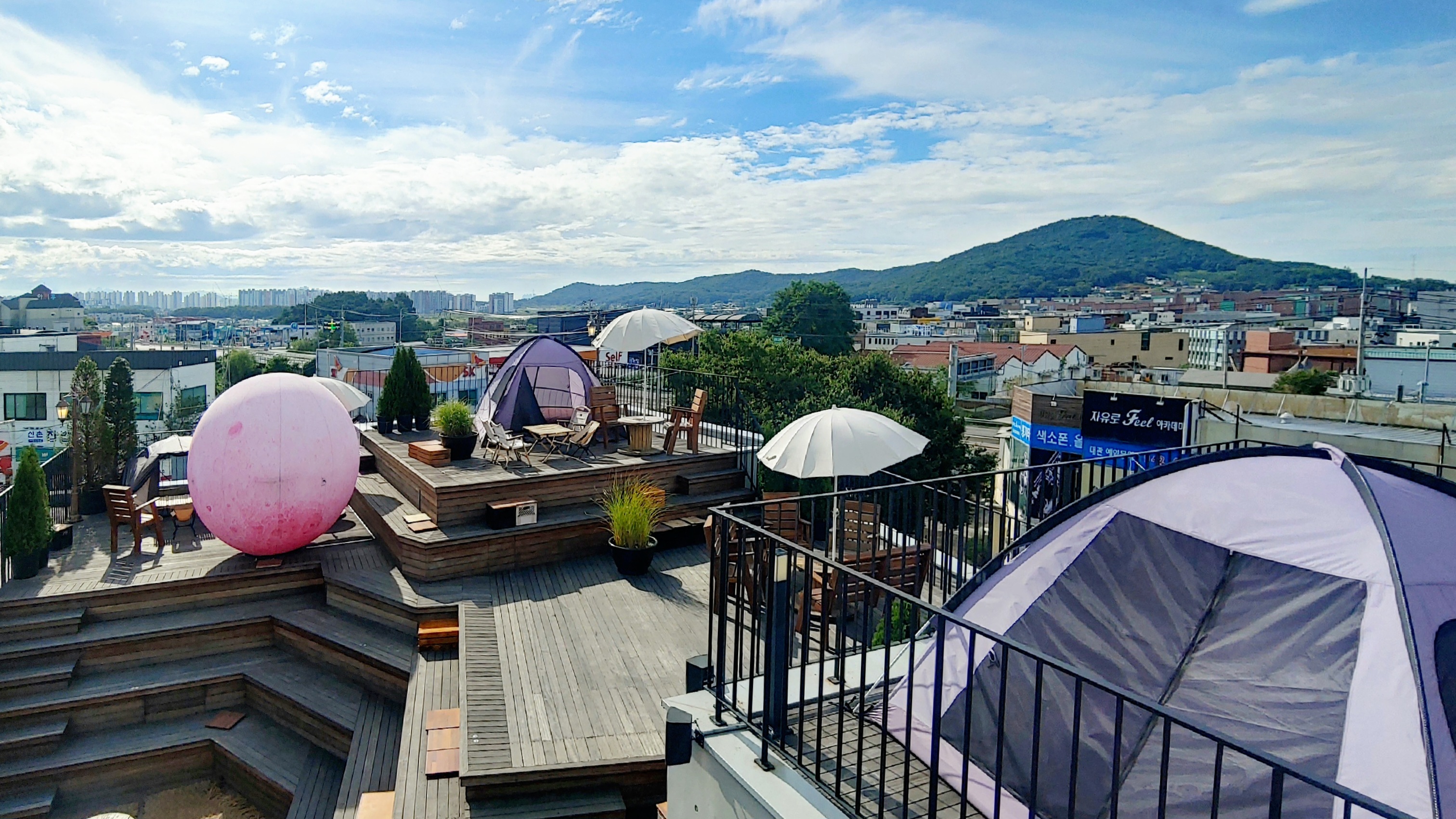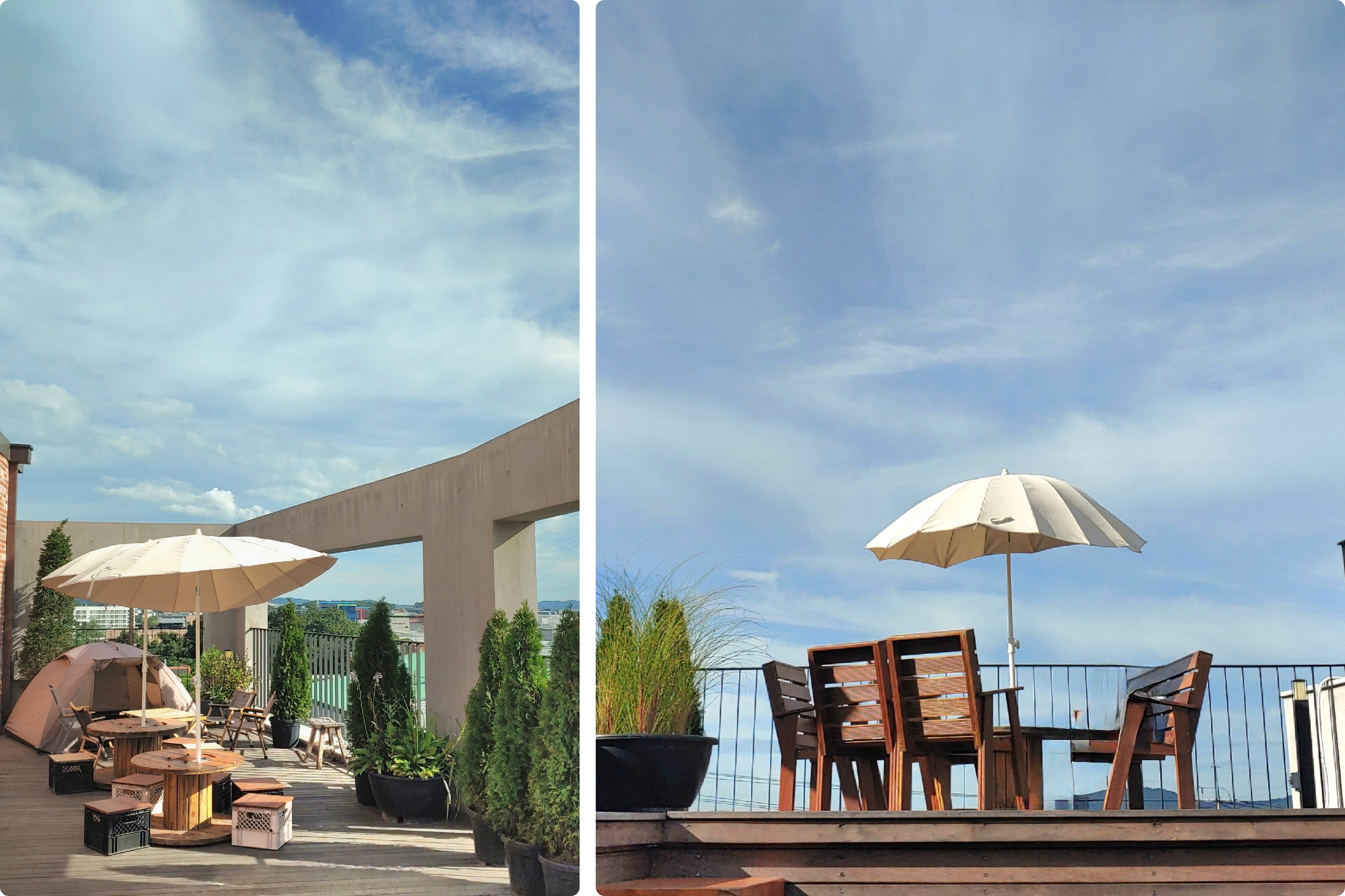4층까지도 다양하지만 루프탑에는 또 새로운 콘셉트의 공간이 있다. 텐트와 파라솔 등이 설치되어 있어서 날씨가 맑은 날은 야외 공간을 즐길 수 있다. 야간에는 불이 들어오는 핑크색 달모양의 포토 스폿이 있다.