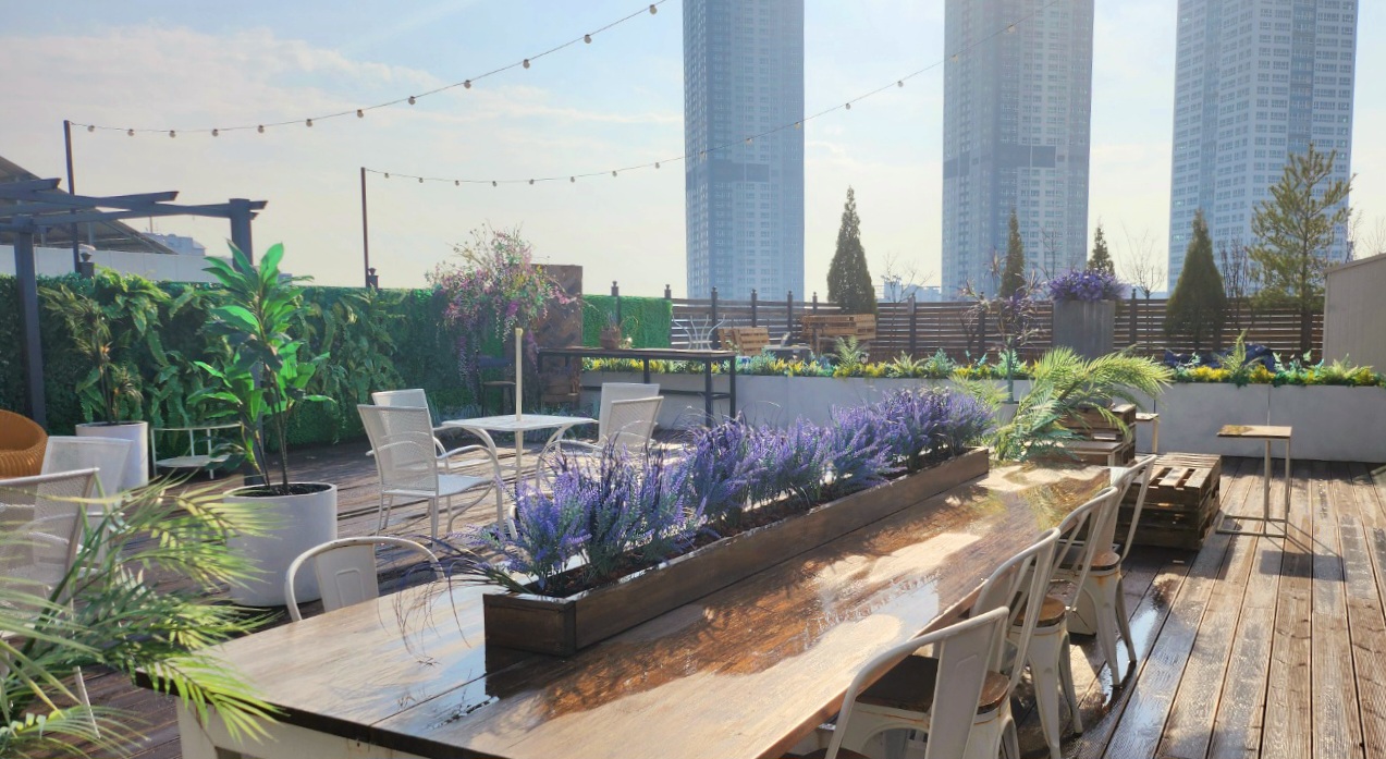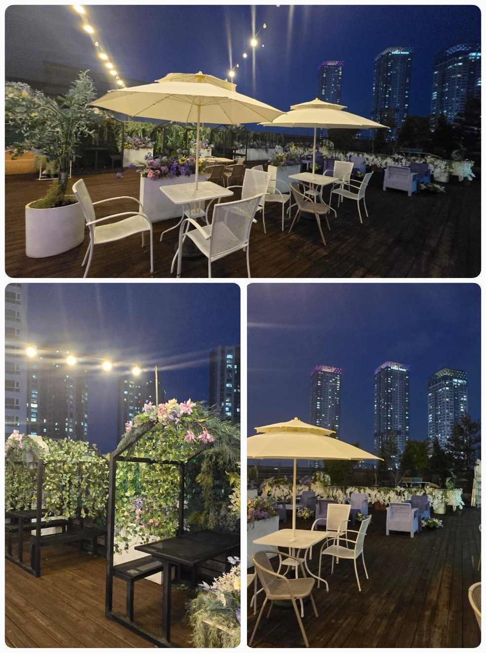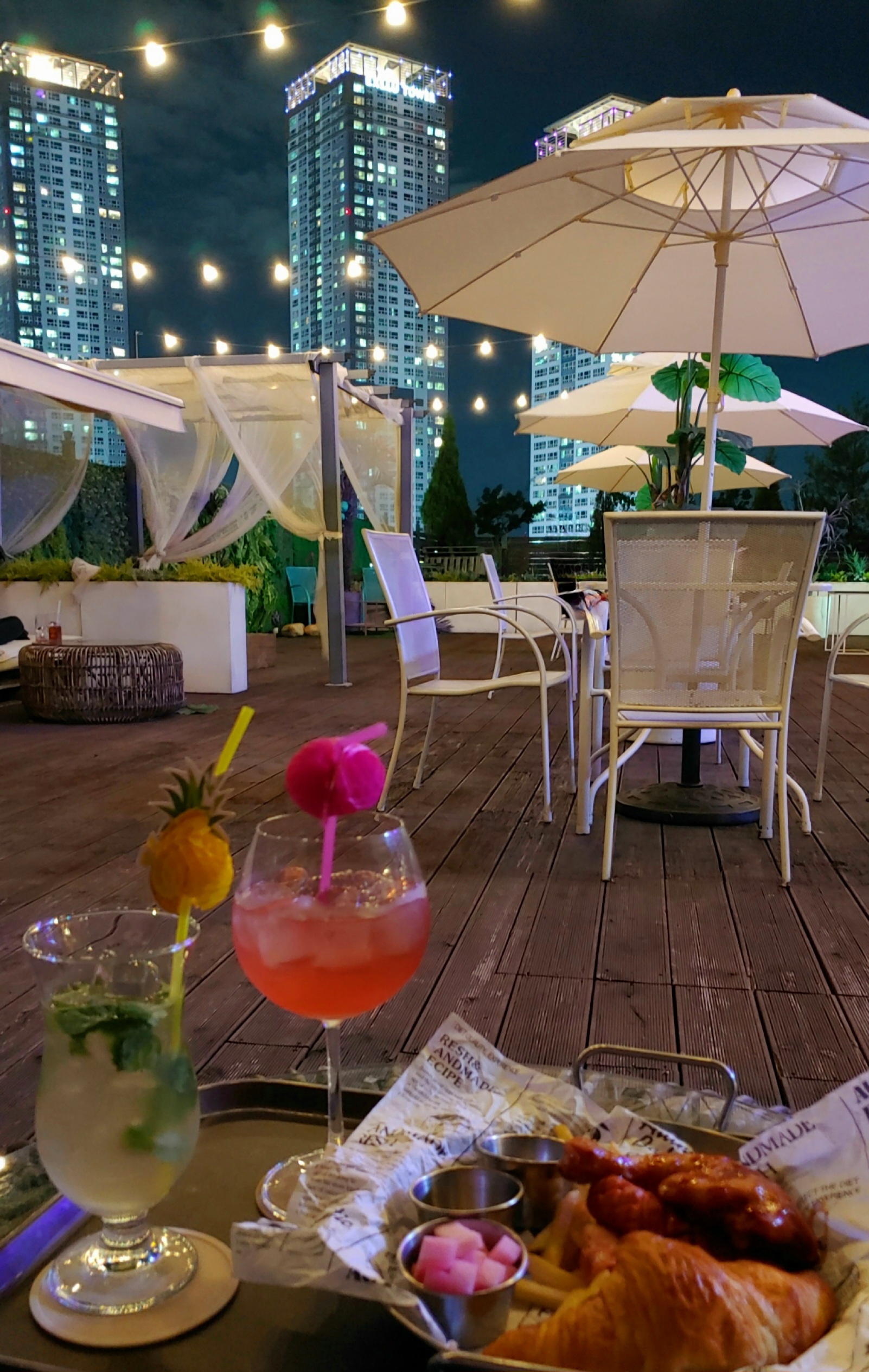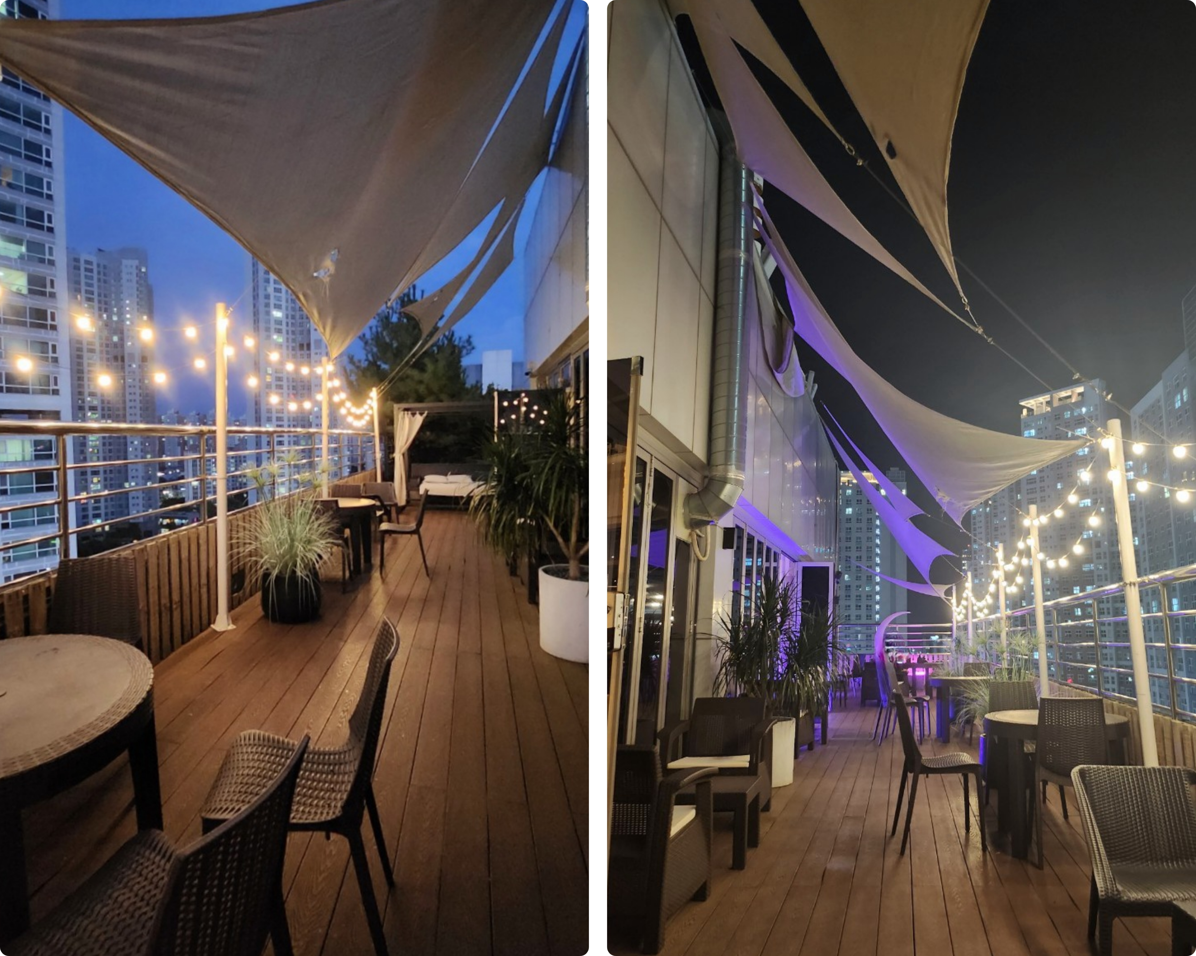 야외 루프탑 테라스는 조명이 켜지는 저녁 시간이 더 멋있다. 카페 조명과 함께 주변 빌딩의 불빛을 함께 즐길 수가 있다.