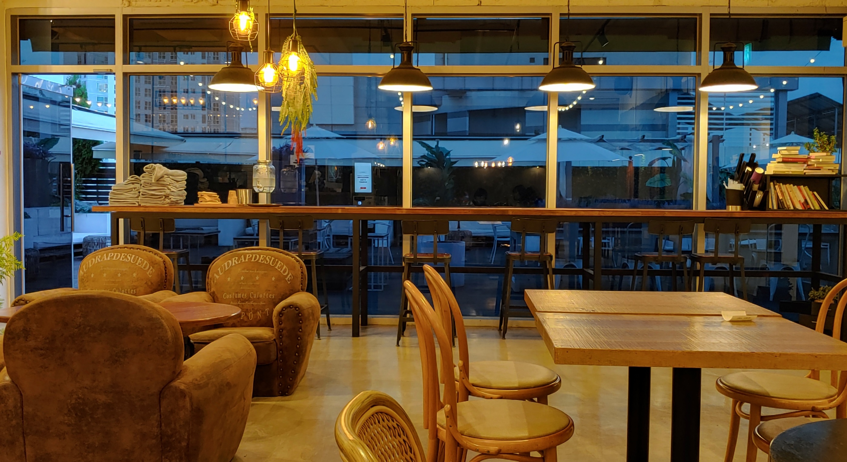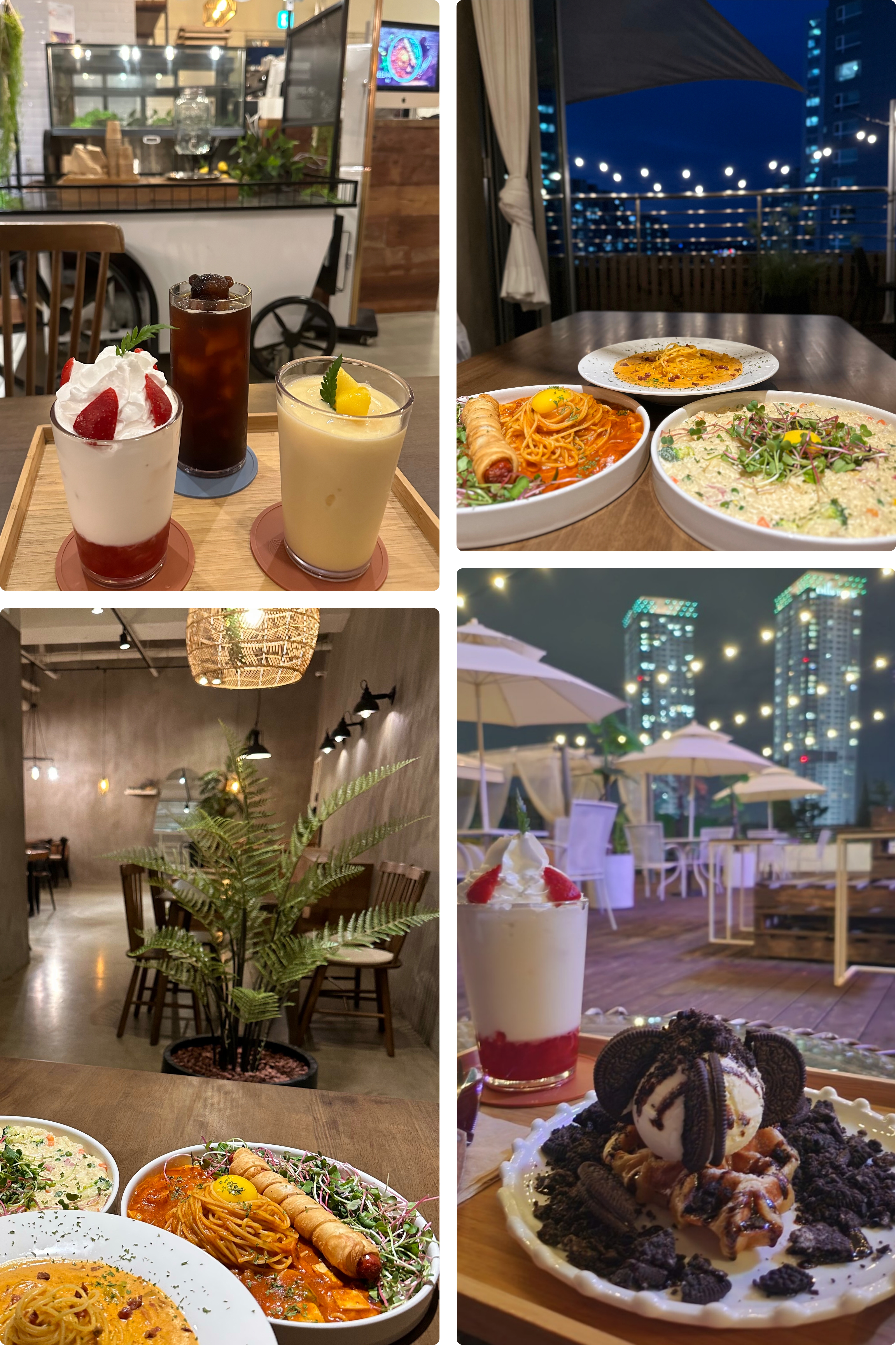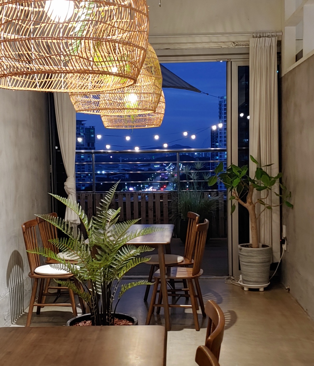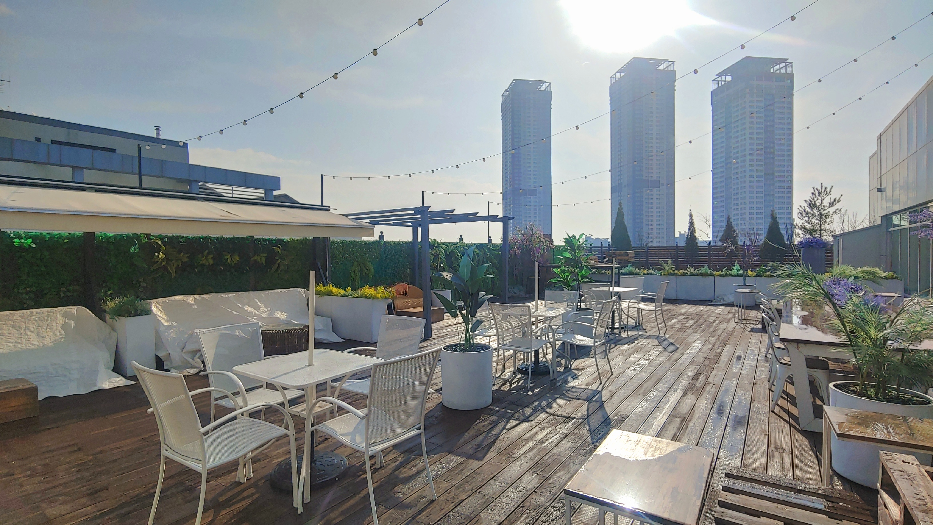 야외 루프탑 테라스는 조명이 켜지는 저녁 시간이 더 멋있다. 카페 조명과 함께 주변 빌딩의 불빛을 함께 즐길 수가 있다.