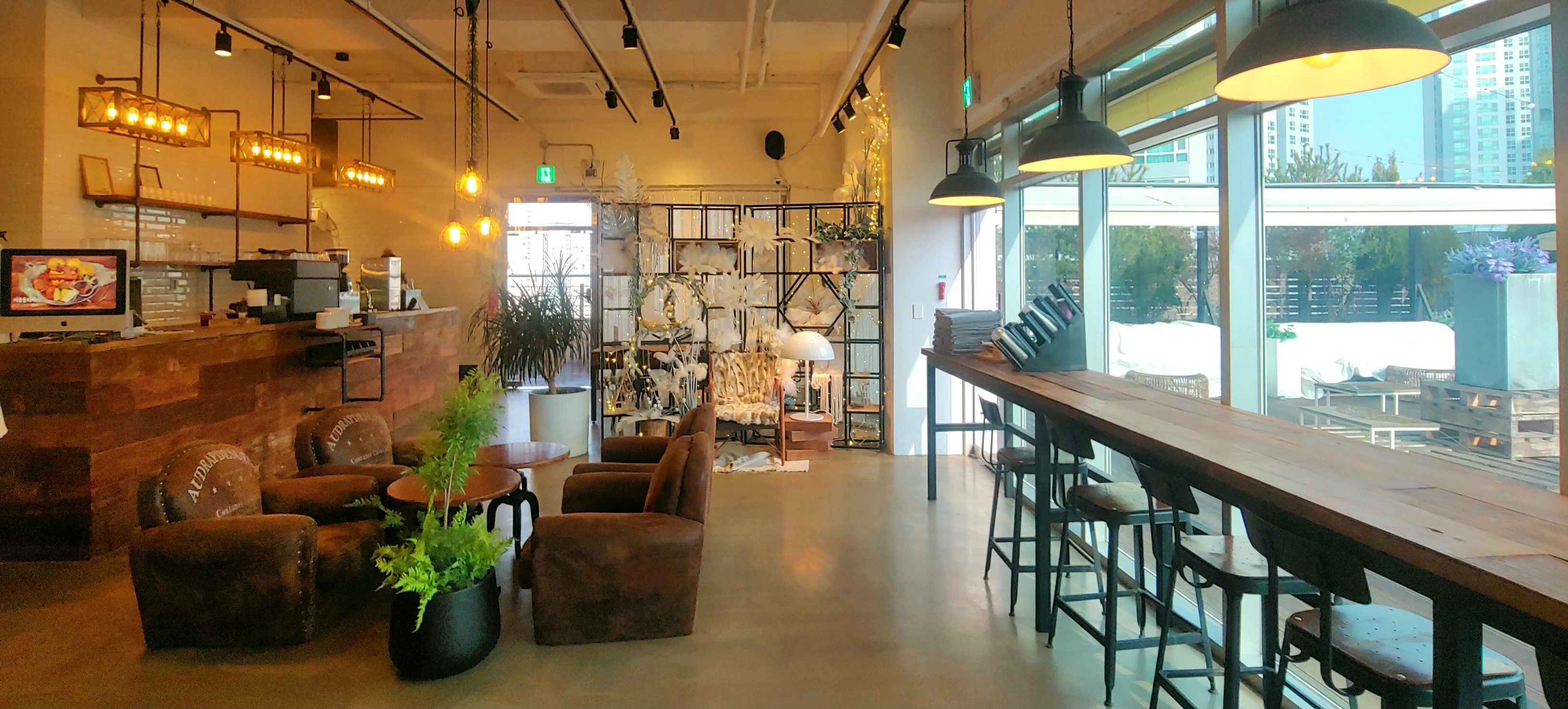 출입문을 들어가면 왼쪽에는 카운터, 오른쪽에는 테라스가 보인다.