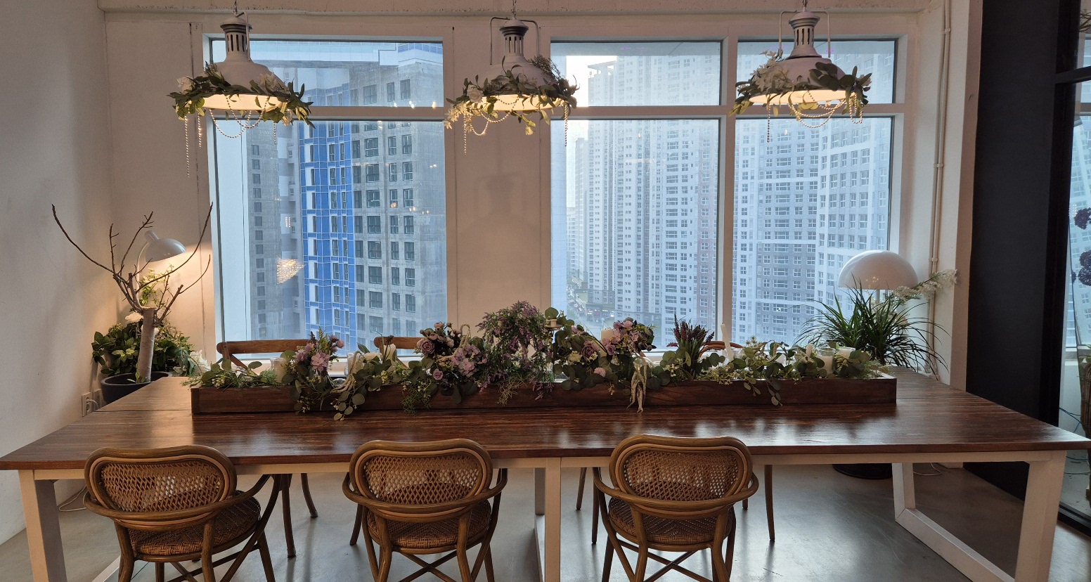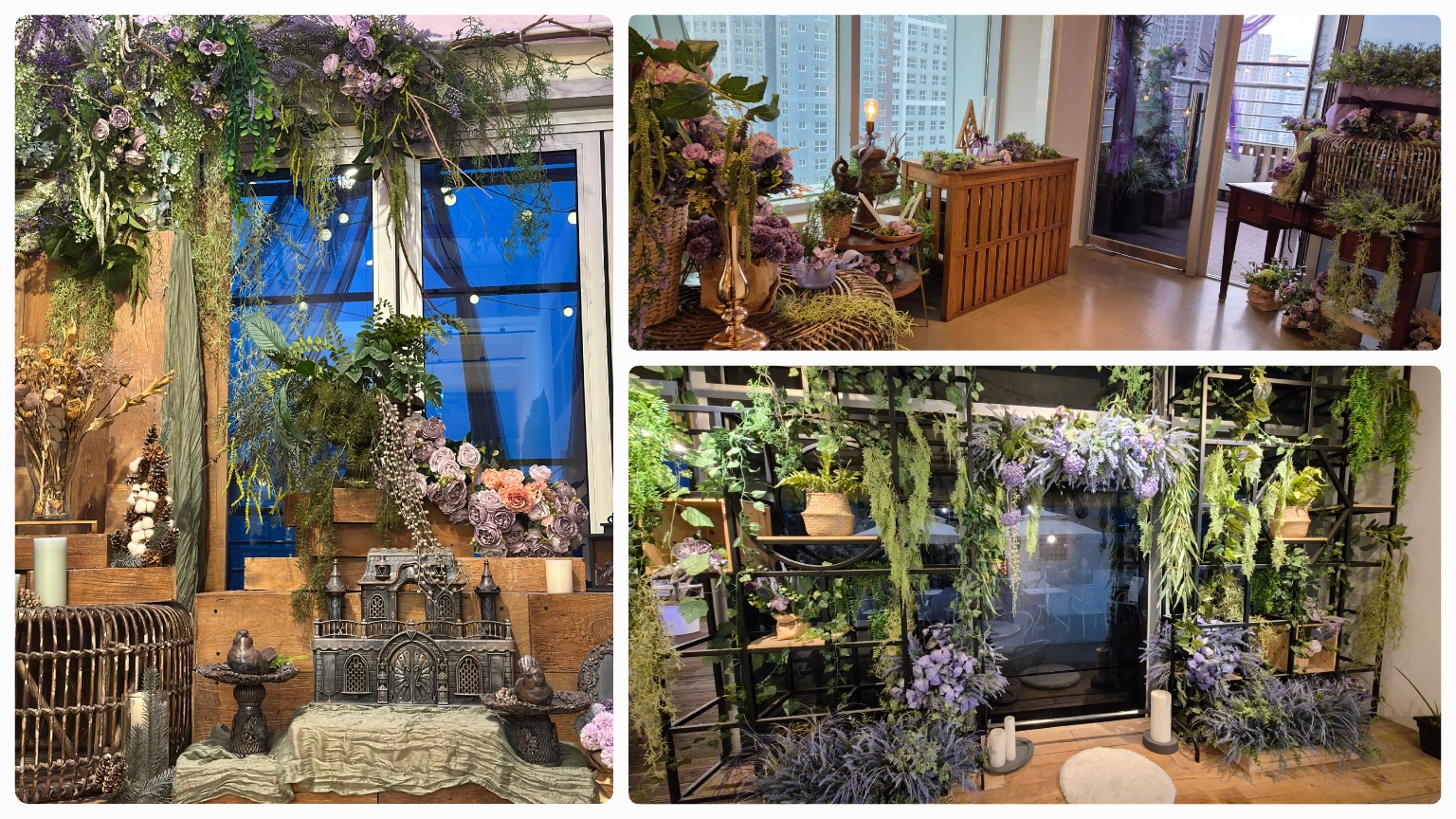 엘리베이터에서 내리면 퍼플패치로 들어가는 복도부터 입구 장식이 되어 있다. 출입문까지 가는 복도 창 밖으로 루프탑 테라스가 보인다.