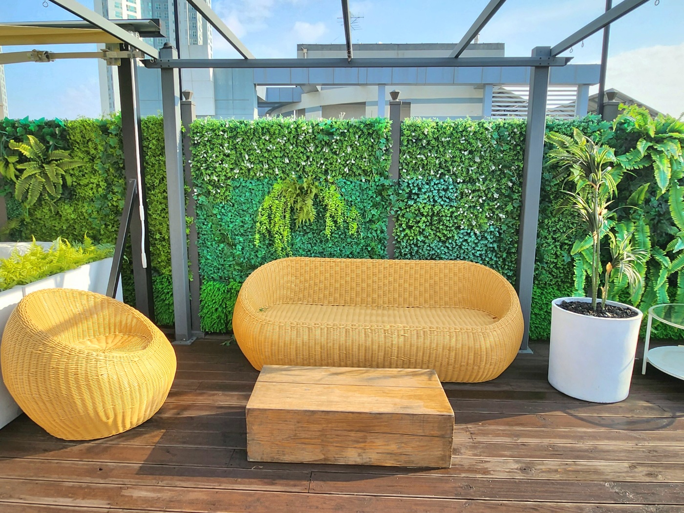 오른쪽에 있는 통창을 통해서는 루프탑 야외 테라스가 보인다.