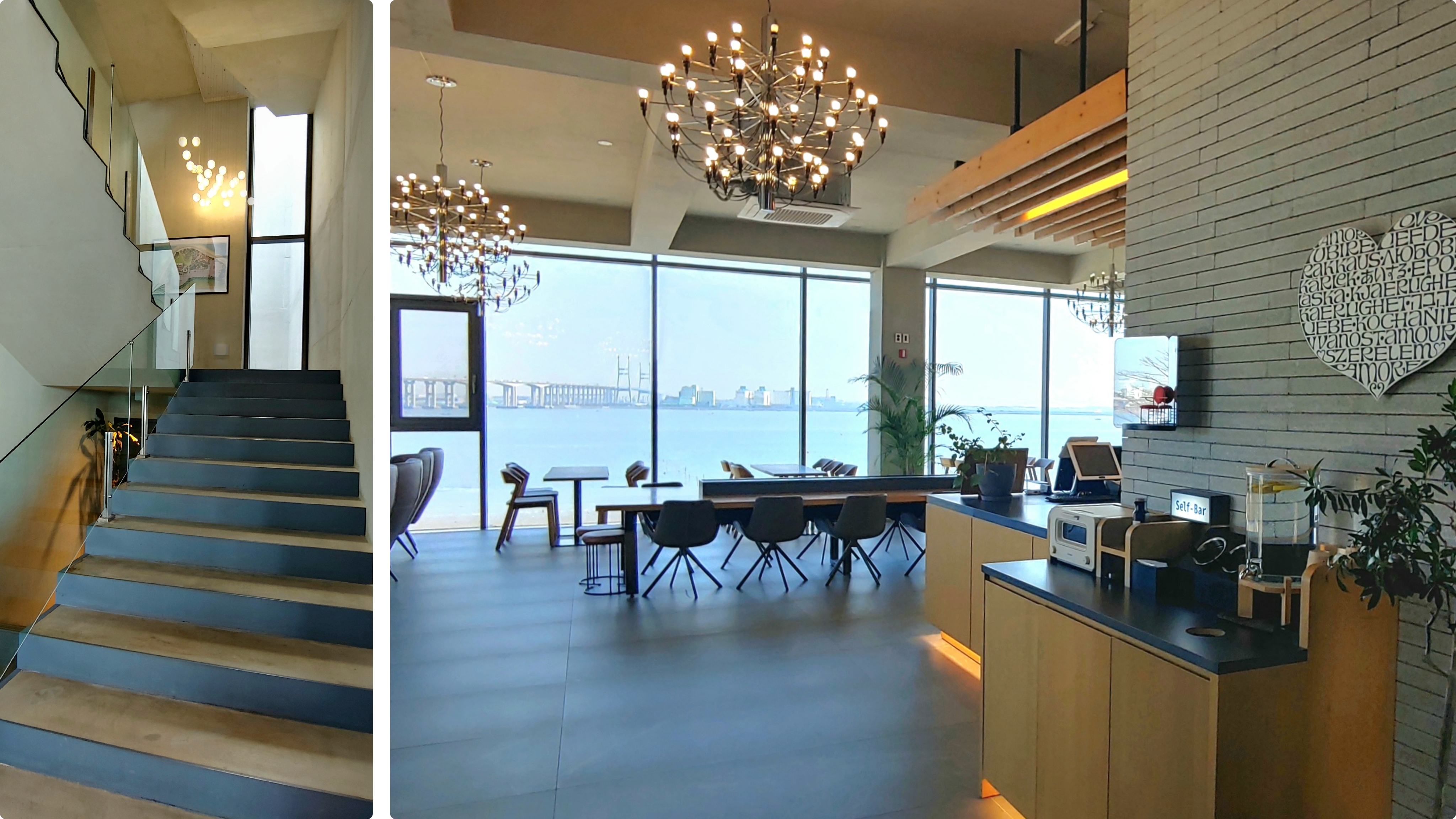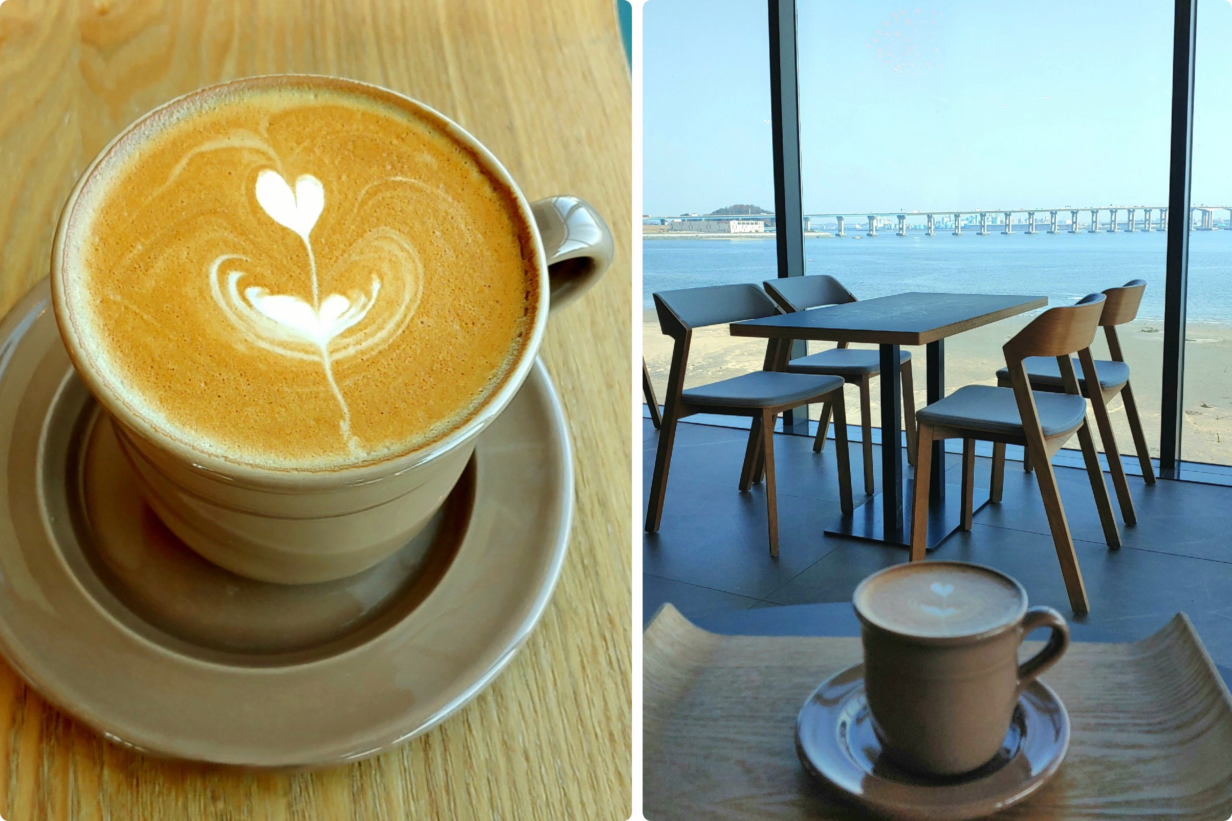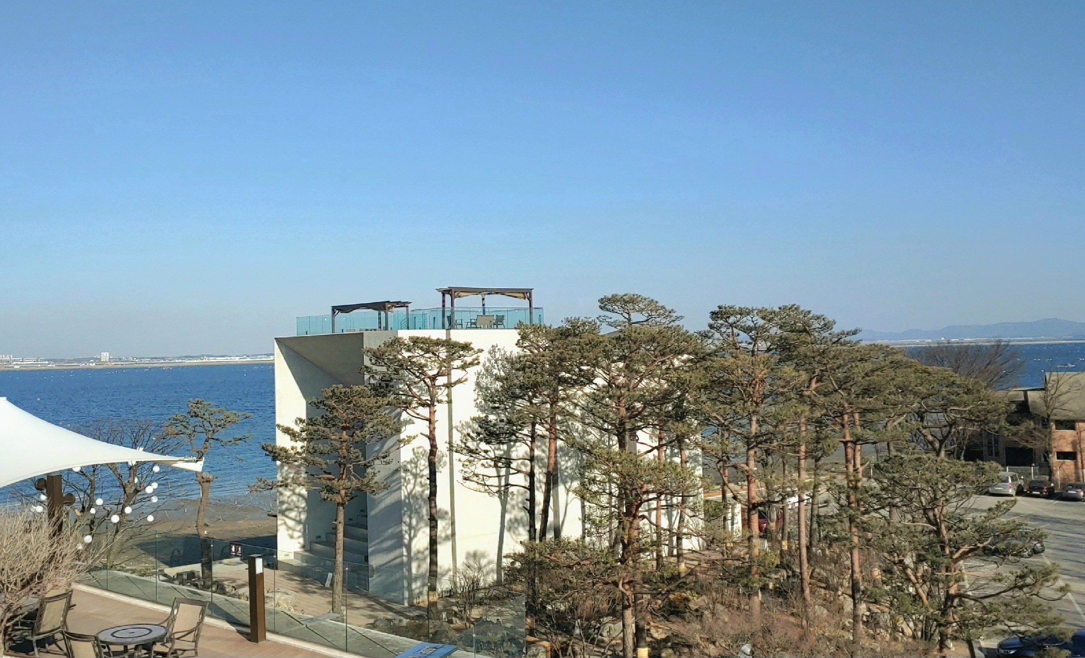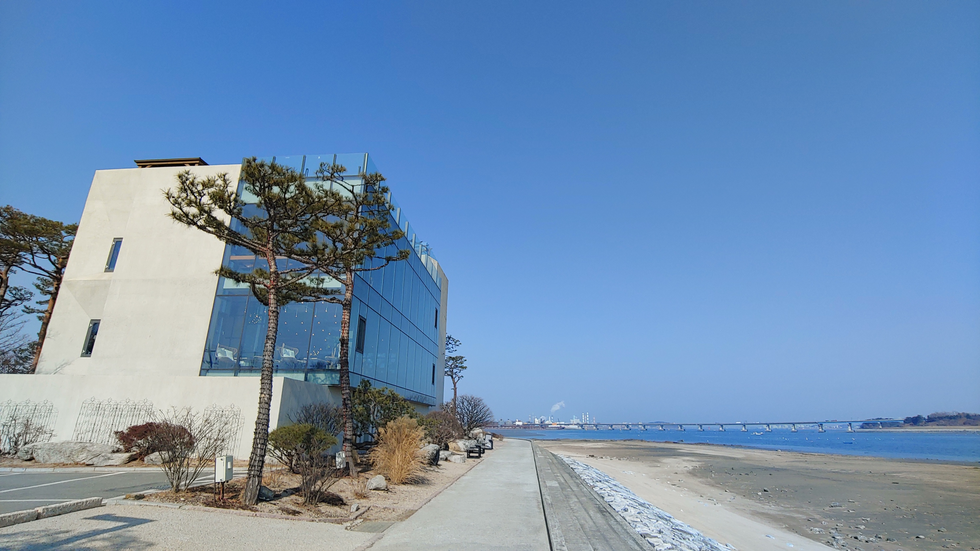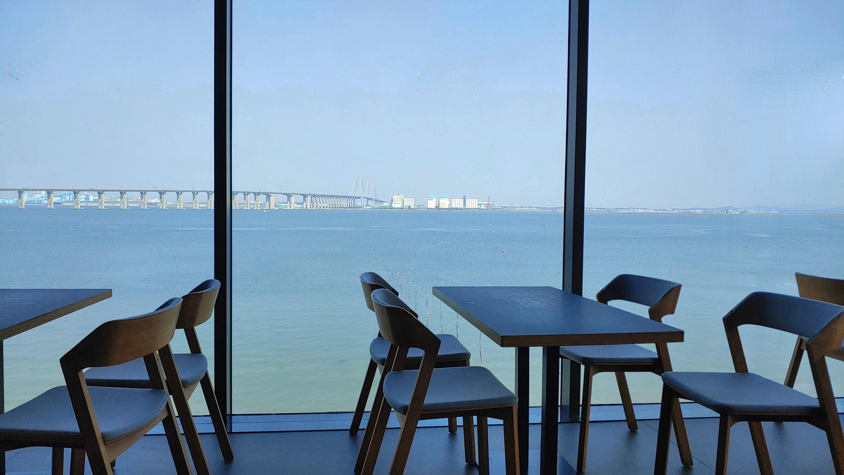 2.5면이 통창으로 되어있다. 앞에는 산책로가 있고 썰물에는 뻘이 넓게 펼쳐진다. 서해 바다를 가까이서 보고 싶으면 밀물 때를 맞춰야 한다.