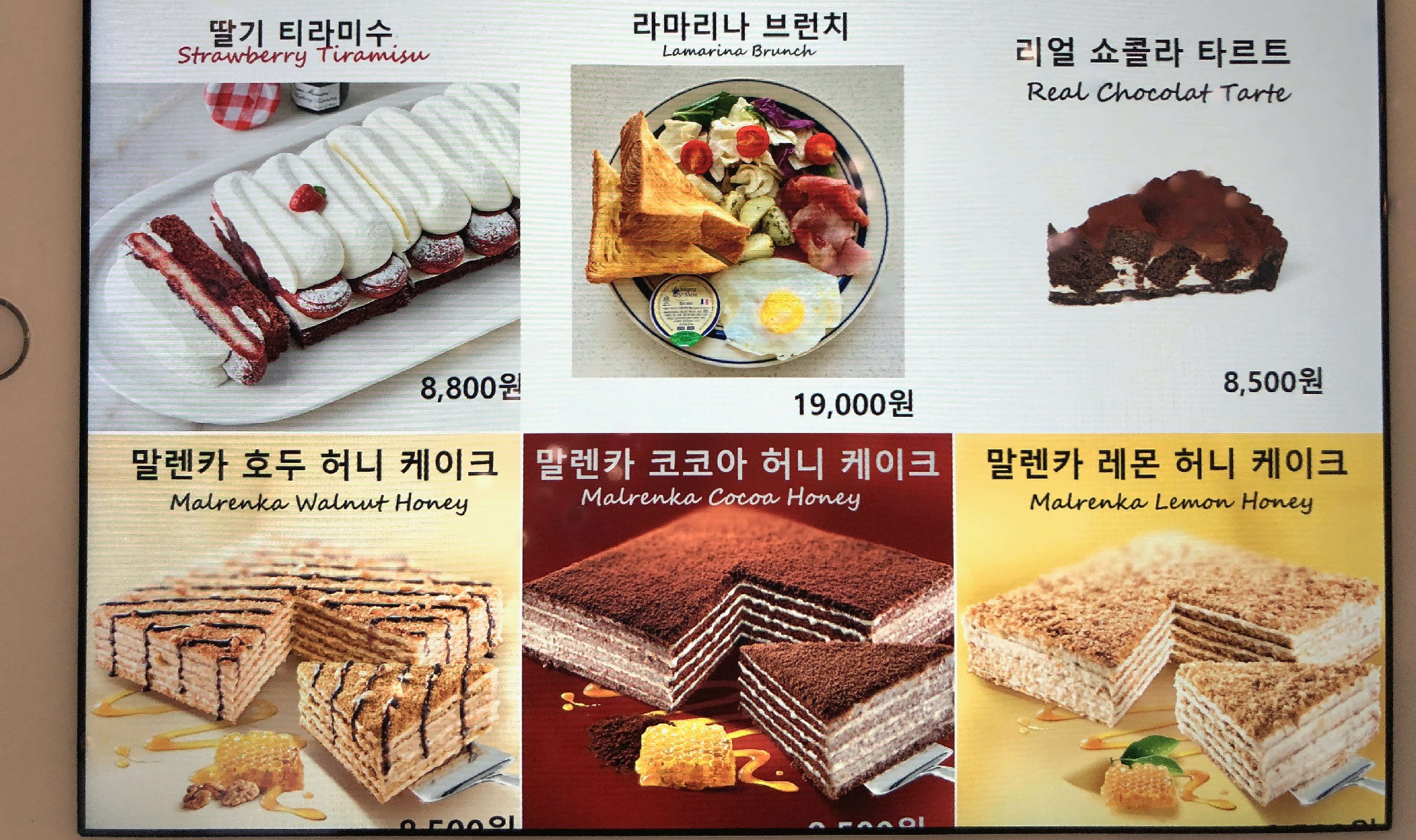 카운터 옆에는 유리병에 담긴 사탕이 있다. 카페에서는 커피와 함께 간단한 케이크 종류나 브런치를 판매한다. 브런치 메뉴이나 저녁시간에도 주문이 가능하다.