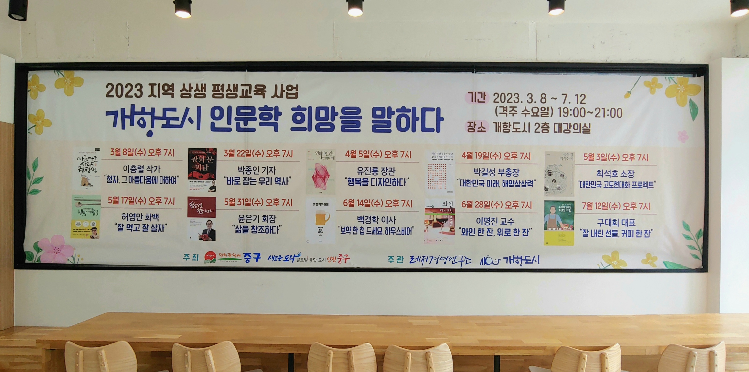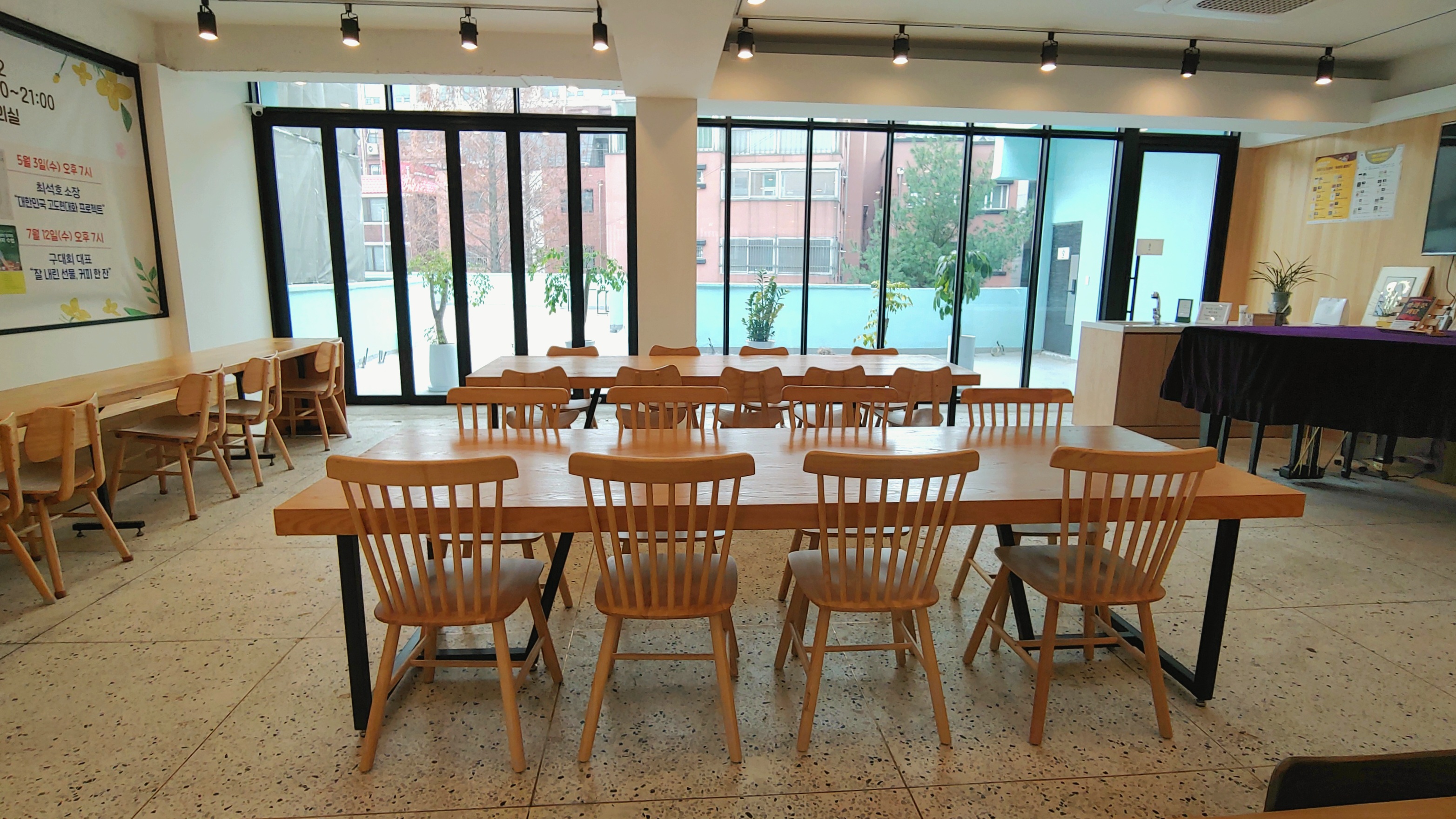 2층으로 올라가는 계단에도 책이 진열되어 있다. 2층은 강의장 형태의 단체용 테이블이 있다. 뒤편에는 진행 중인 강의 안내문이 붙어 있다.