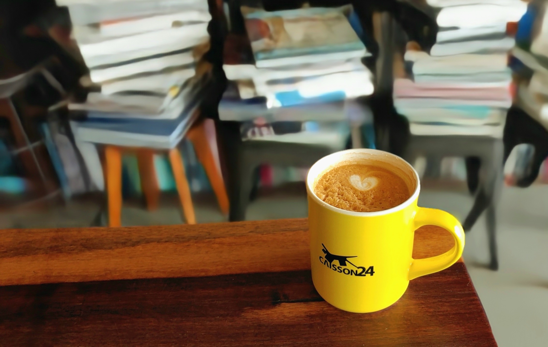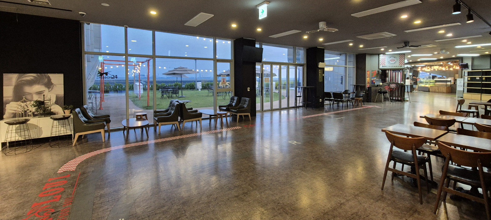 케이슨24는 2개의 건물이 이어져 있다. 각각의 건물은 실내 2층과 루프탑이 있다. 건물과 바다 사이 야외에도 다양한 형태의 테이블들이 있다.