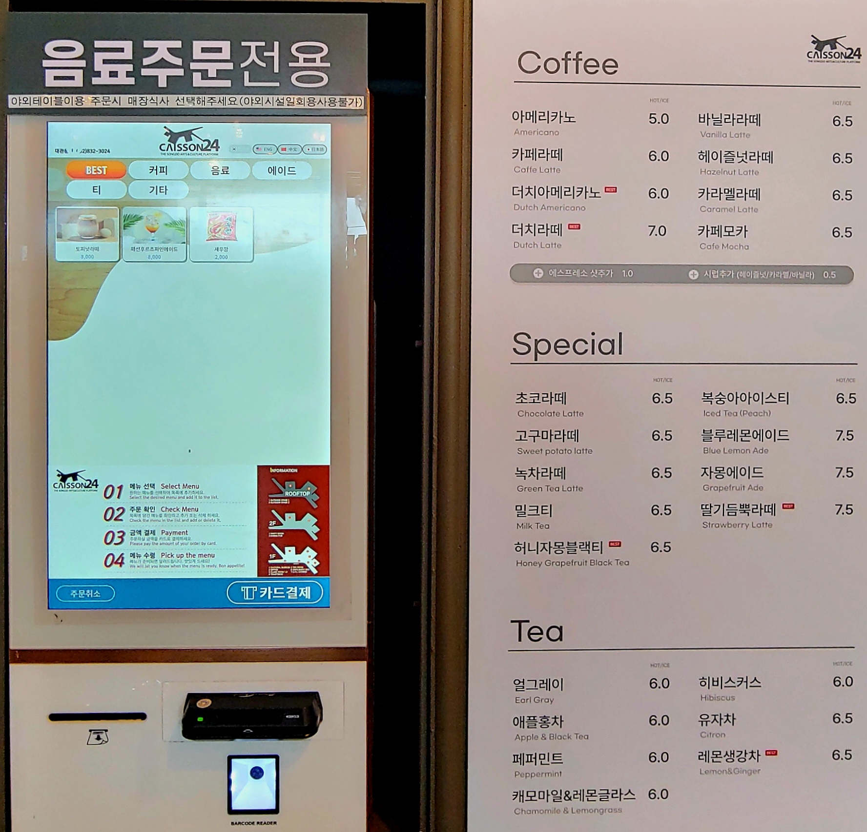 주문은 키오스크로 한다. 지난 3월 방문때와 가격은 동일하다. 교외의 오션뷰 카페 수준으로 높다.