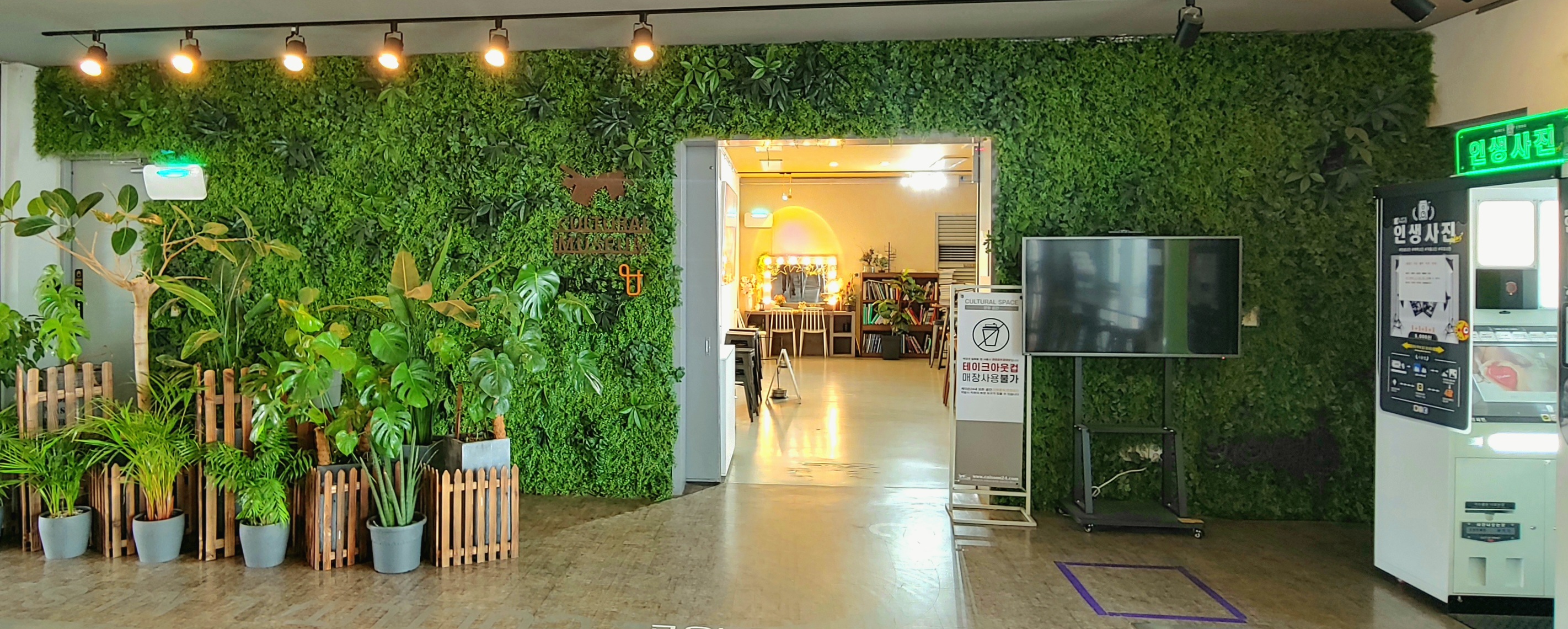 초록색 덩굴로 장식된 벽을 지나가면 다양한 형태의 좌석이 있는 공간이 나온다. 소파가 있는 서재와 같은 공간이, 콘센트가 설치된 대형 테이블, 폴딩도어 앞에 바다를 향한 좌석 등이 있다.