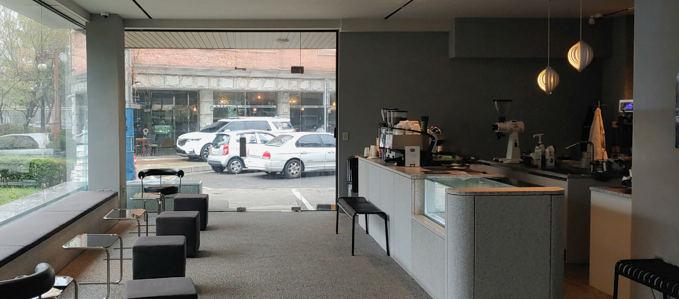 안쪽 통창을 향해서는 밖을 향한 소파가 있다. 카운터 맞은편과 안쪽은 벤치형 자리이다.