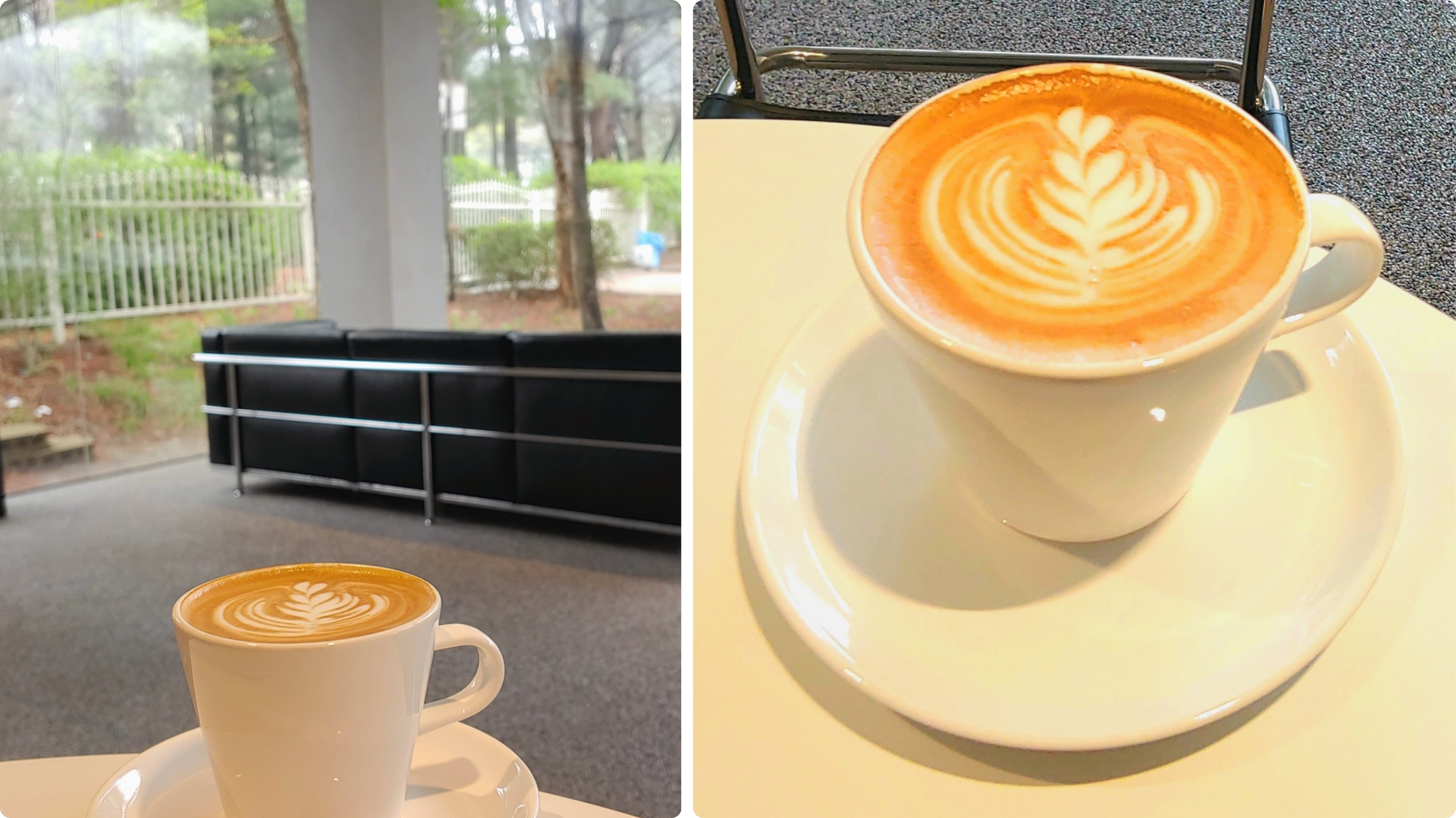 까치울역 카페거리 중에서도 리세스커피는 녹지로 둘러싸여 있다. 카페 3면이 통창으로 되어 있어서 초록초록한 뷰를 즐기기 좋다.