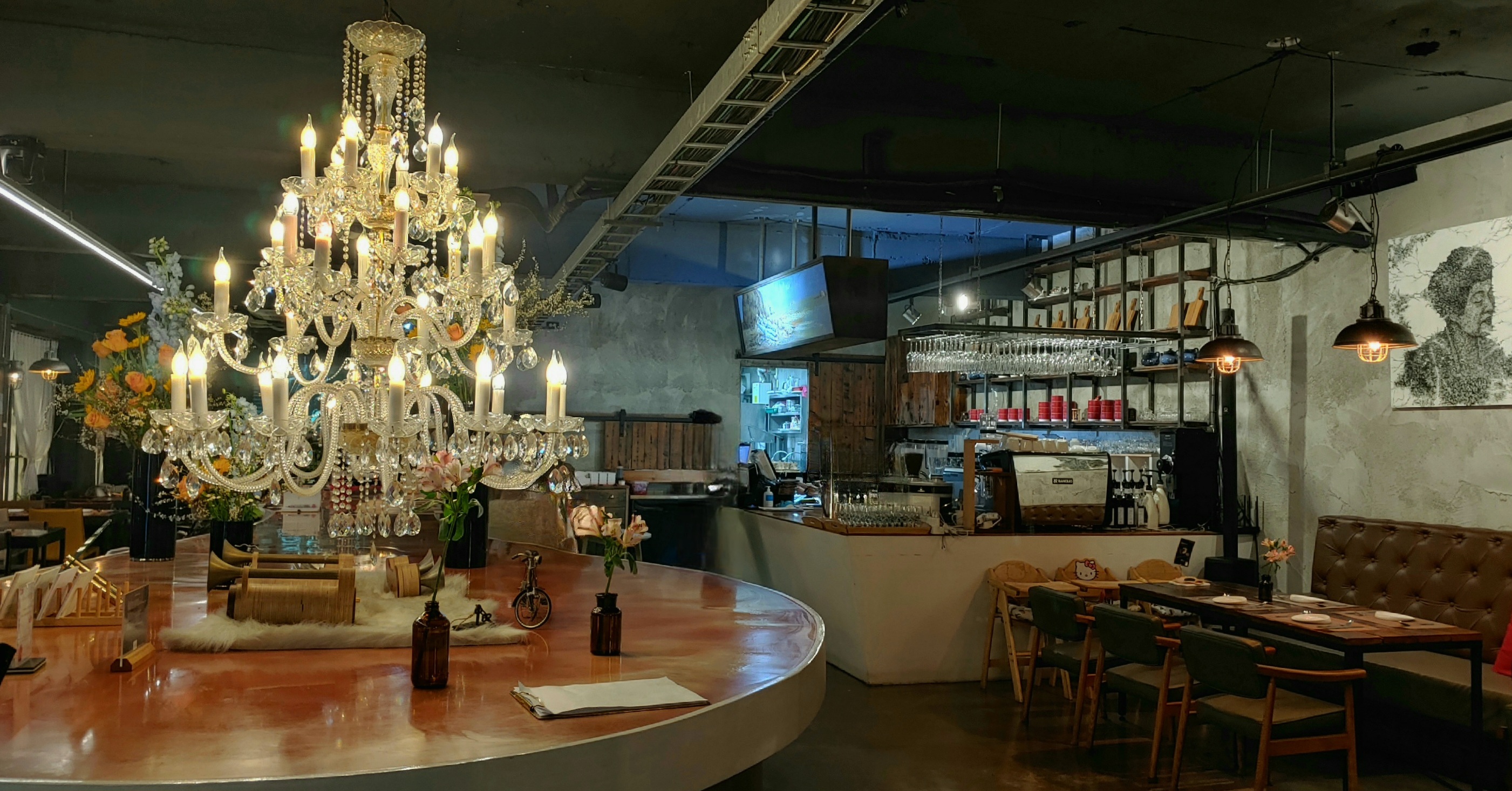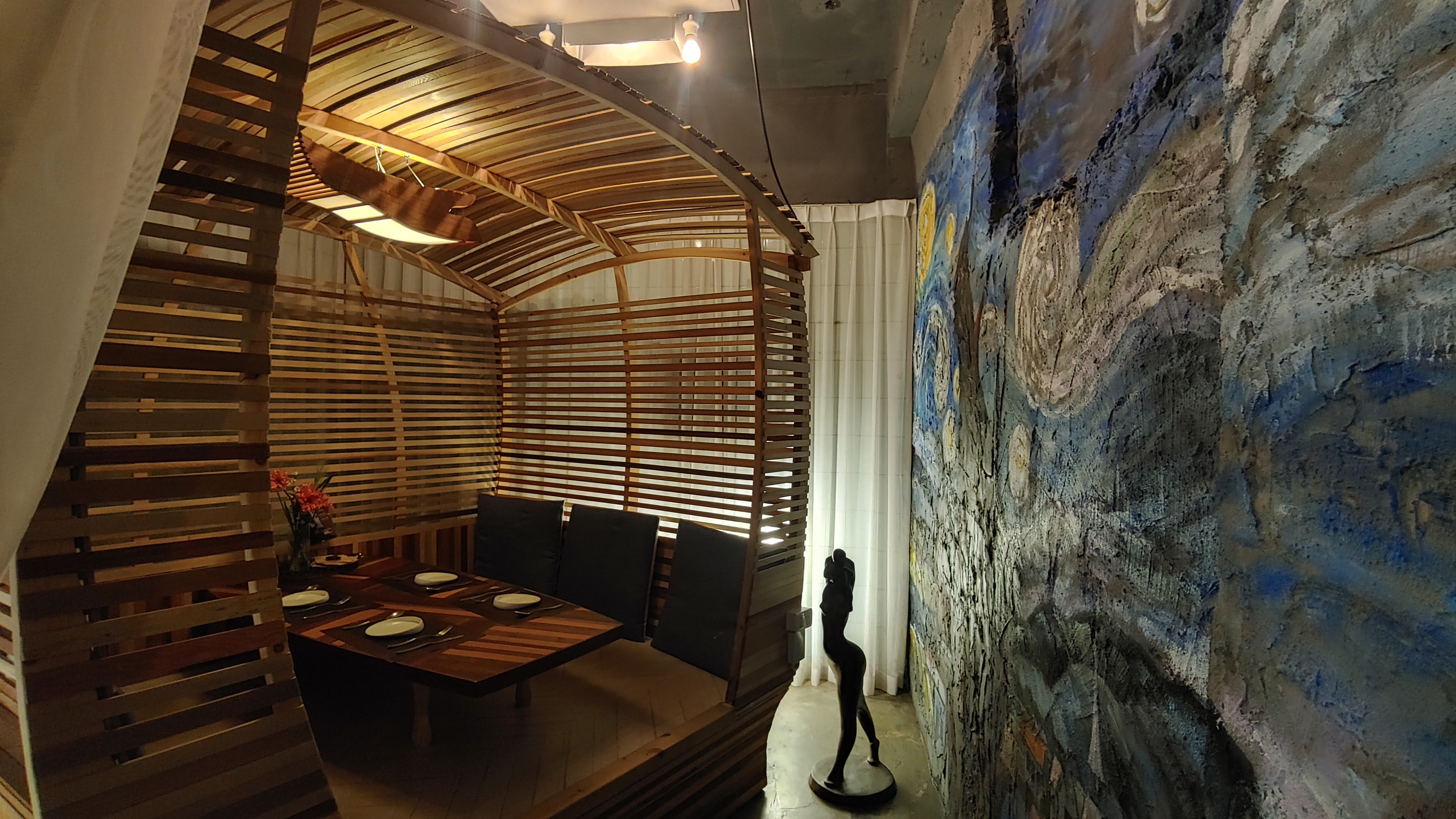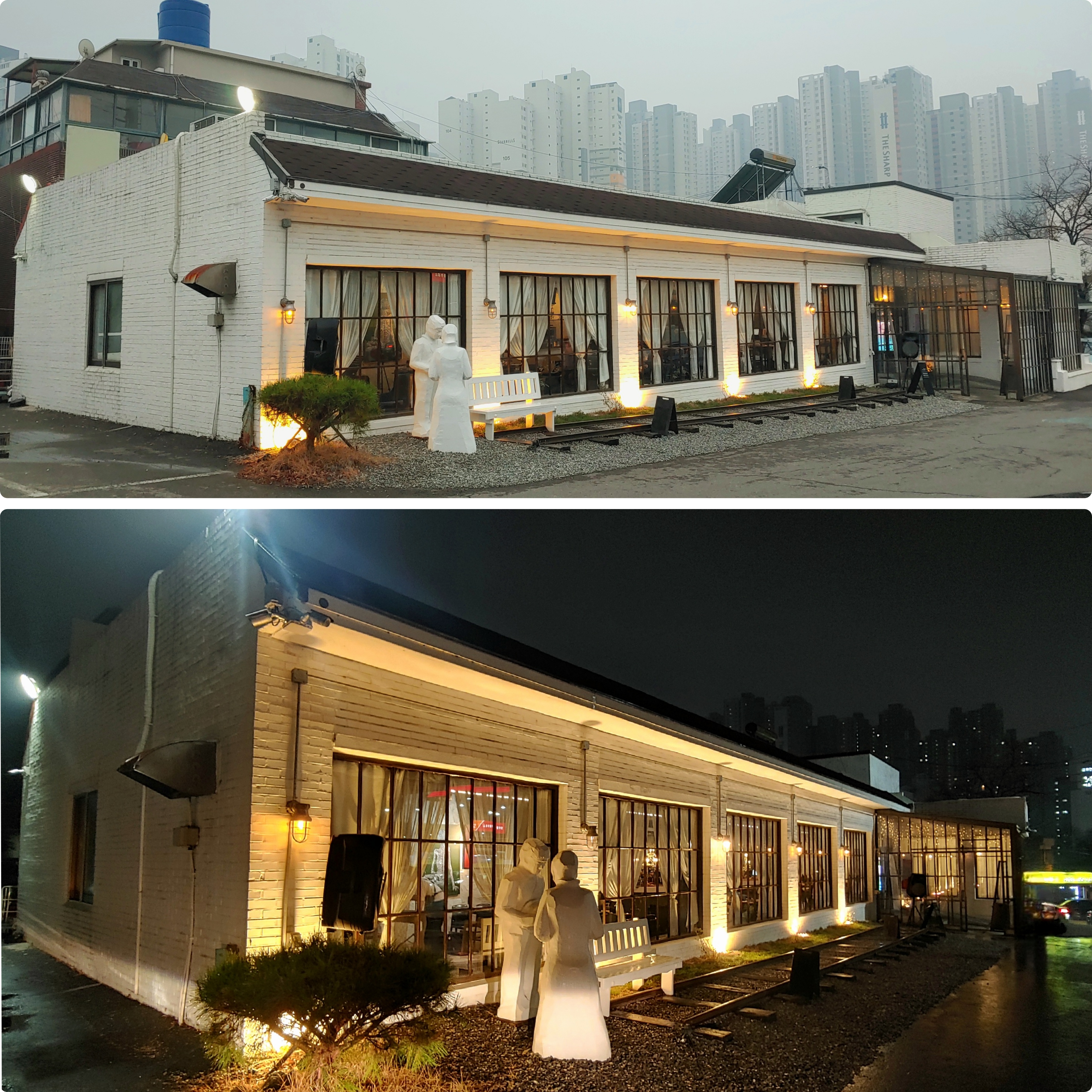 주차장에서 보이는 건물의 오른쪽 부분 유리 구조물이 출입구이다. 출입구를 들어가면 샹들리에가 낮게 내려와 있는 라운드 테이블이 가운데에 있다. 라운드 테이블 뒤에 카운터가 있다.