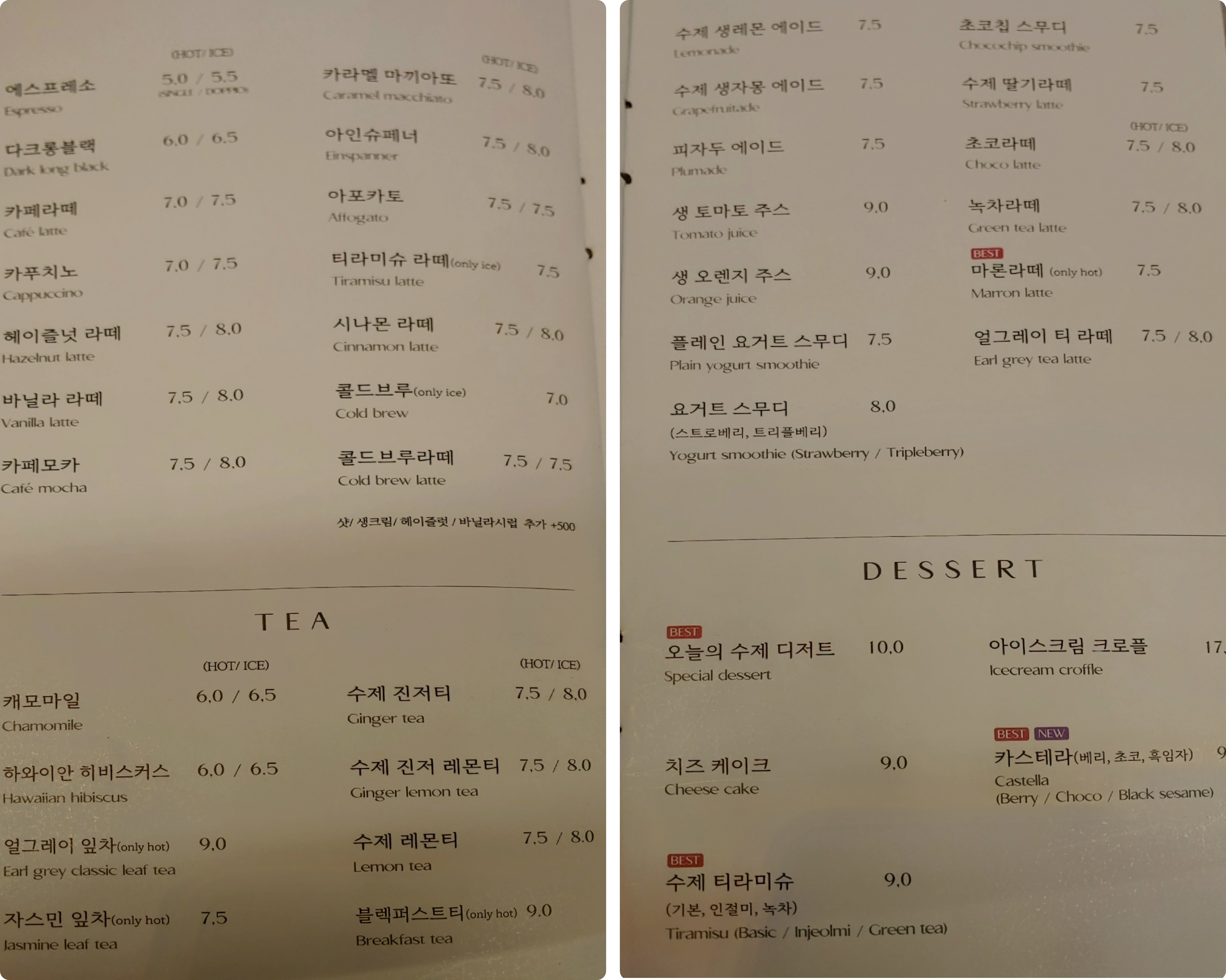 음료를 비롯하여 파스타, 스테이크, 피자, 와인 등 다양한 식사 메뉴를 주문 가능하다. 식사 메뉴를 시키면 커피나 녹차가 후식으로 나온다.