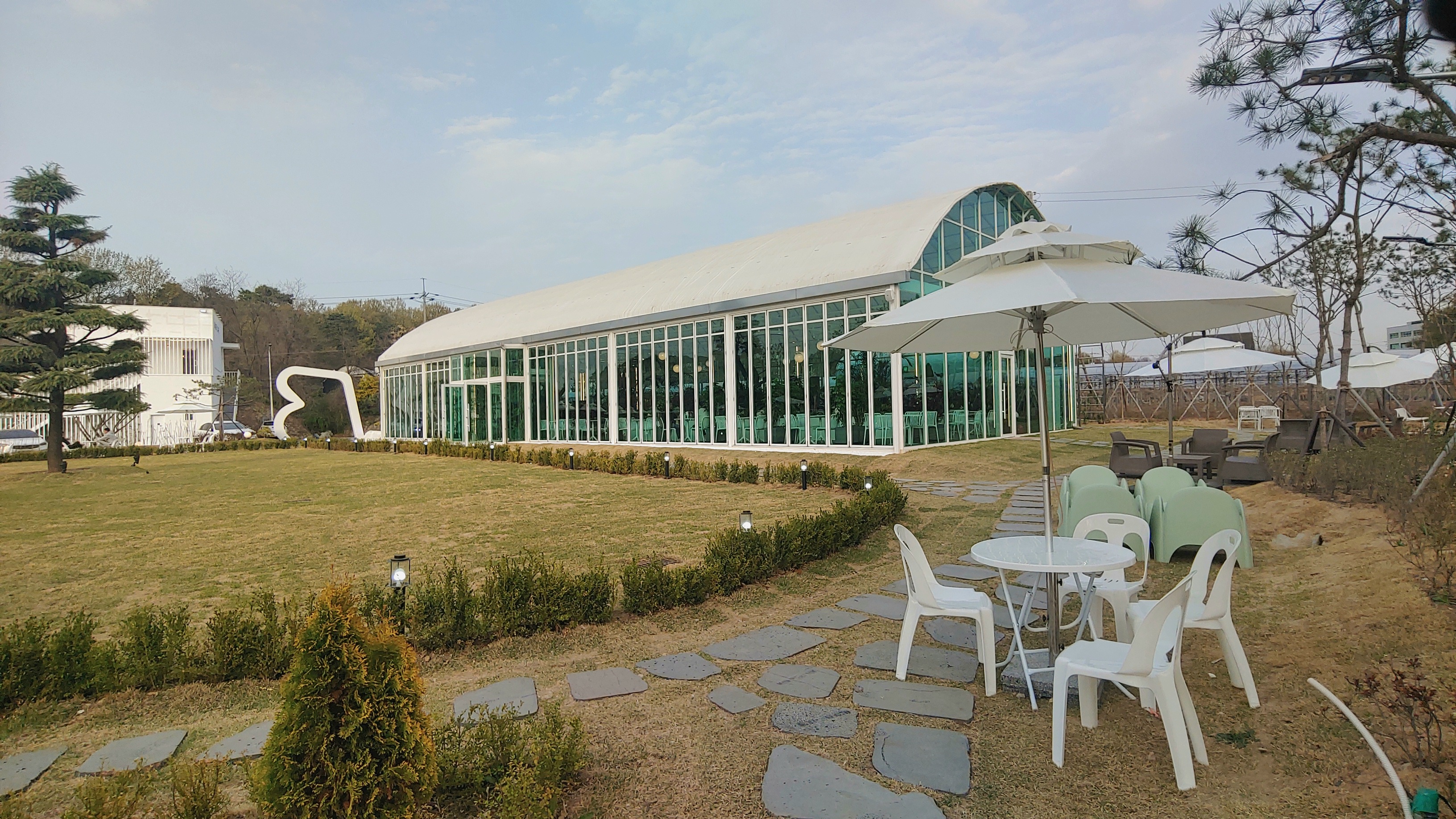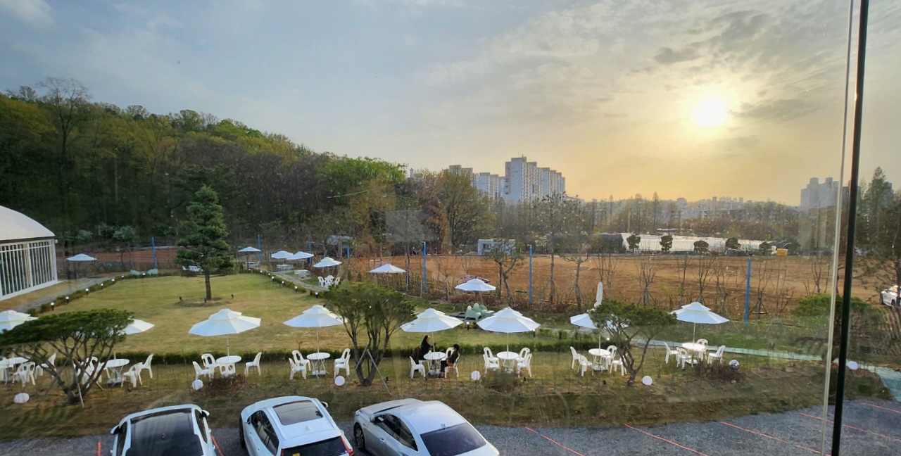 1층 잔디밭 둘레로 테이블이 있다. 날씨가 좋은 날 야외에서 커피를 즐길 수 있다.