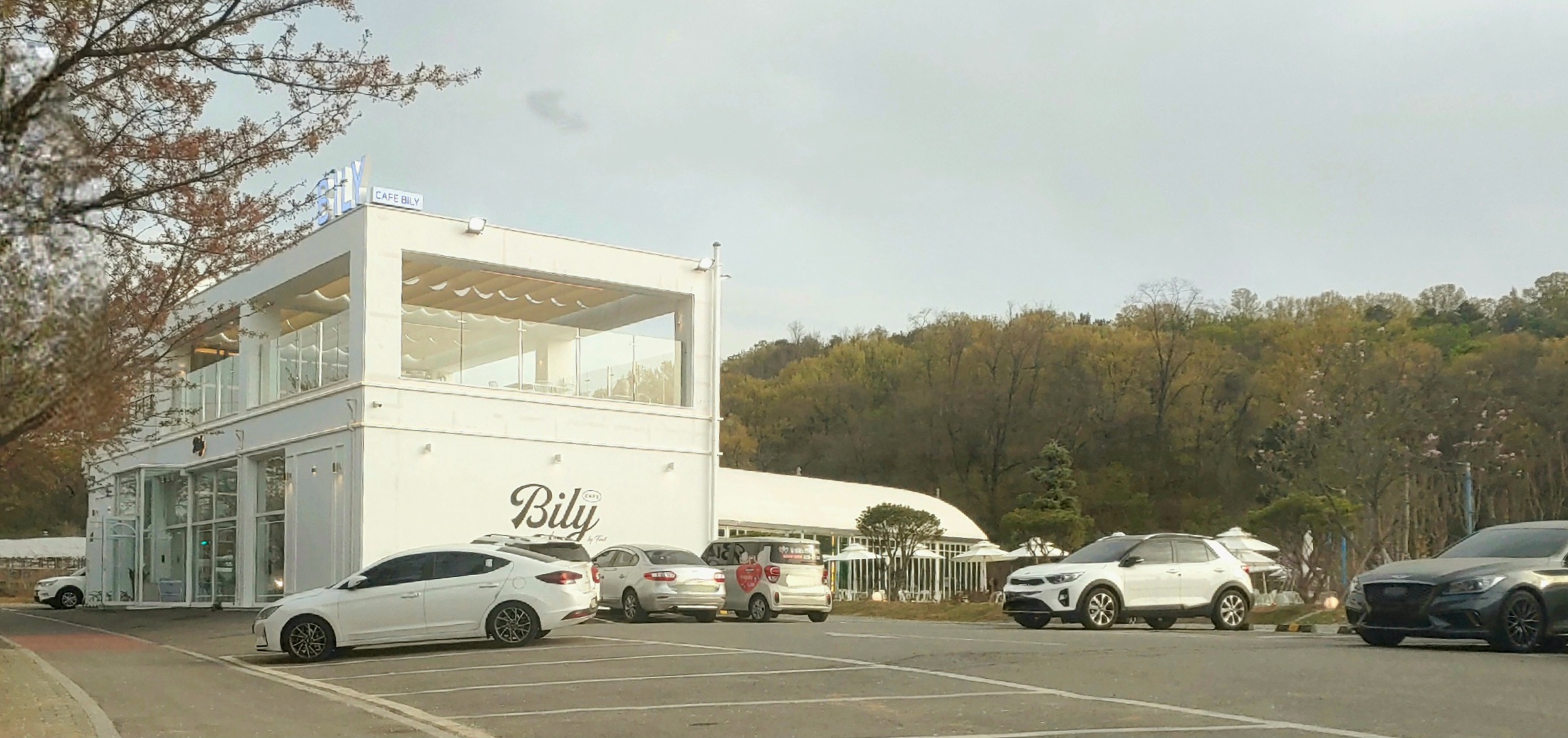 빌리는 인천대공원에서 차량으로 10분 내외의 거리에 있다. 카페 건물 3면을 둘러싼 넓은 주차장이 있다.