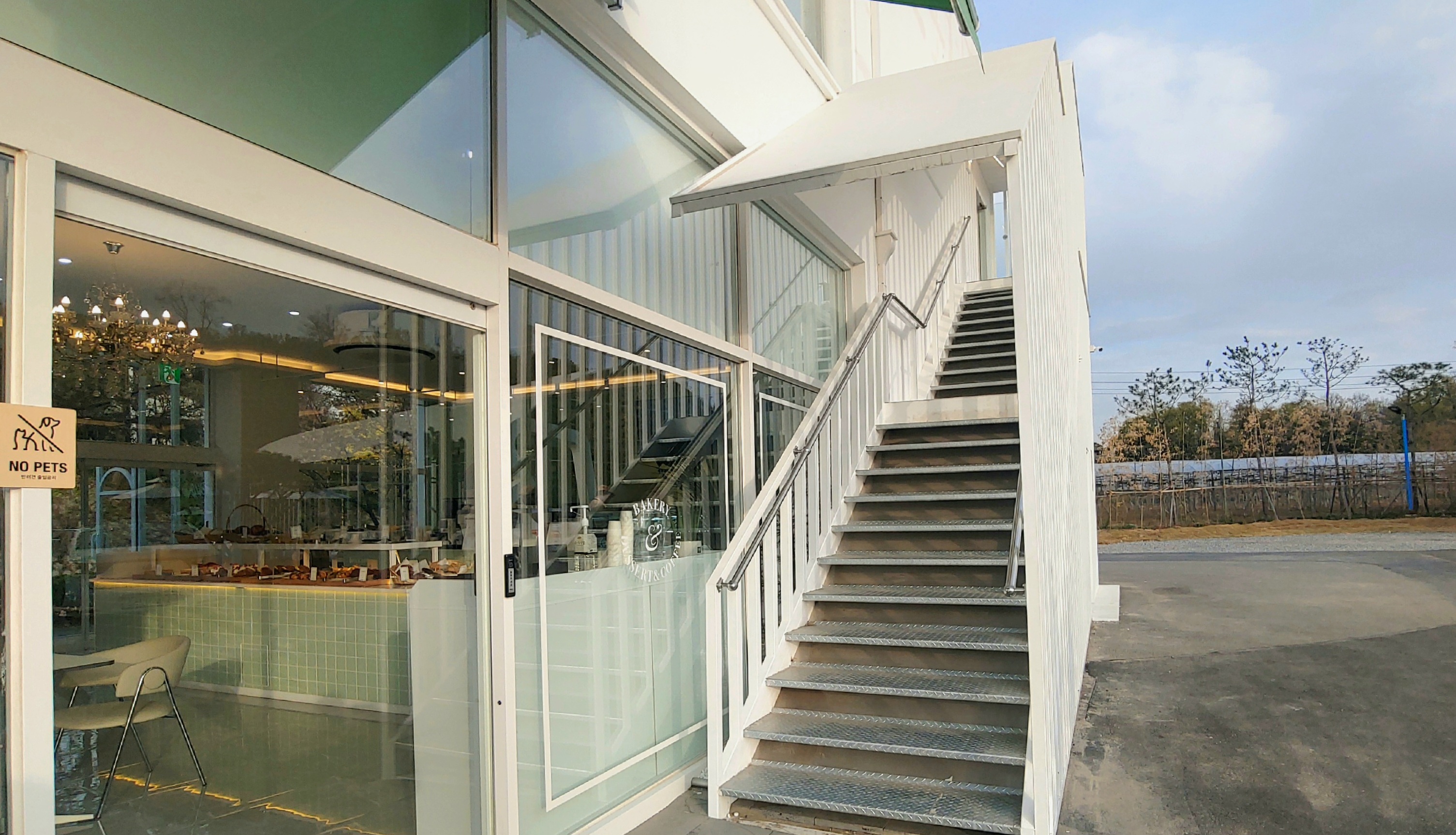 2층으로 올라가는 계단은 1층 입구 바깥쪽에 있다. 2층은 실내와 실외 발코니 공간으로 구성되어 있으며 1층보다 자리가 더 많다.