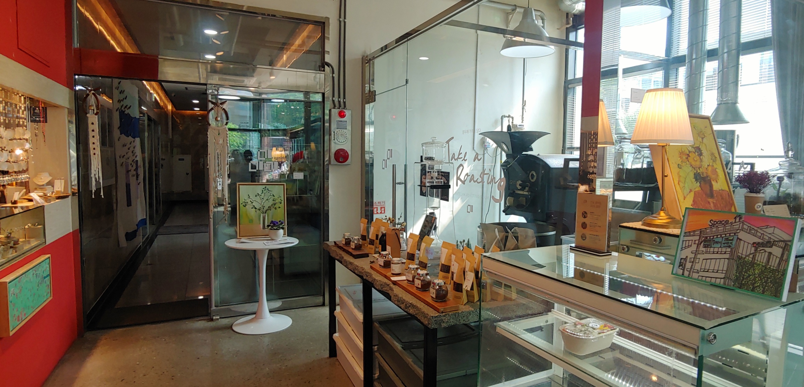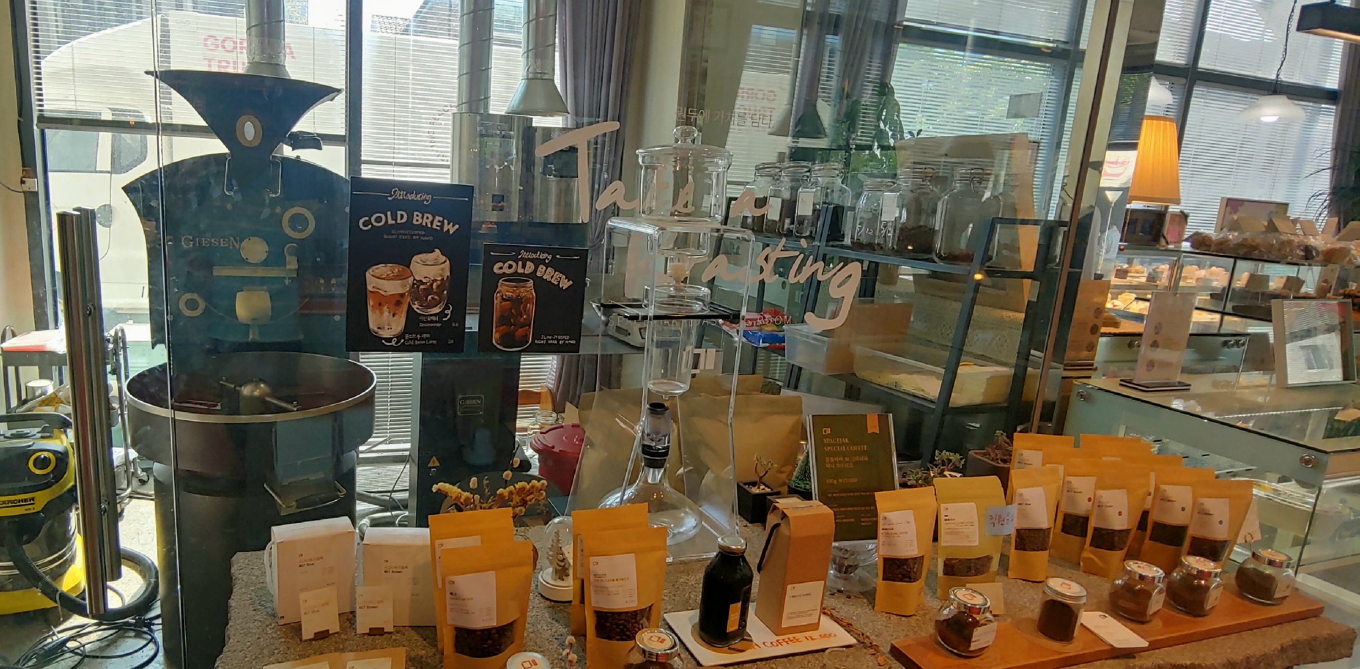 빵 진열대 뒤 쪽으로는 1층 주차장에서 들어오는 출입구가 있다. 그 압에는 커피를 로스팅하는 룸이 있다.