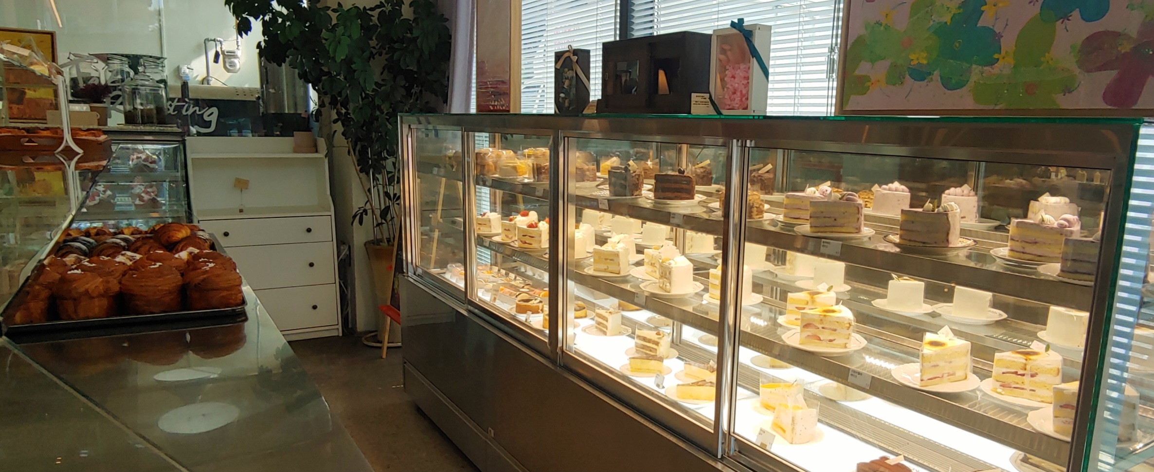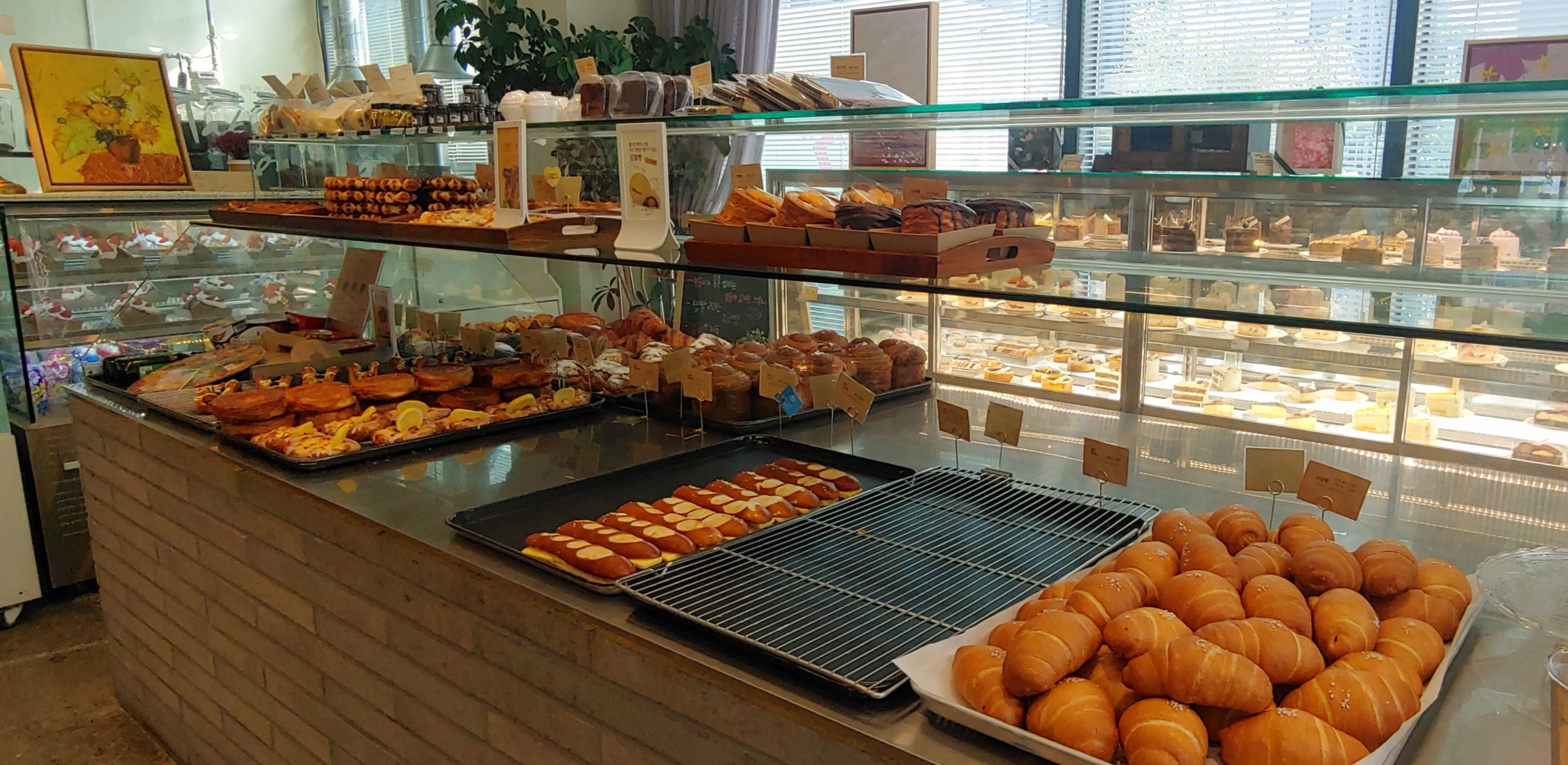 입구 앞쪽에는 빵 진열대와 케이크 진열대가 있다.