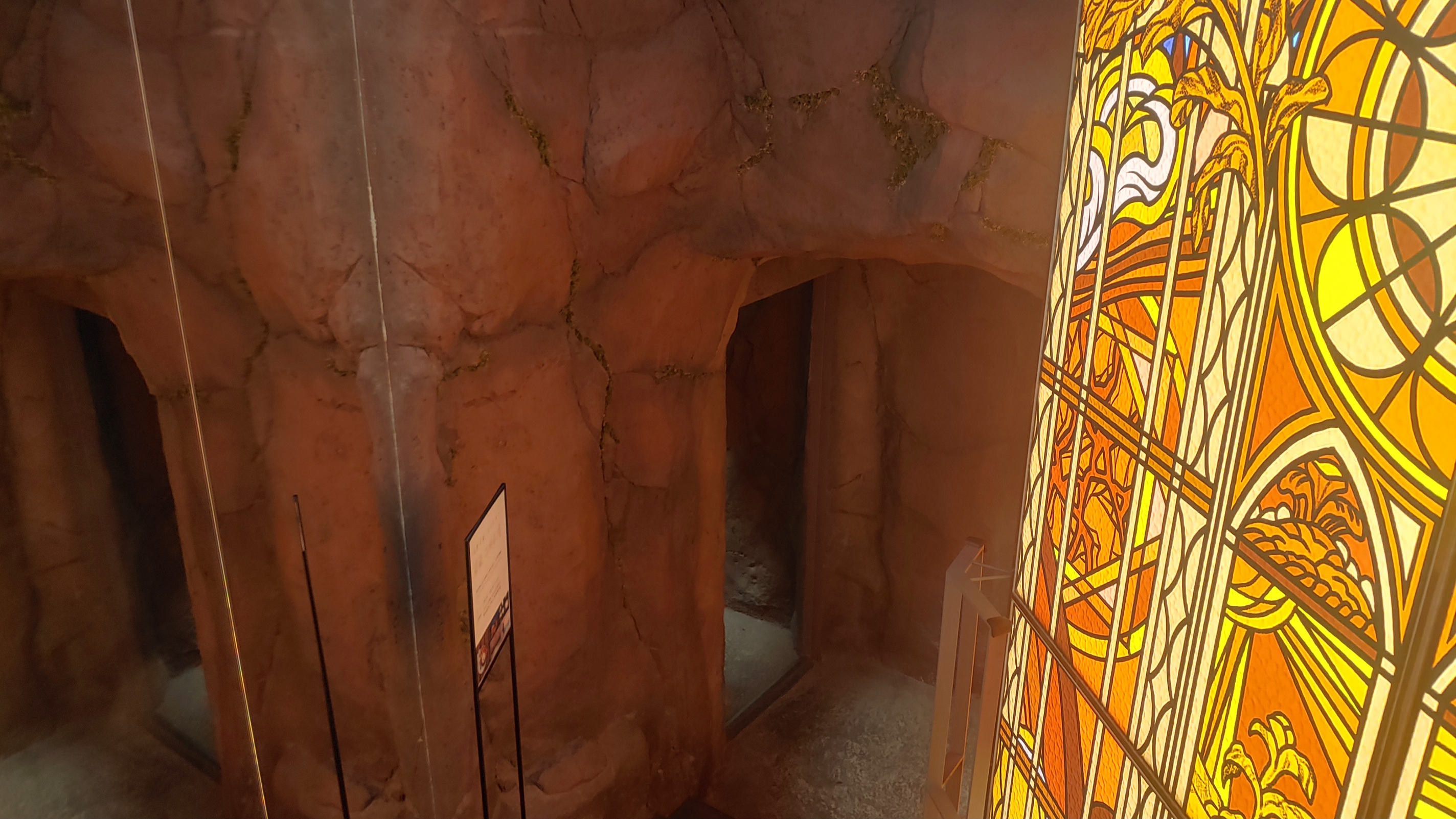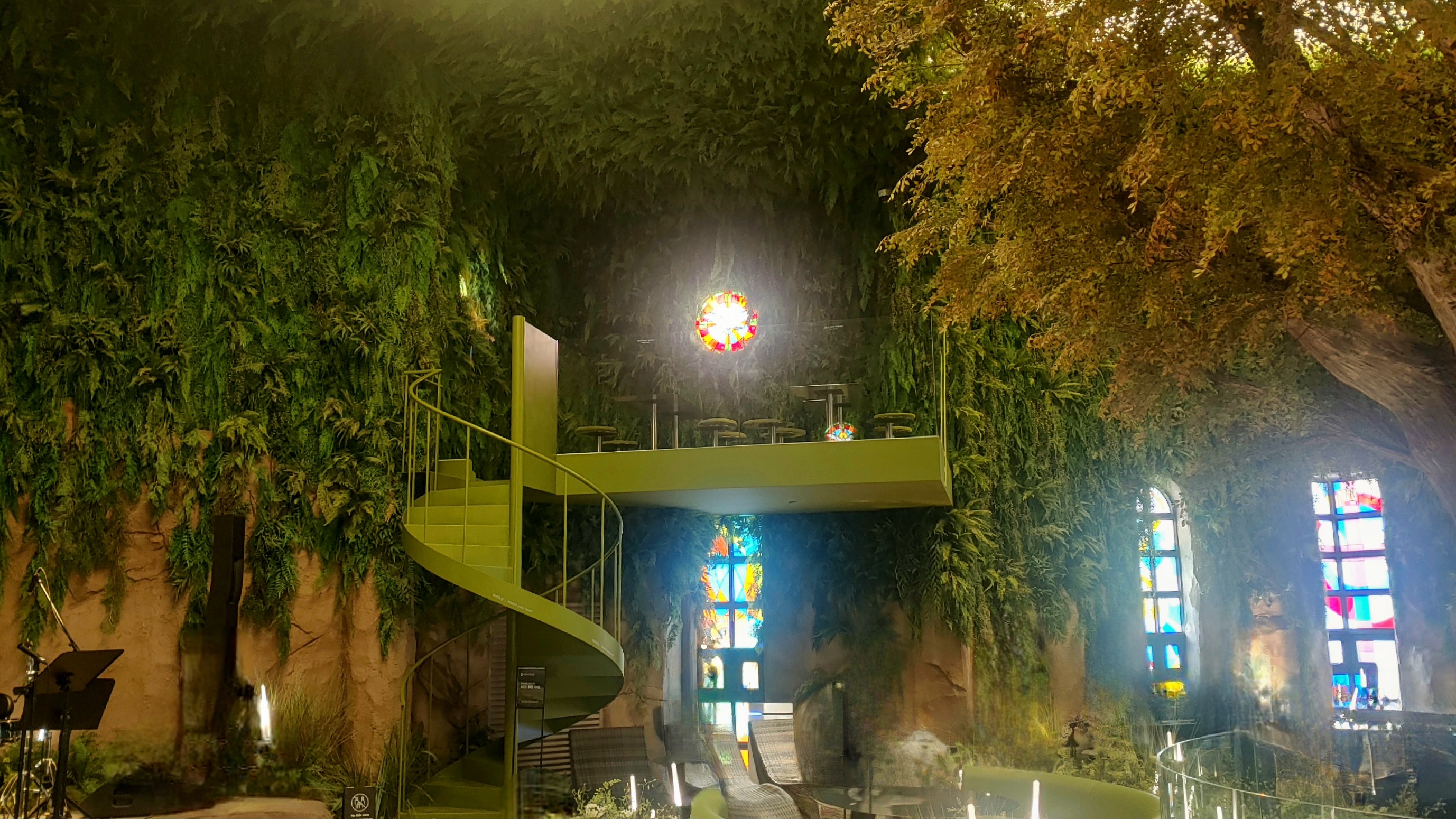 벽 쪽에 설치된 3층 높이의 발코니 공간으로 올라갈 수도 있다.