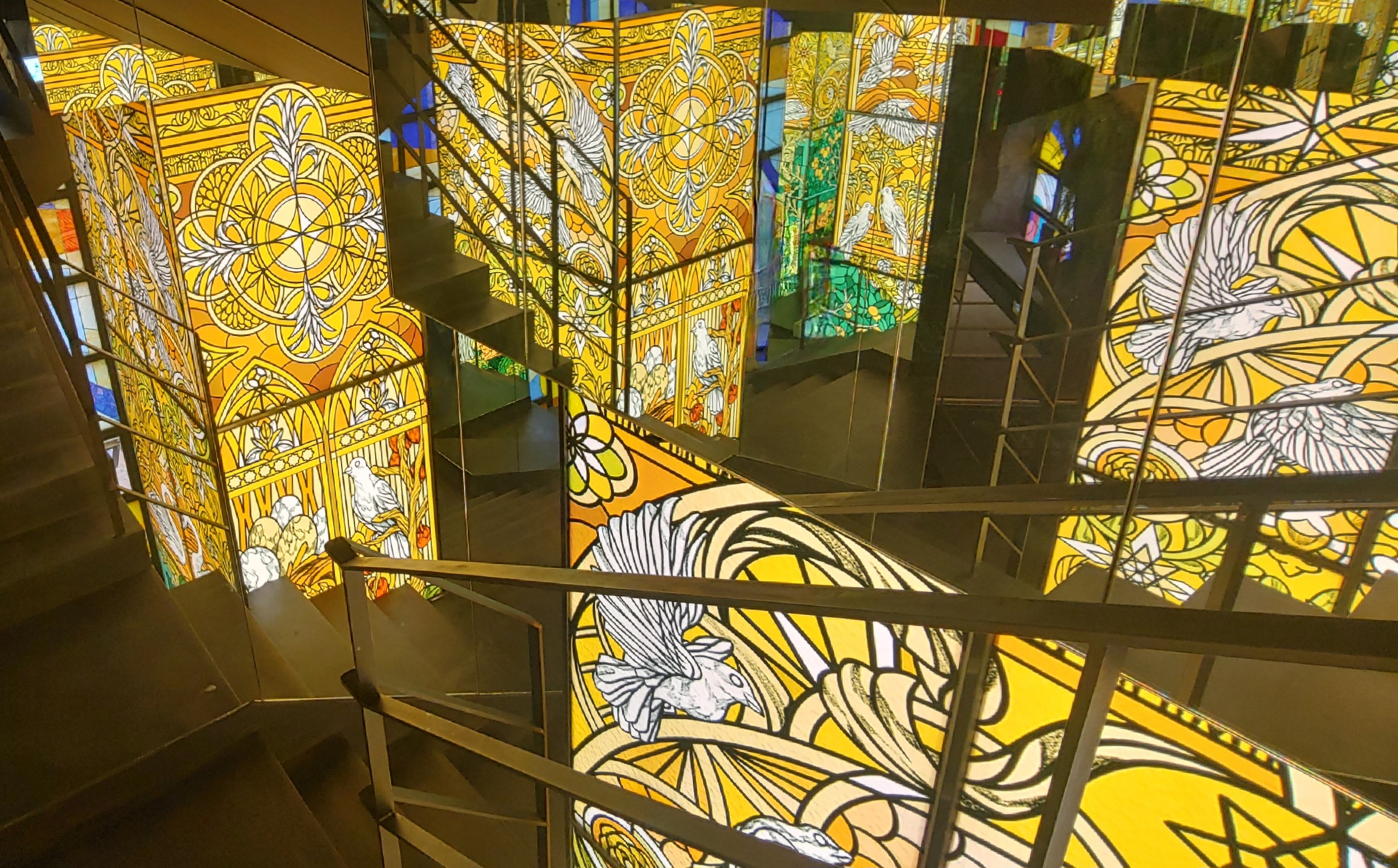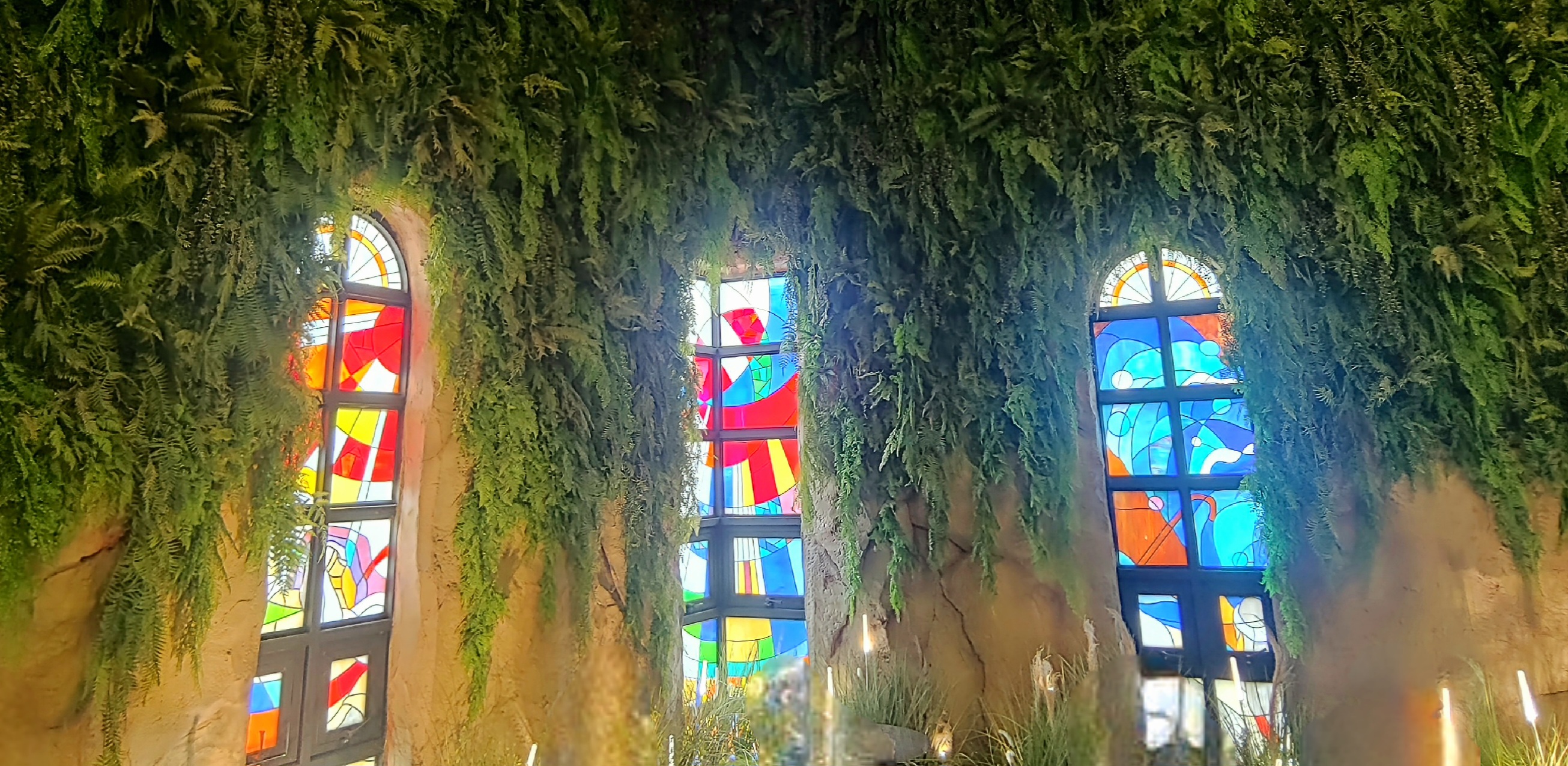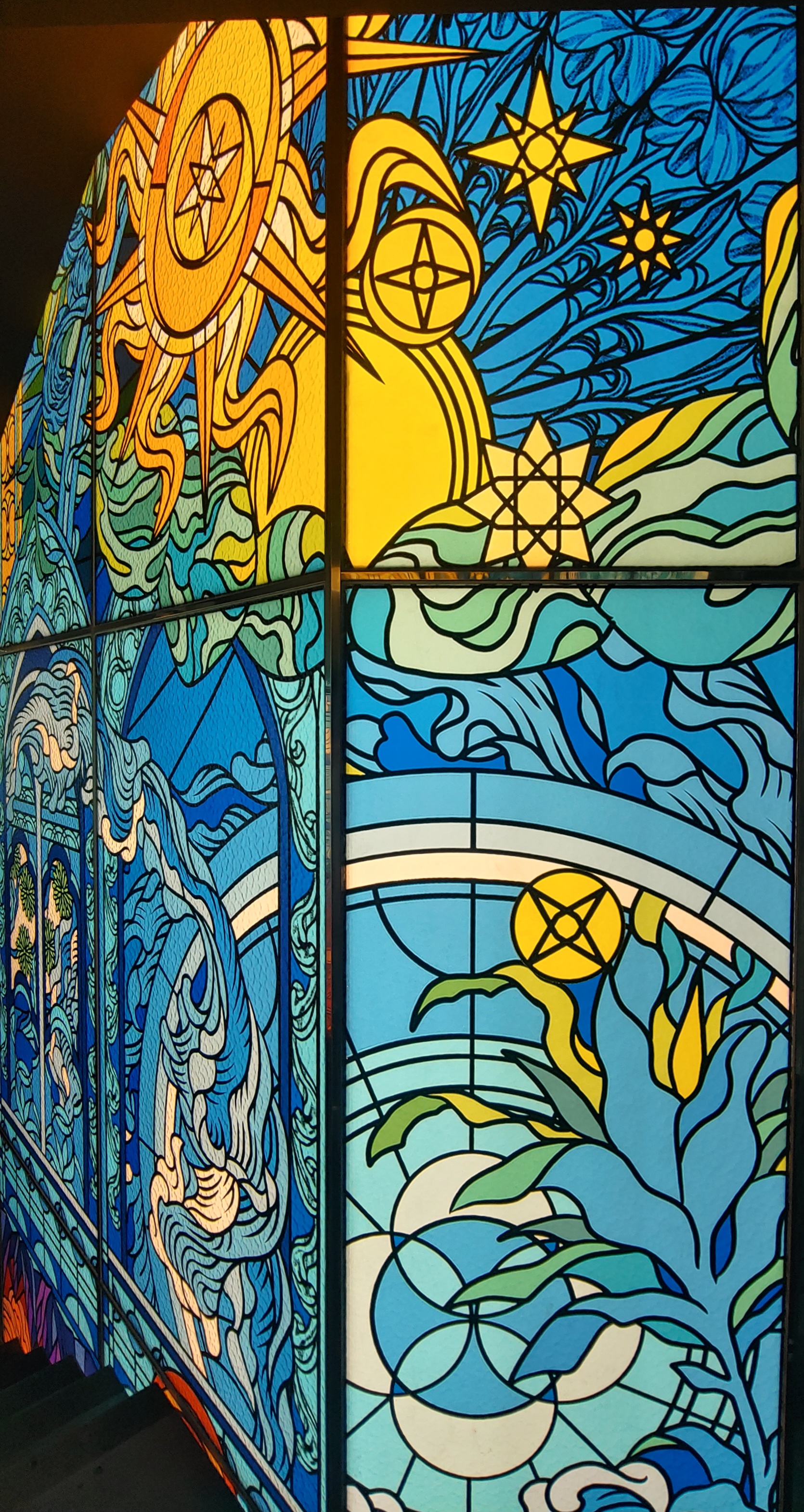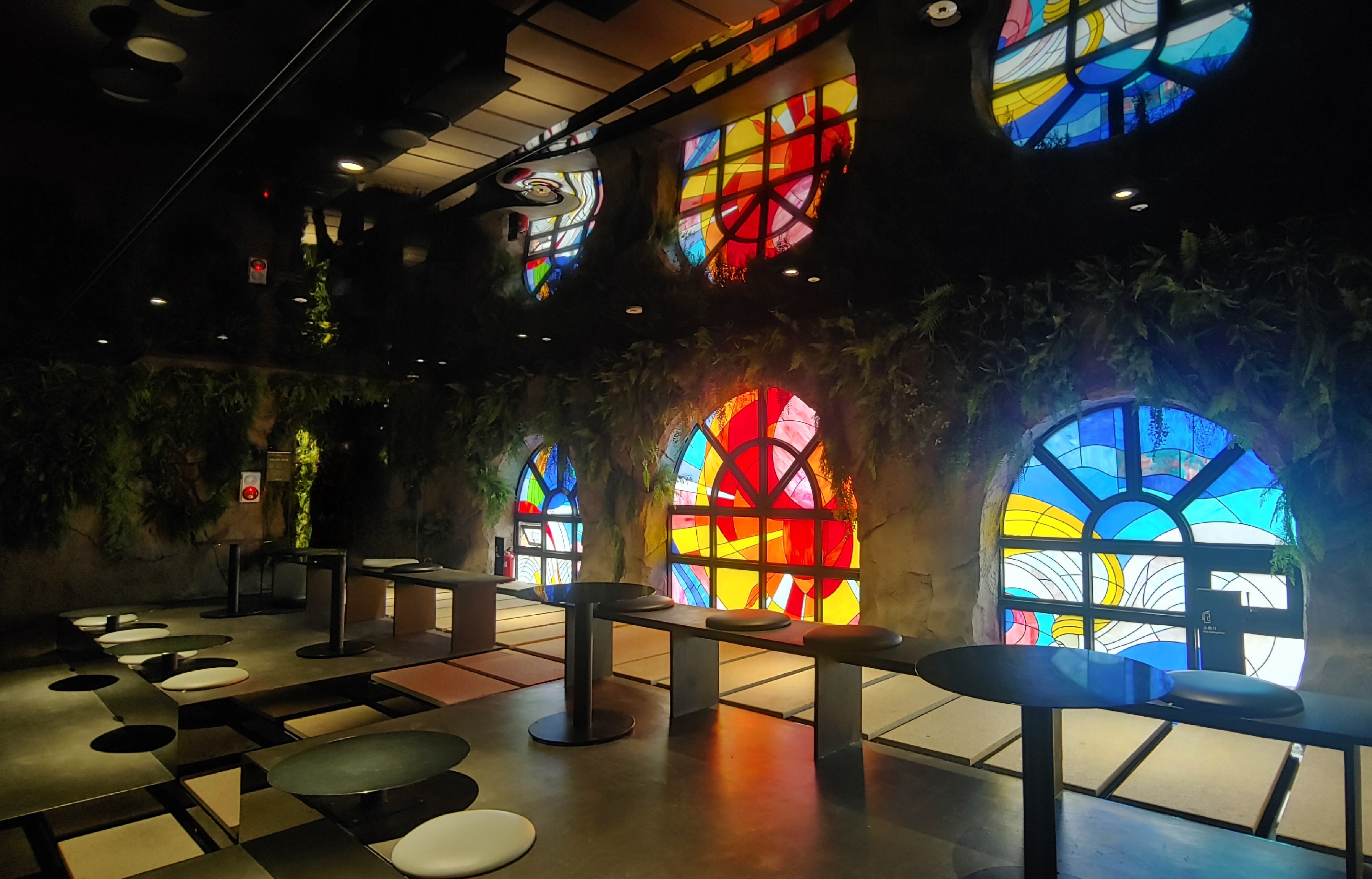인테리어는 곳곳에 설치된 스테인글라스가 특징이다. 교회모양의 외관과 잘 어울린다.
