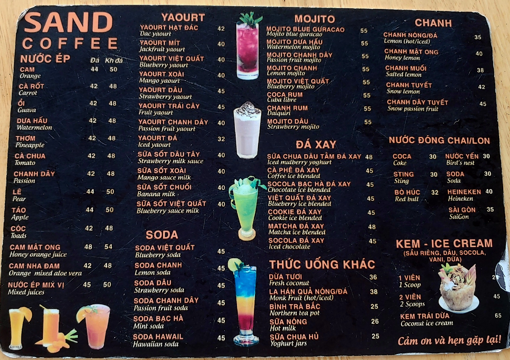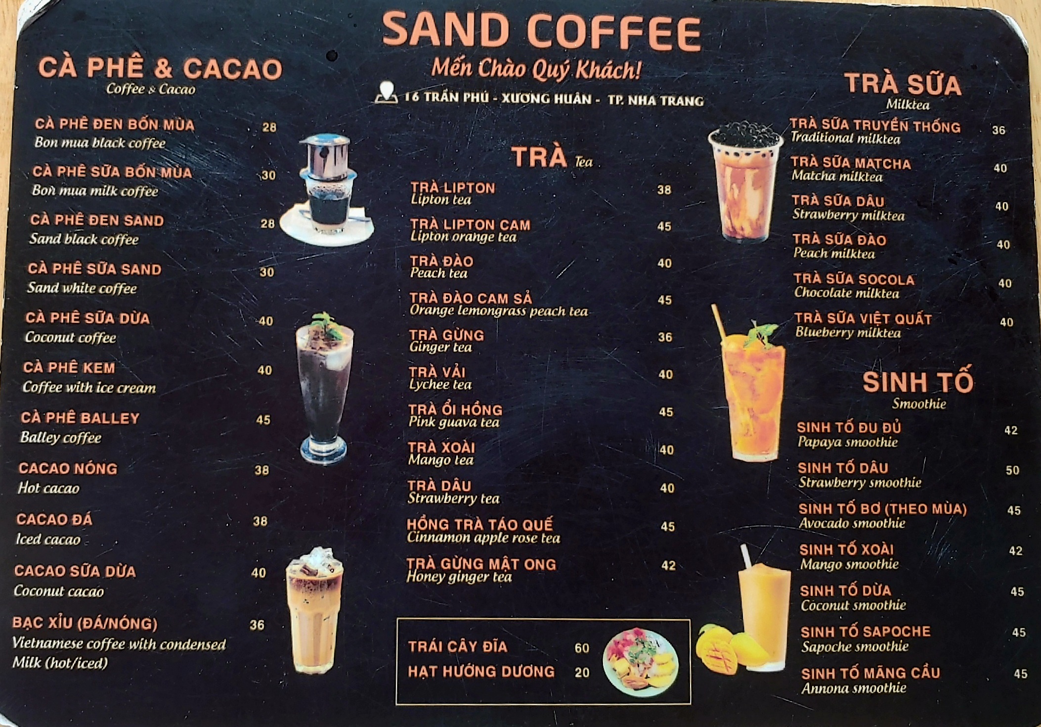 베트남의 다른 로컬 카페들처럼 음료 가격대가 낮고 아침 일찍 문을 연다. 나트랑센터에서 약속이 있을 때 미리 나와서 기다리는 장소로 괜찮다.