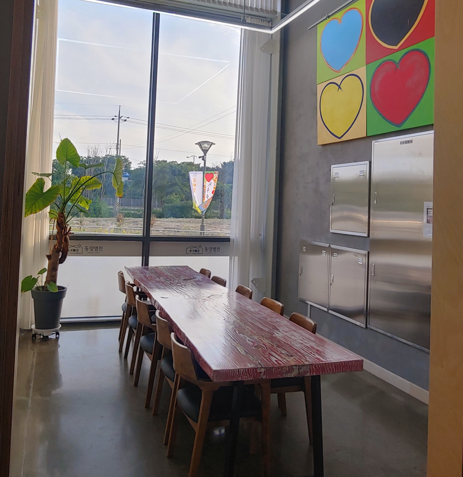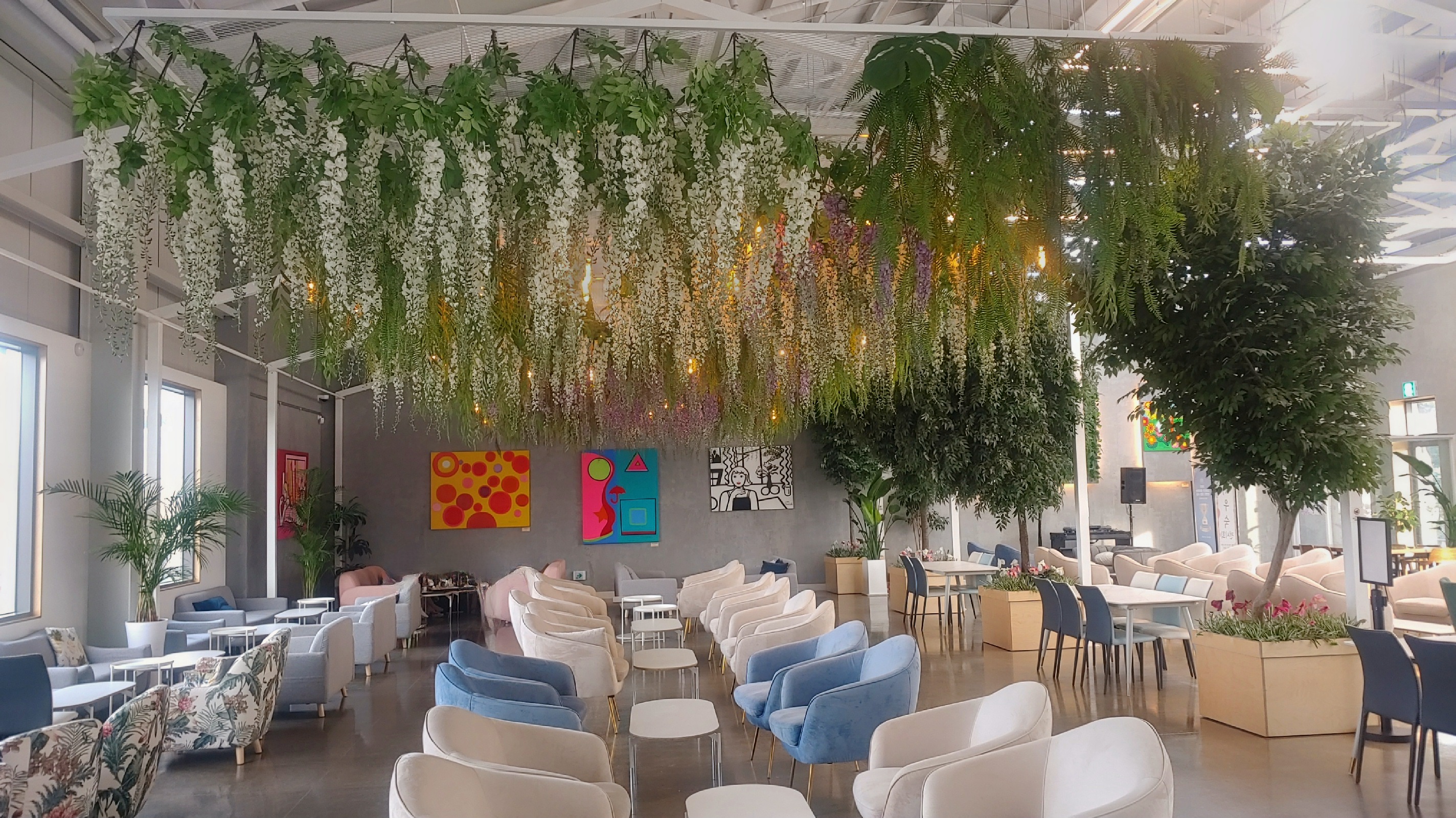 입구를 들어가면 A동의 넓은 창고형 공간에 테이블들이 보인다.