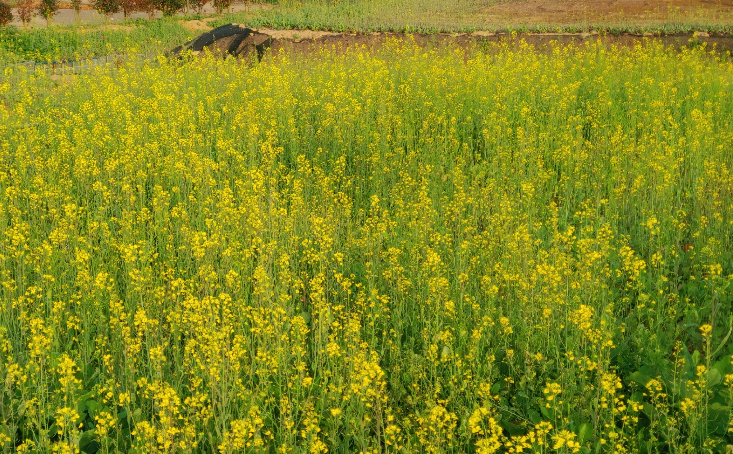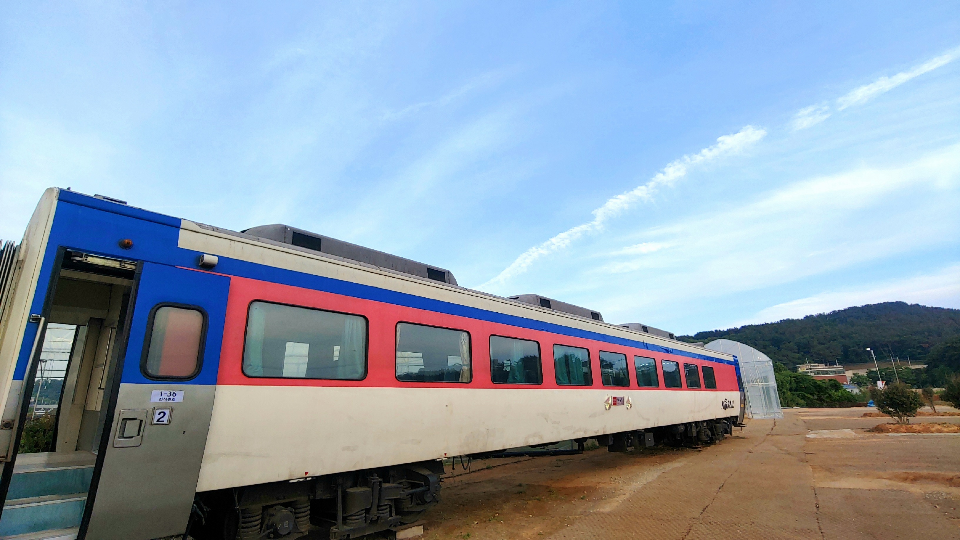 야외에도 테이블이 있으며, 유채꽃밭과 오래된 열차를 구경할 수 있다.