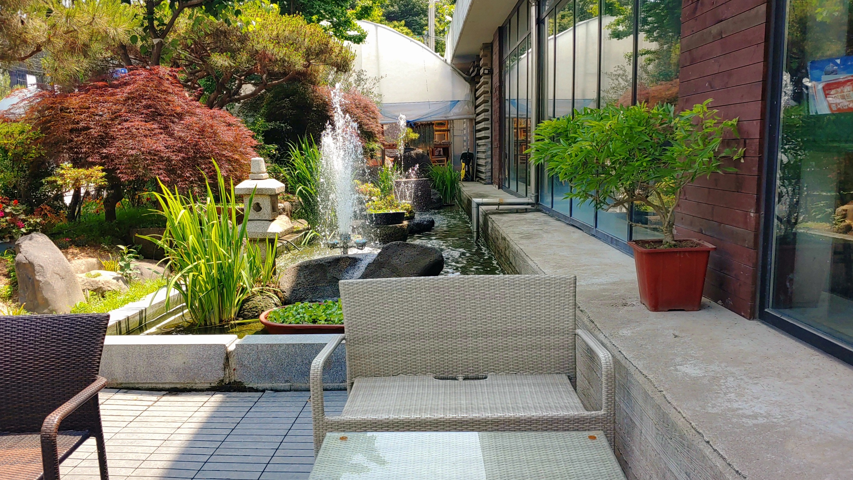 실내로 들어가는 길의 야외 테라스에도 테이블이 있다.