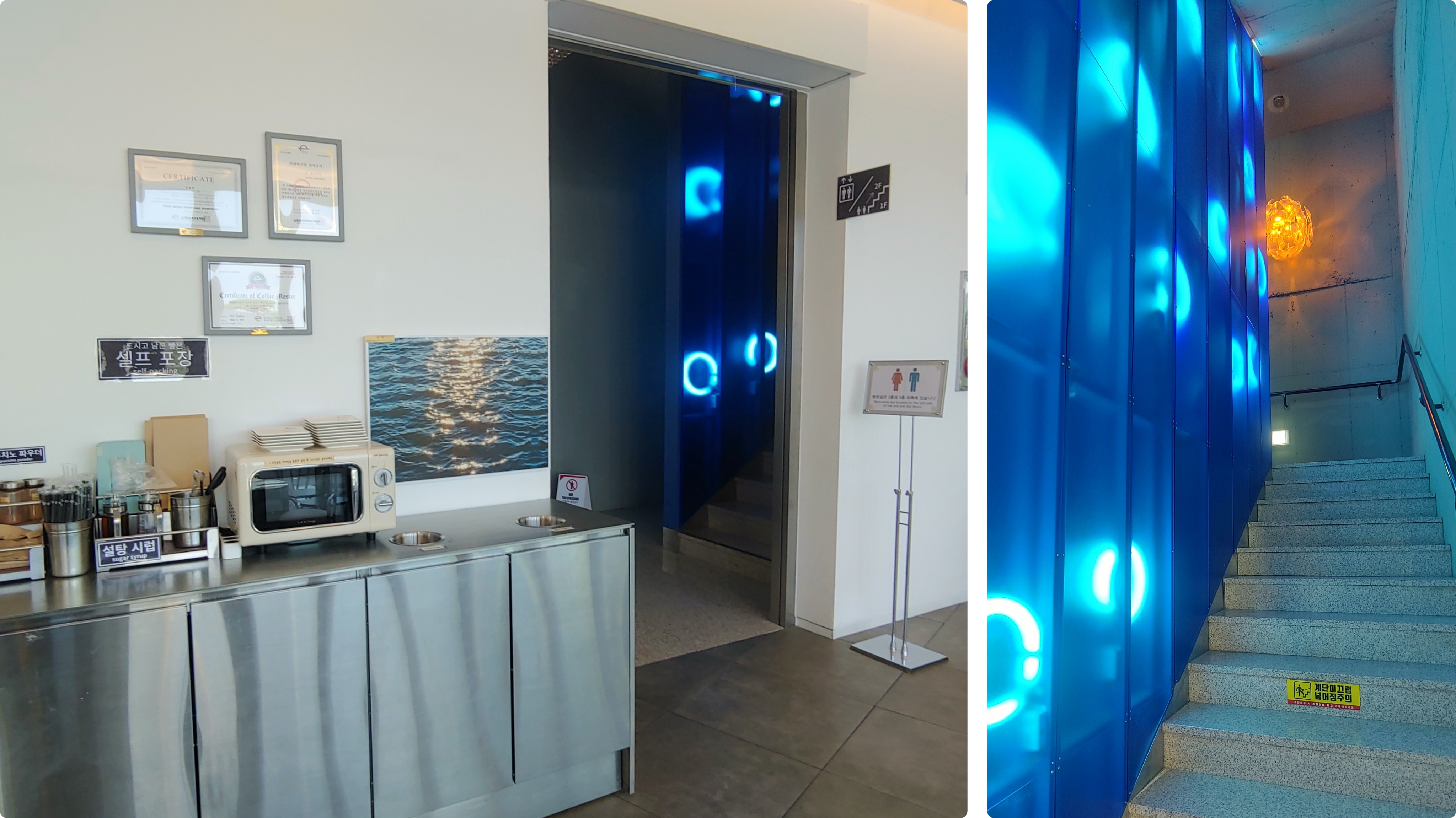 셀프 포장대 옆에 2층으로 올라가는 LED로 장식된 계단이 있다.