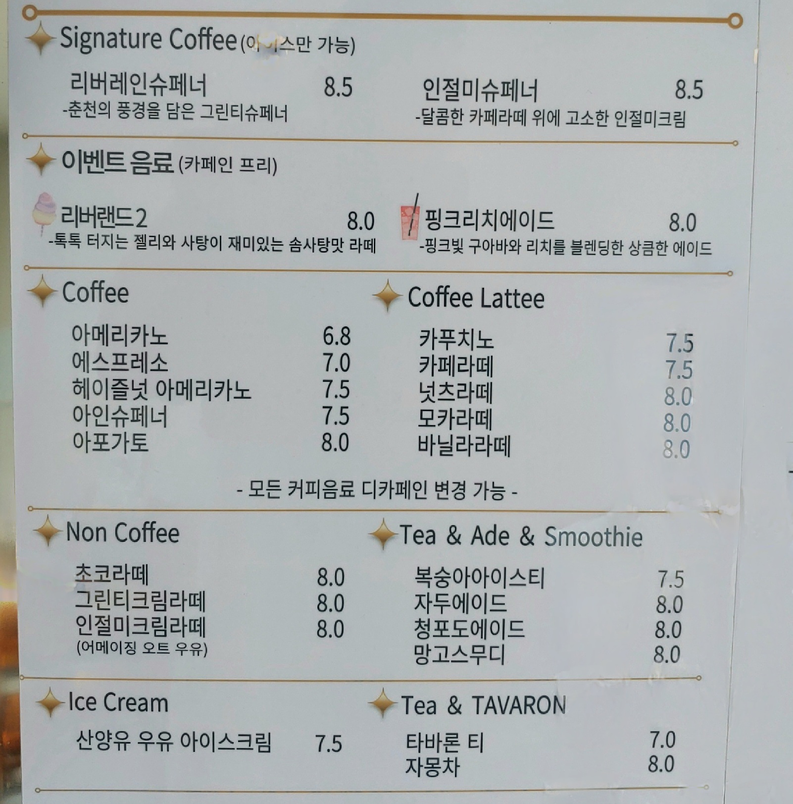 커피와 음료 가격은 교외의 리버뷰 카페 수준으로 높다.