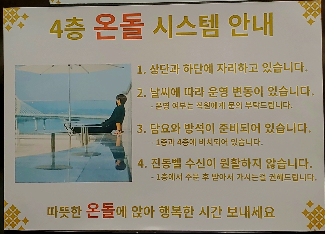 온돌이 설치되어 있는 돌로 만들어진 좌석도 있다.