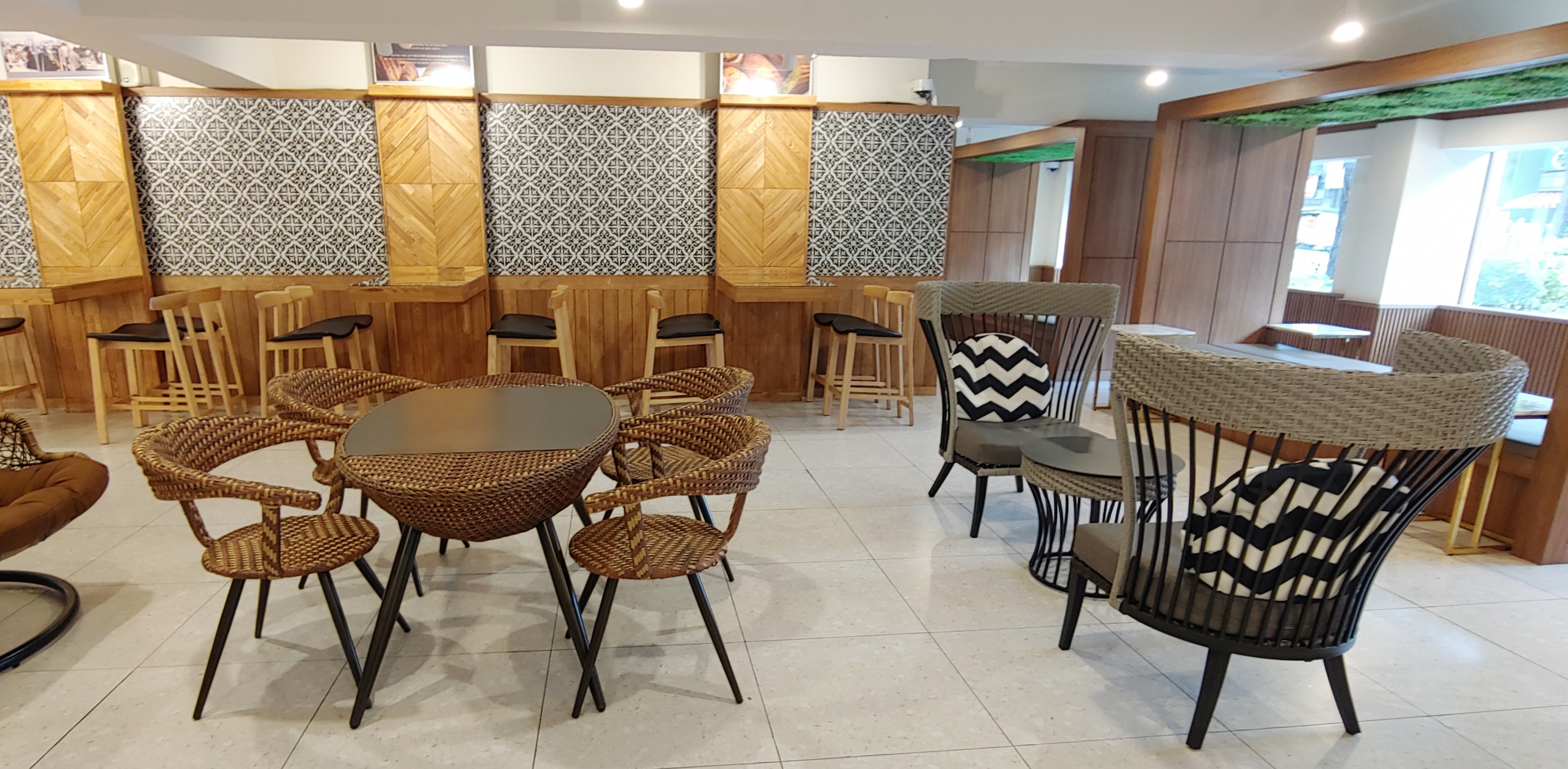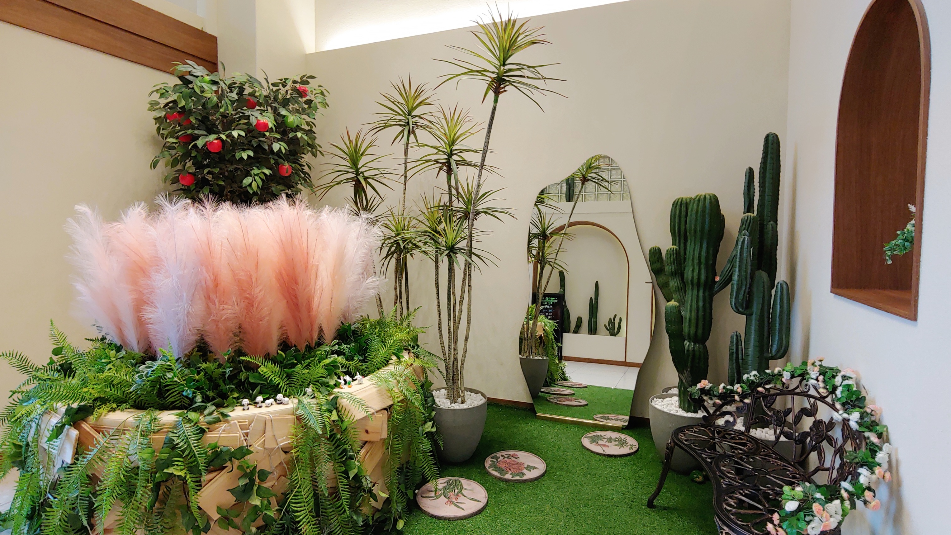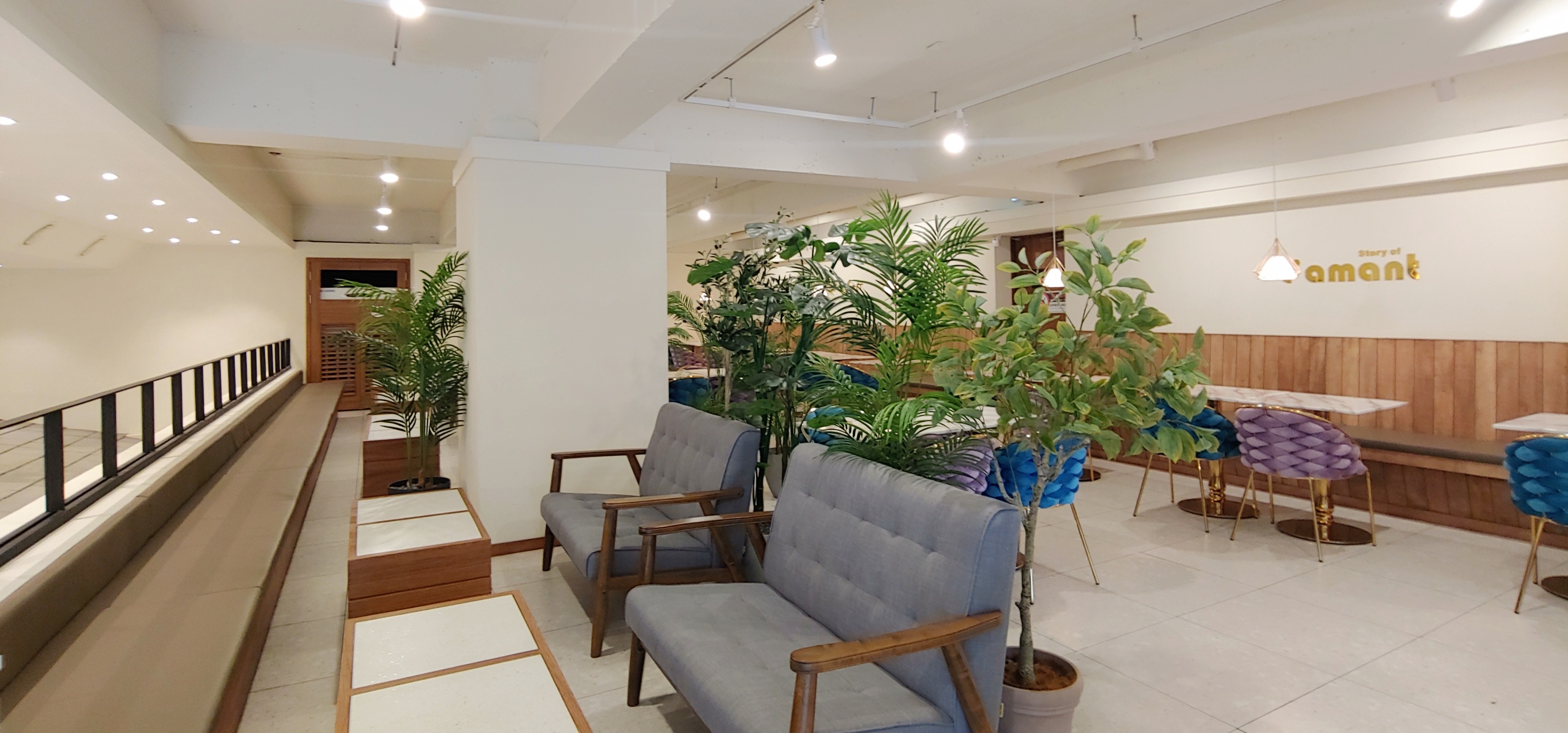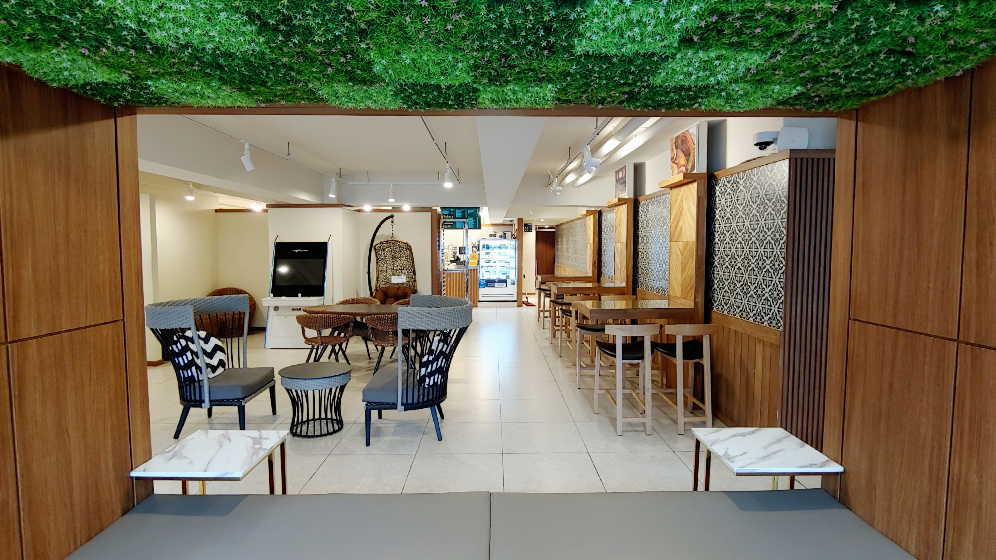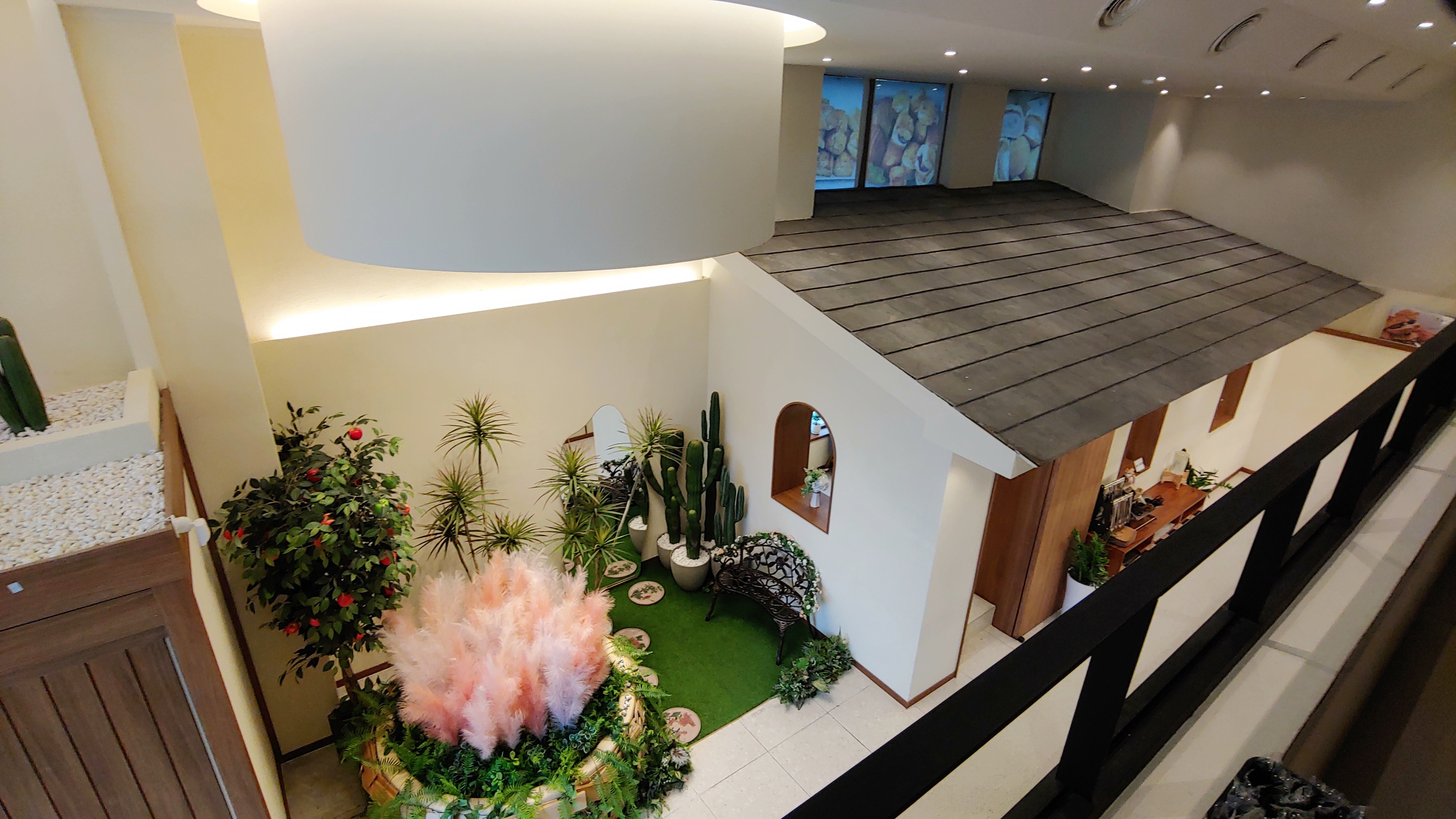 2층으로 올라가면 1층과 연결된 공간을 향한 자리가 보인다. 1층의 지붕 모양 인테리어와 포토 스폿이 보인다.