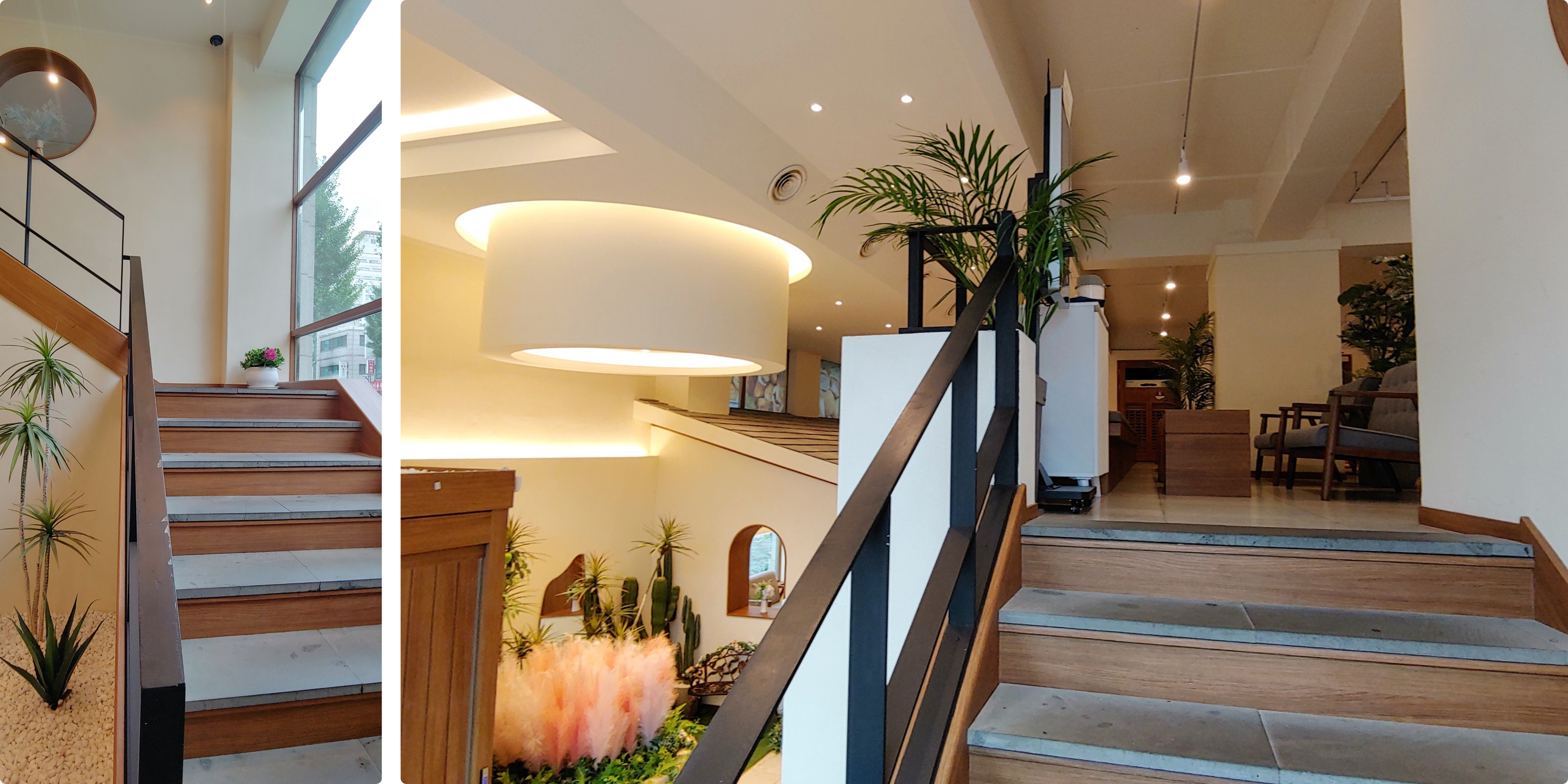 들어가서 오른쪽 창쪽에 2층으로 올라가는 계단이 있다.