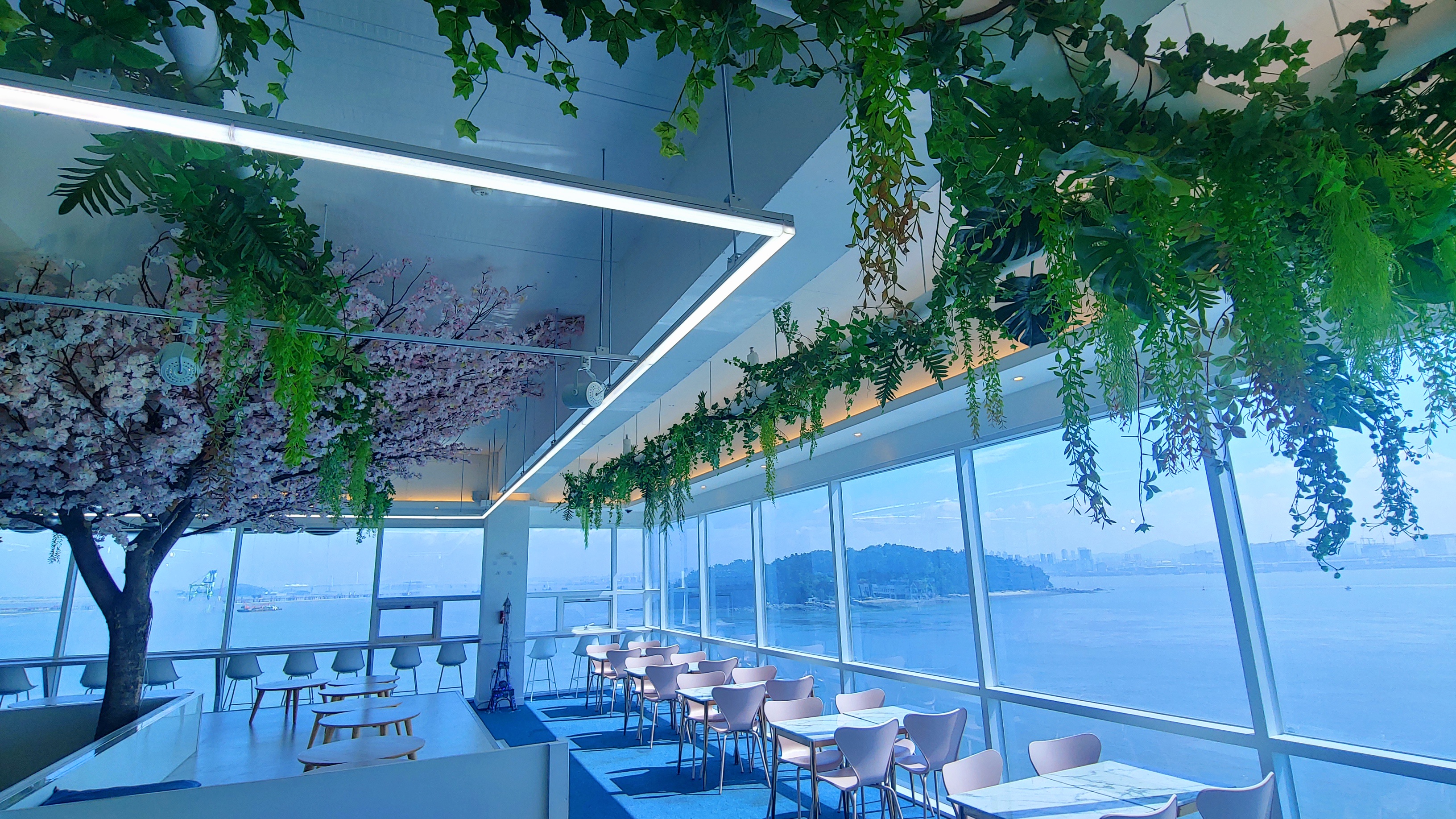 천장의 초록잎 장식과 바다를 바라보면서 커피를 즐기기에 좋다.