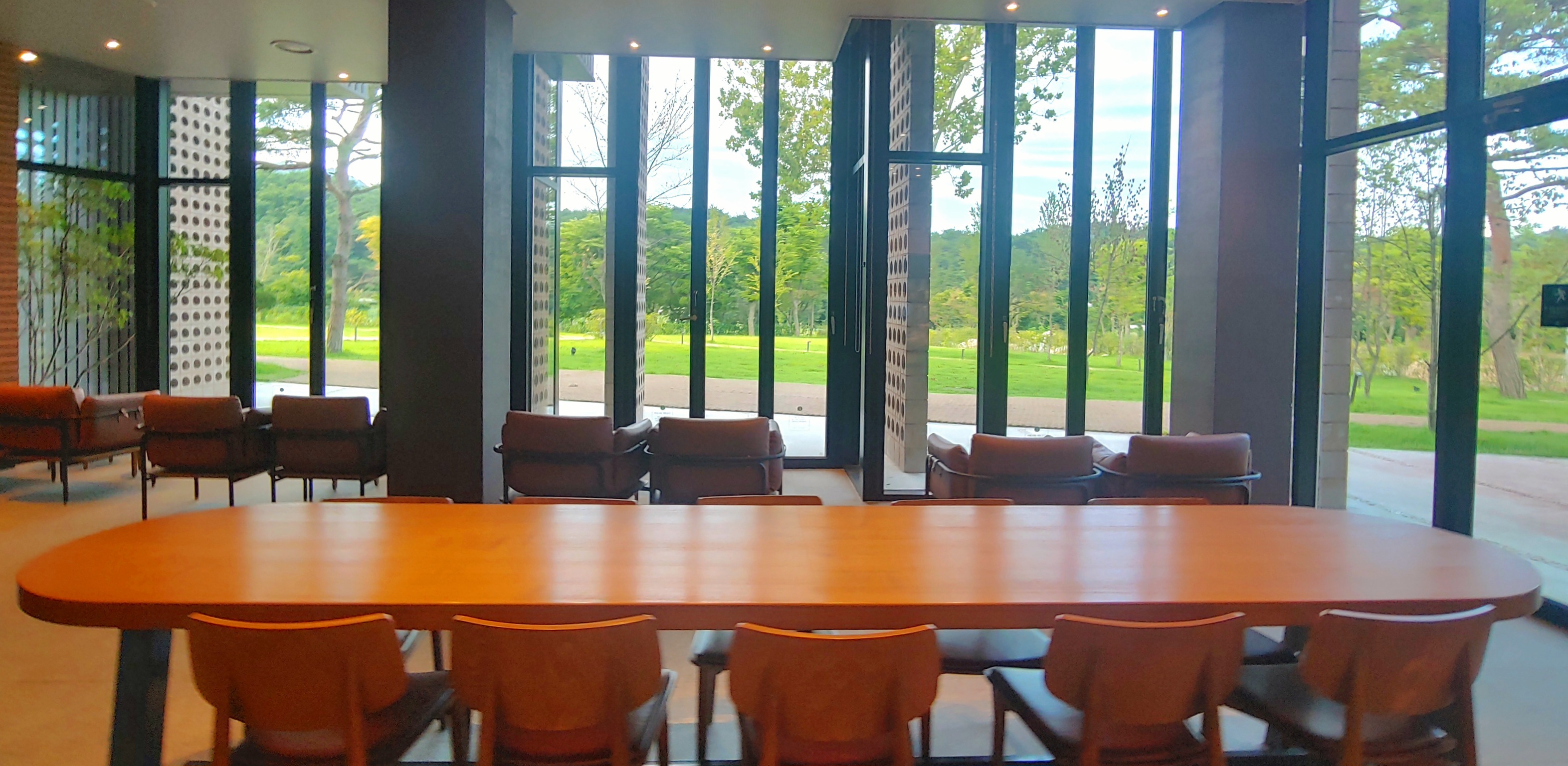 입구 쪽은 다인용 테이블과 잔디밭을 향한 2인용 좌석이 있다.