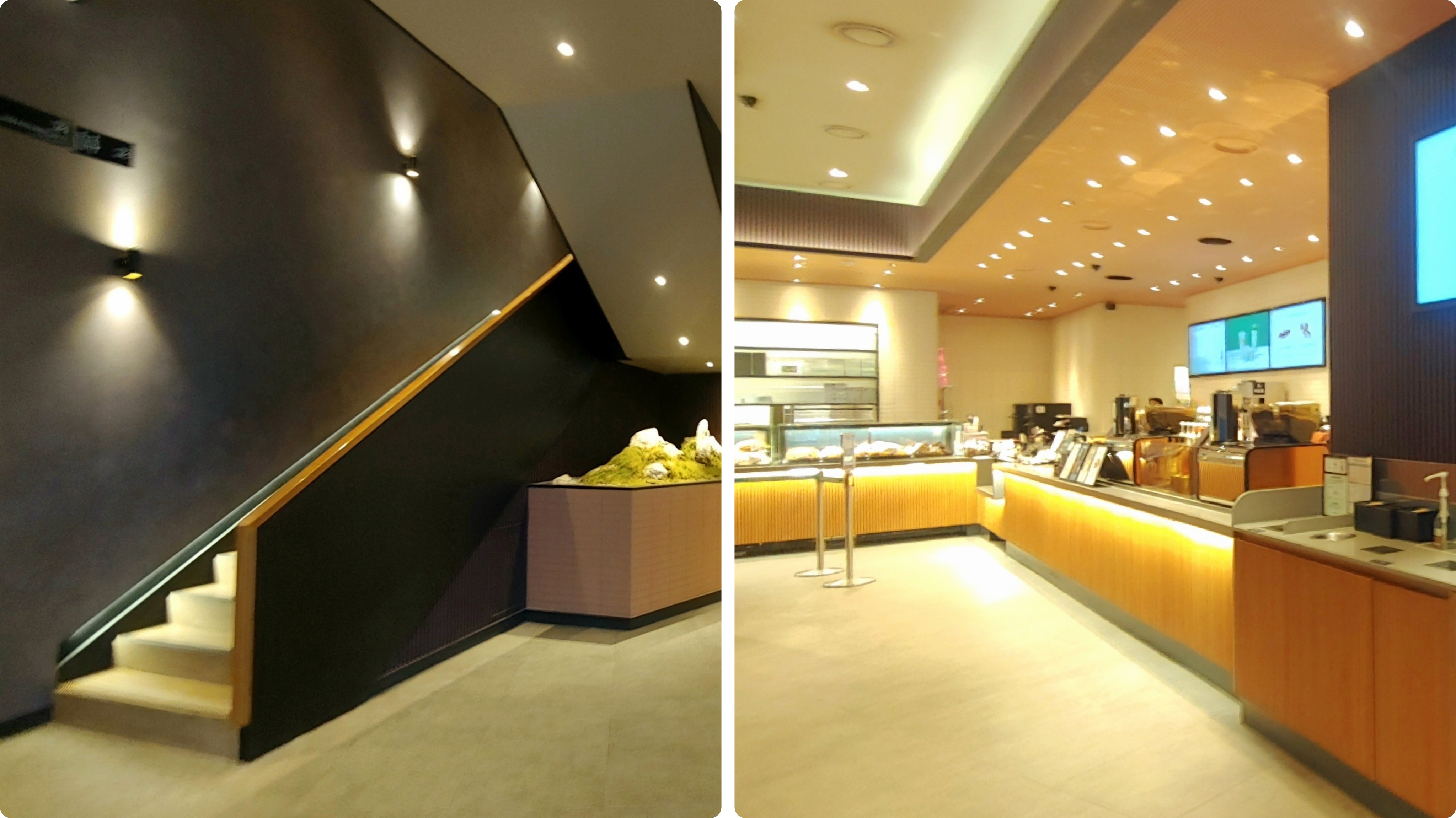 안쪽으로 들어가면 왼쪽에 2층으로 올라가는 계단, 오른쪽에 카운터가 보인다.