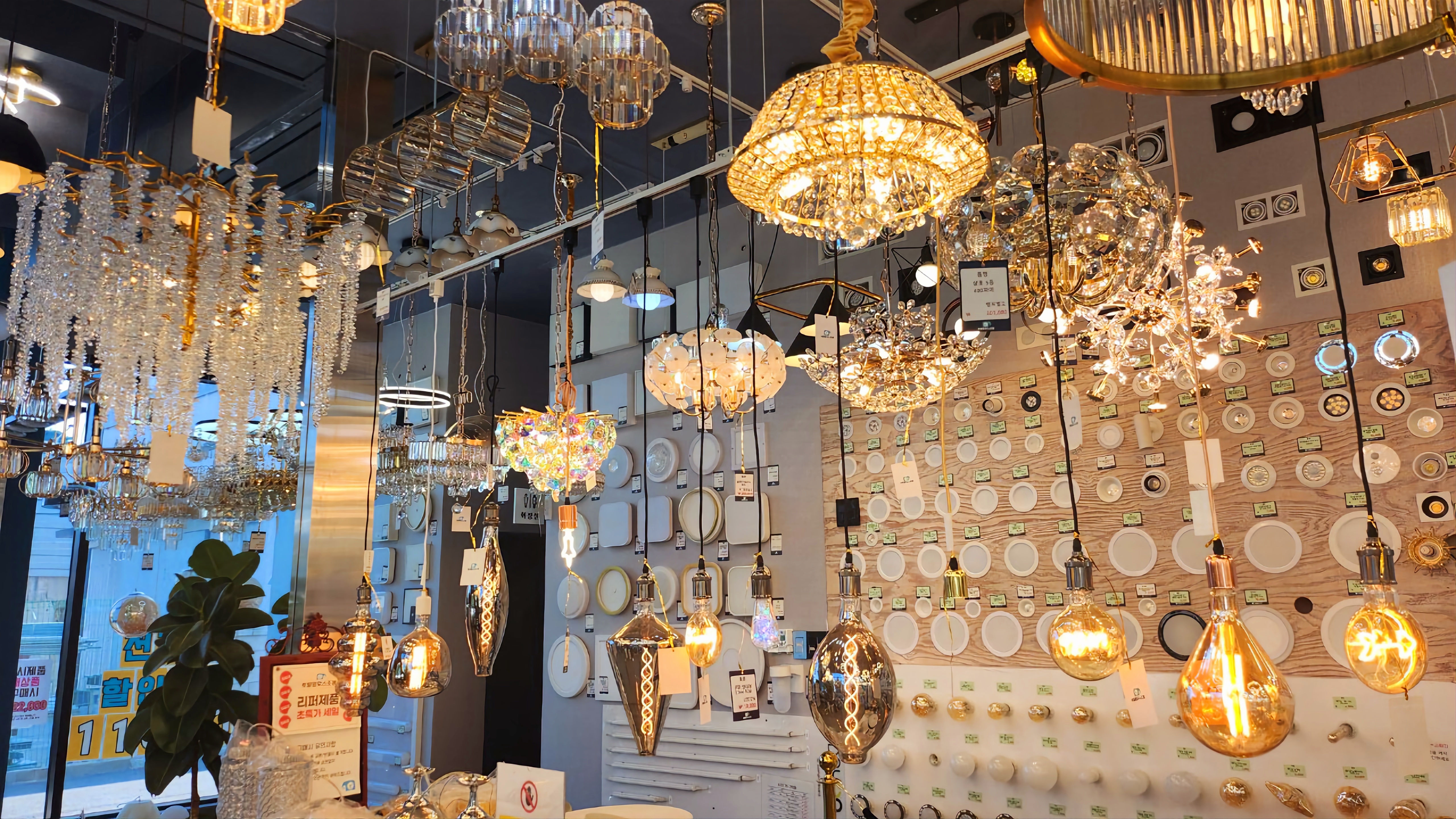 왼쪽에 테이블들이 있는데, 조명가게와 연결되어 있다.