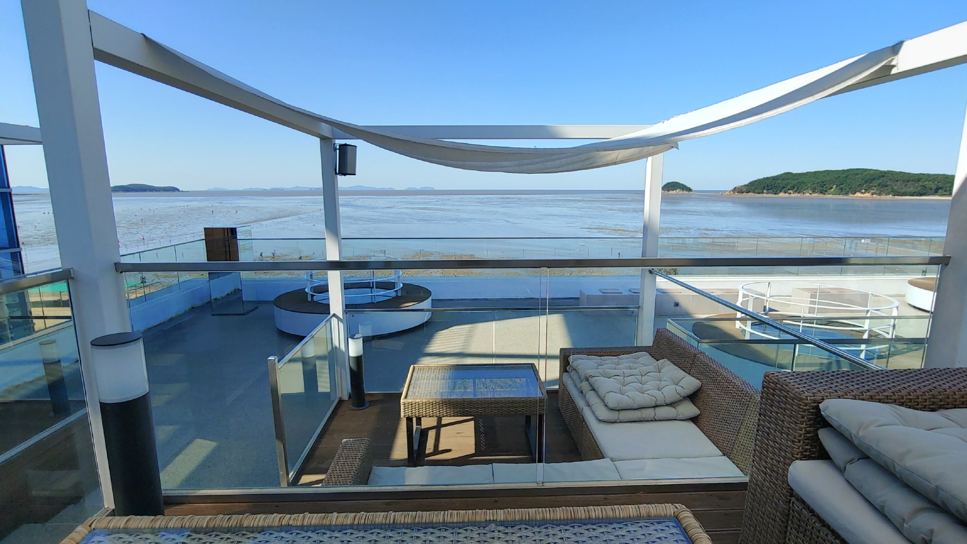 햇빛을 가려주는 천으로 덮여있는 소파 좌석 1층과 2층은 바다가 잘 보여서 인기가 많다.