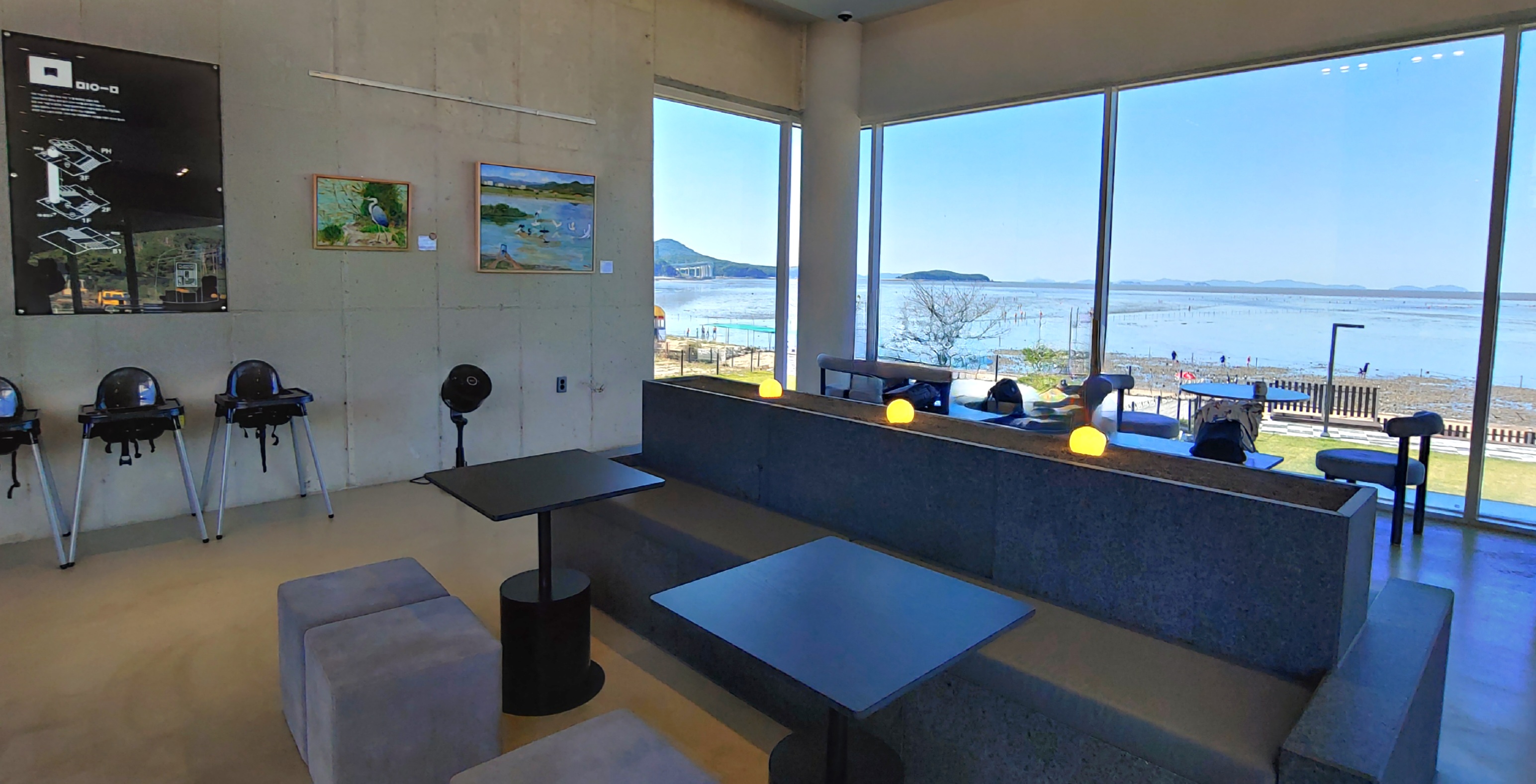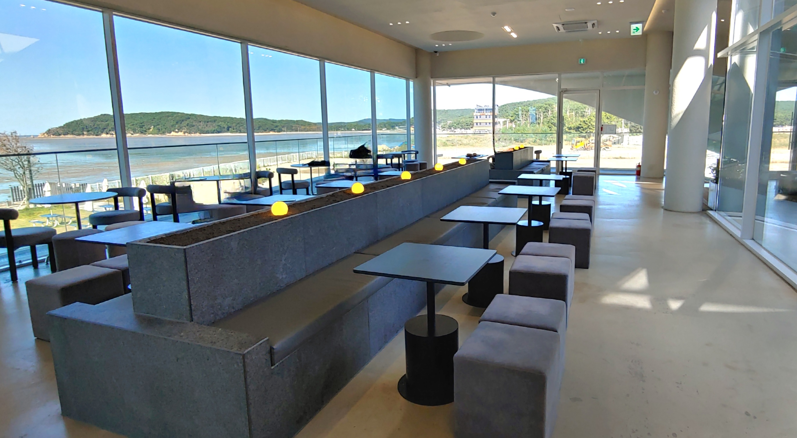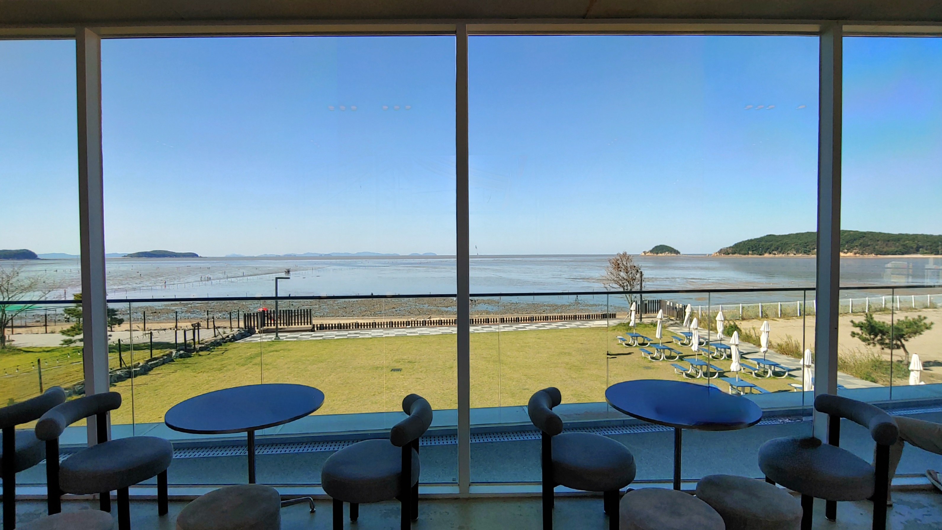 2층은 3면이 통창으로 되어 있어서 개방감이 높다. 창가의 바다가 잘 보이는 자리는 인기가 많아서 가장 먼저 찬다.