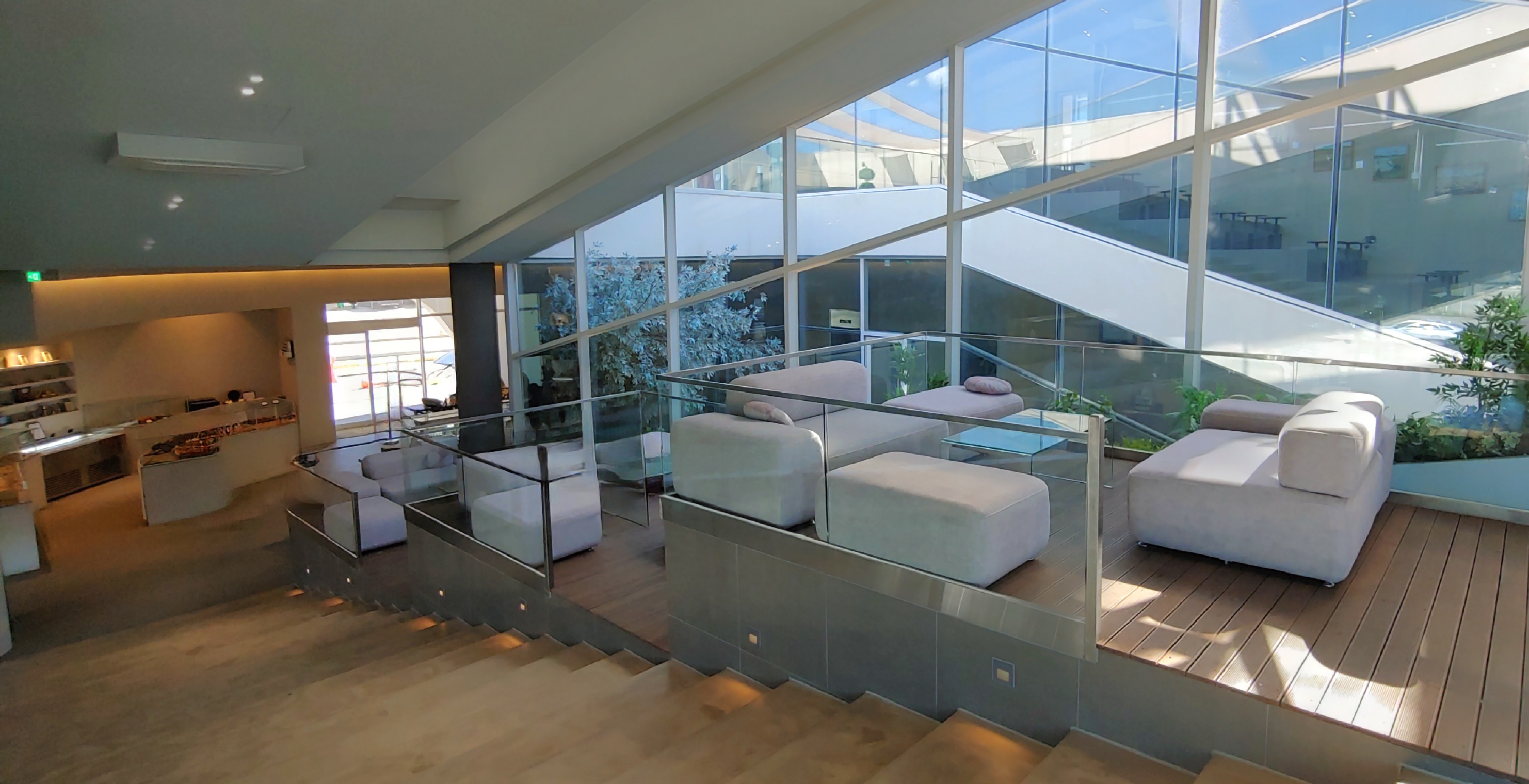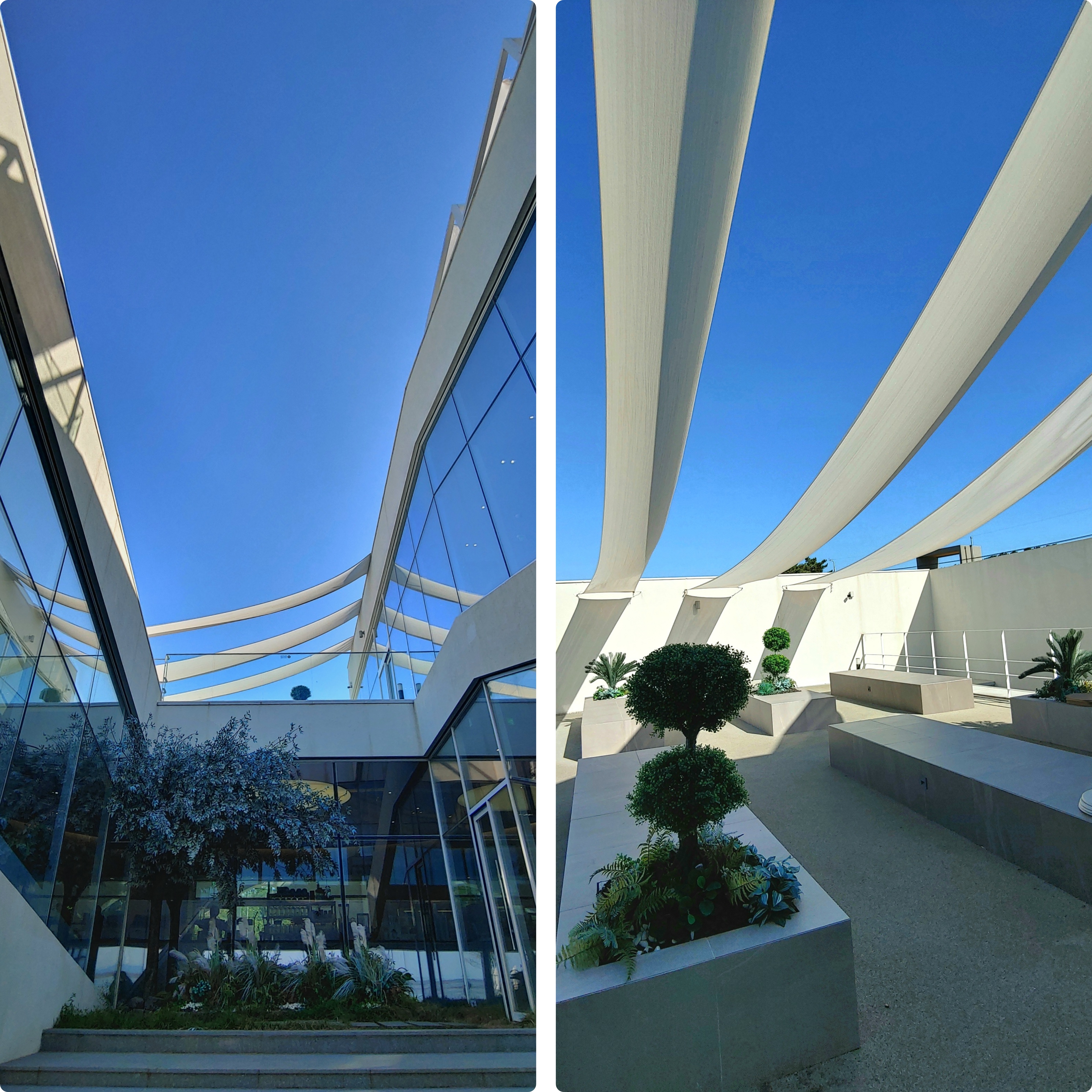 카페로 들어가는 계단에서 ㅁ자 건물의 중정 위로 루프탑과 하늘이 보인다.