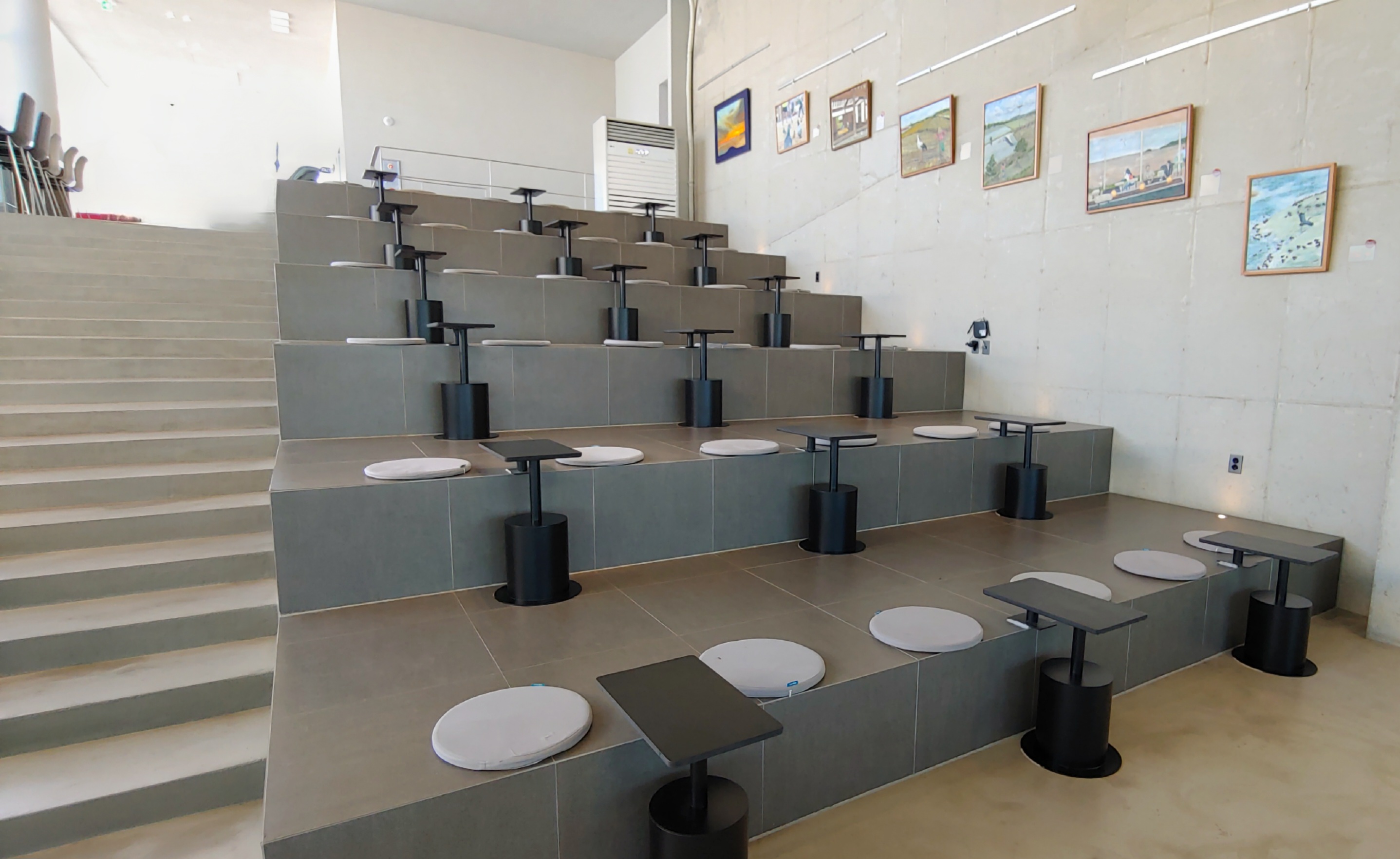 건물의 중정 좌우에 1층에서 2층으로 올라가는 공간에는 각각 다른 형태의 계단씩 좌석이 있다.