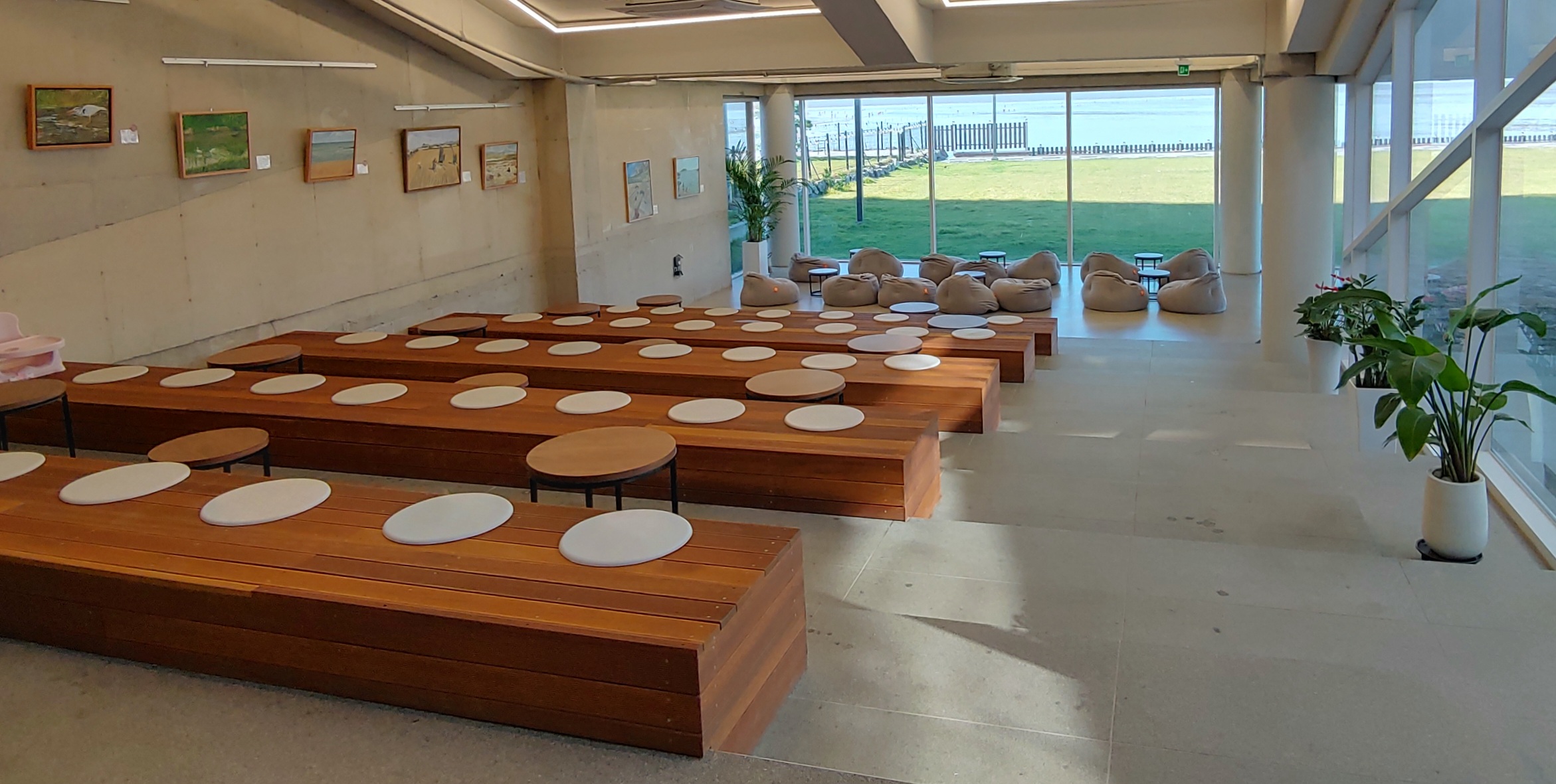 루프탑으로 올라가는 공간도 바다를 향한 계단씩 좌석이 있다.