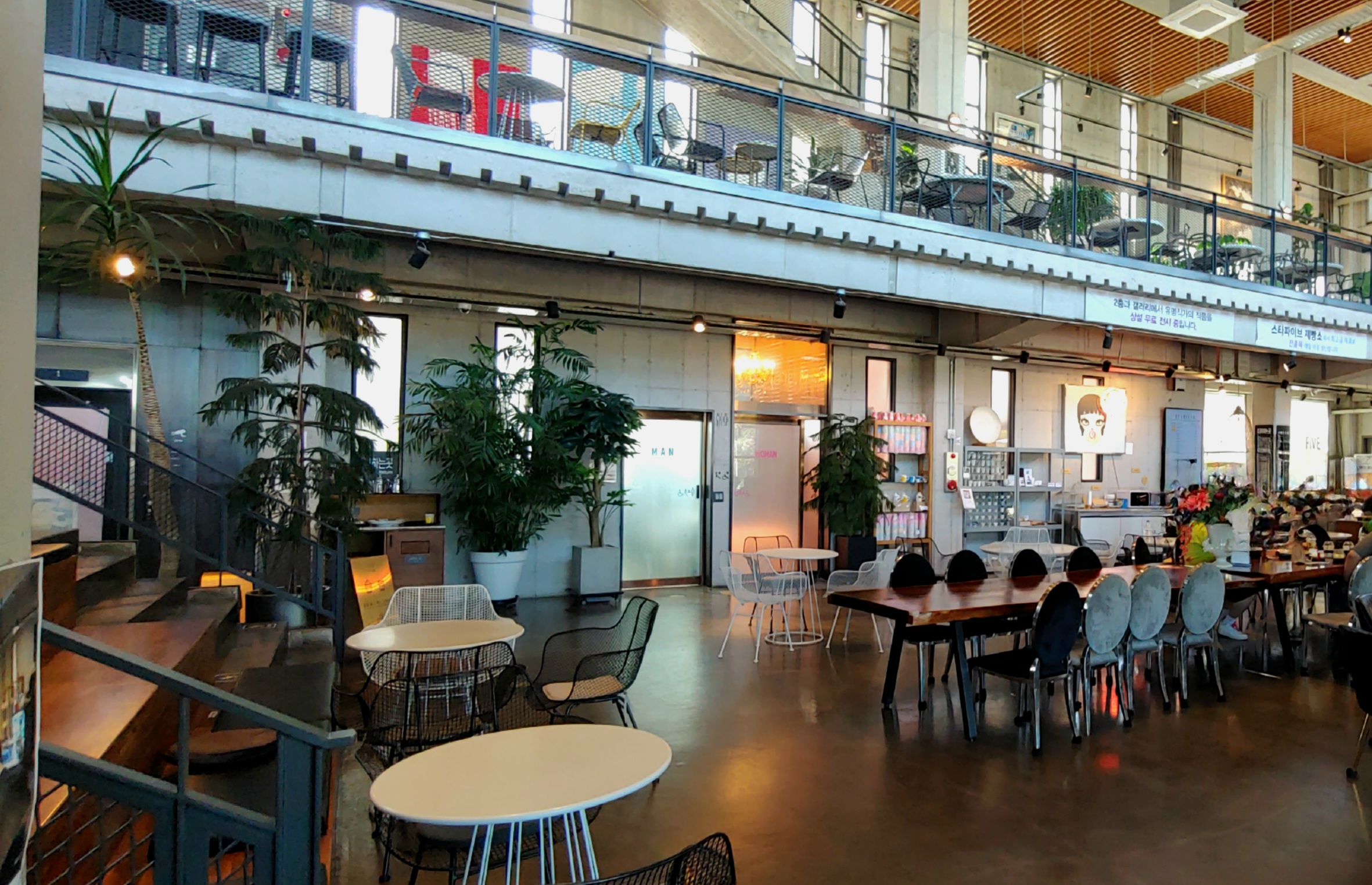 2층에는 난간 주위로 놓인 테이블 외에도 통창이 없는 벽 쪽에 소파 공간도 있다.
