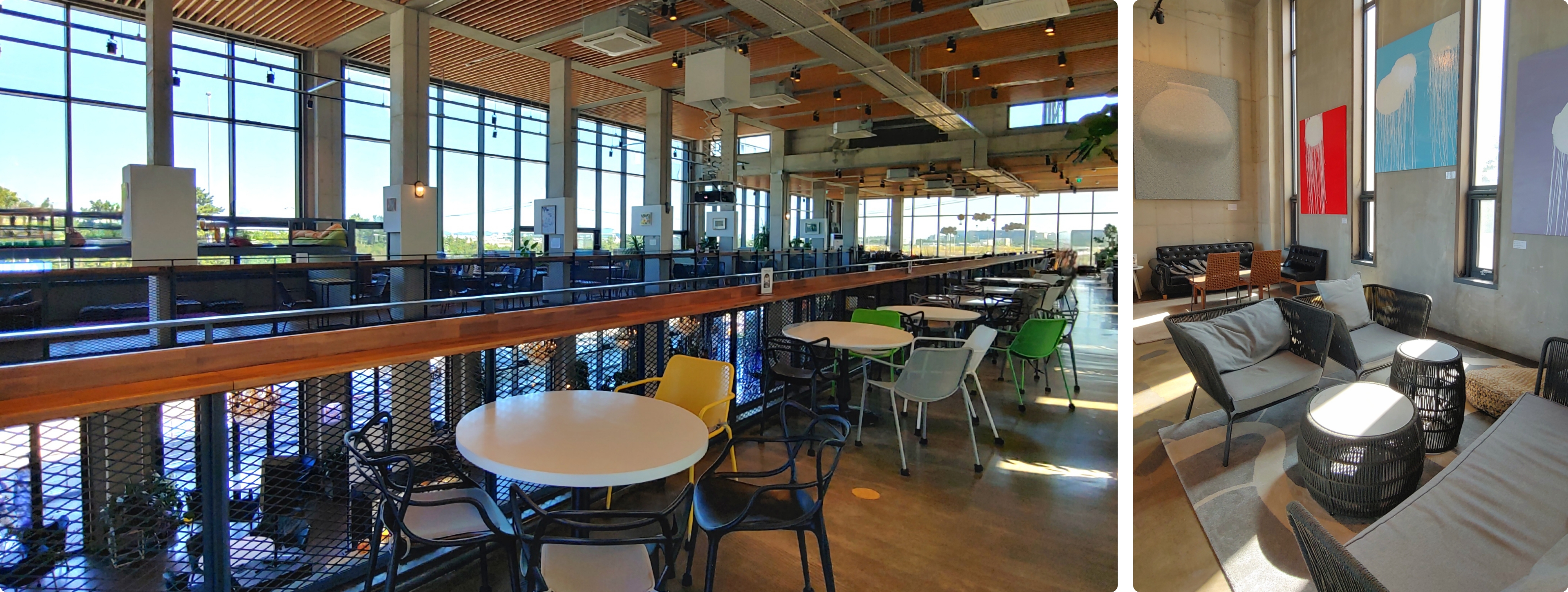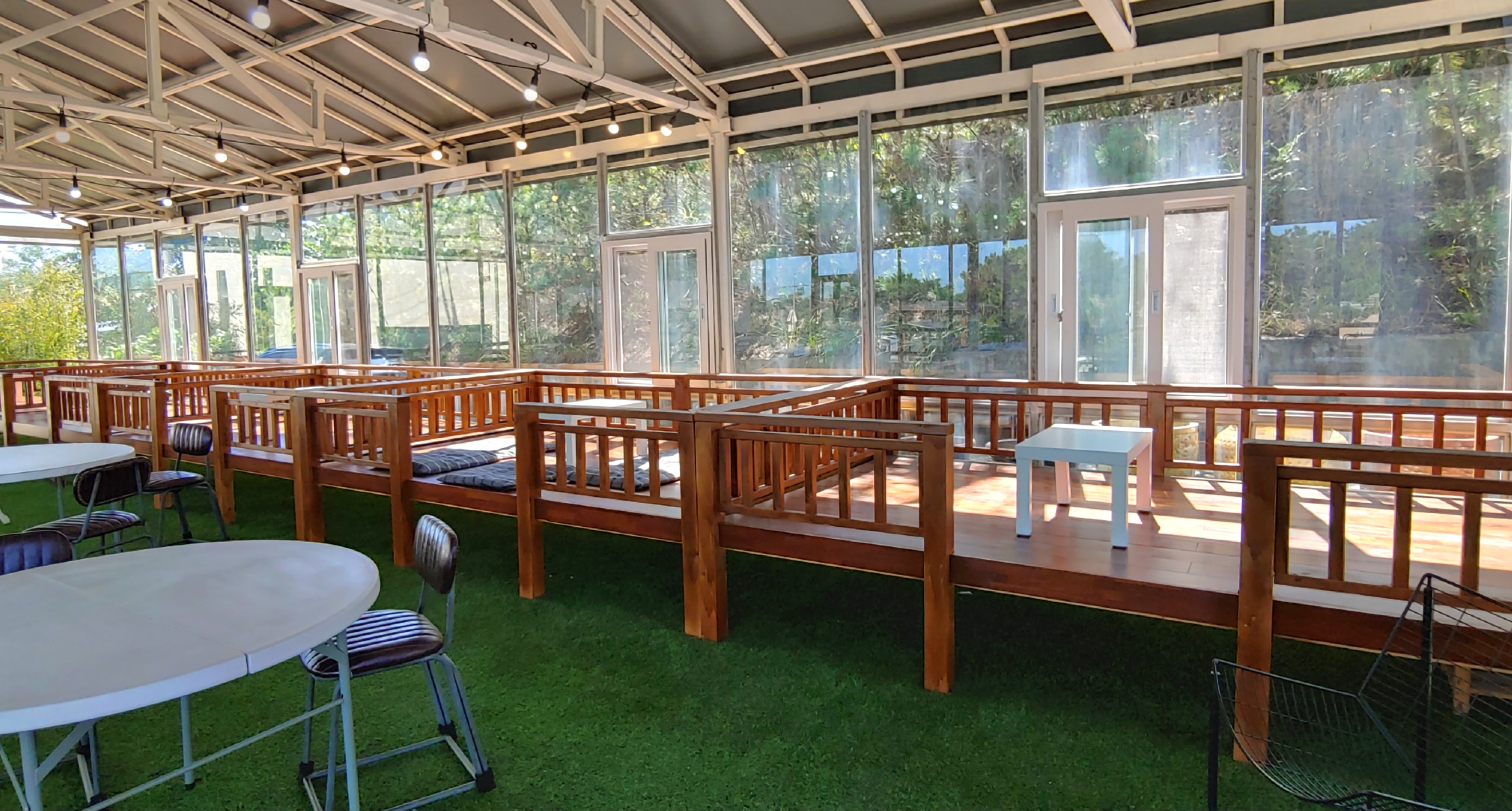 건물 뒤에 온실처럼 보이는 곳도 내부에는 많은 사람들이 앉을 수 있는 테이블과 평상이 있다.