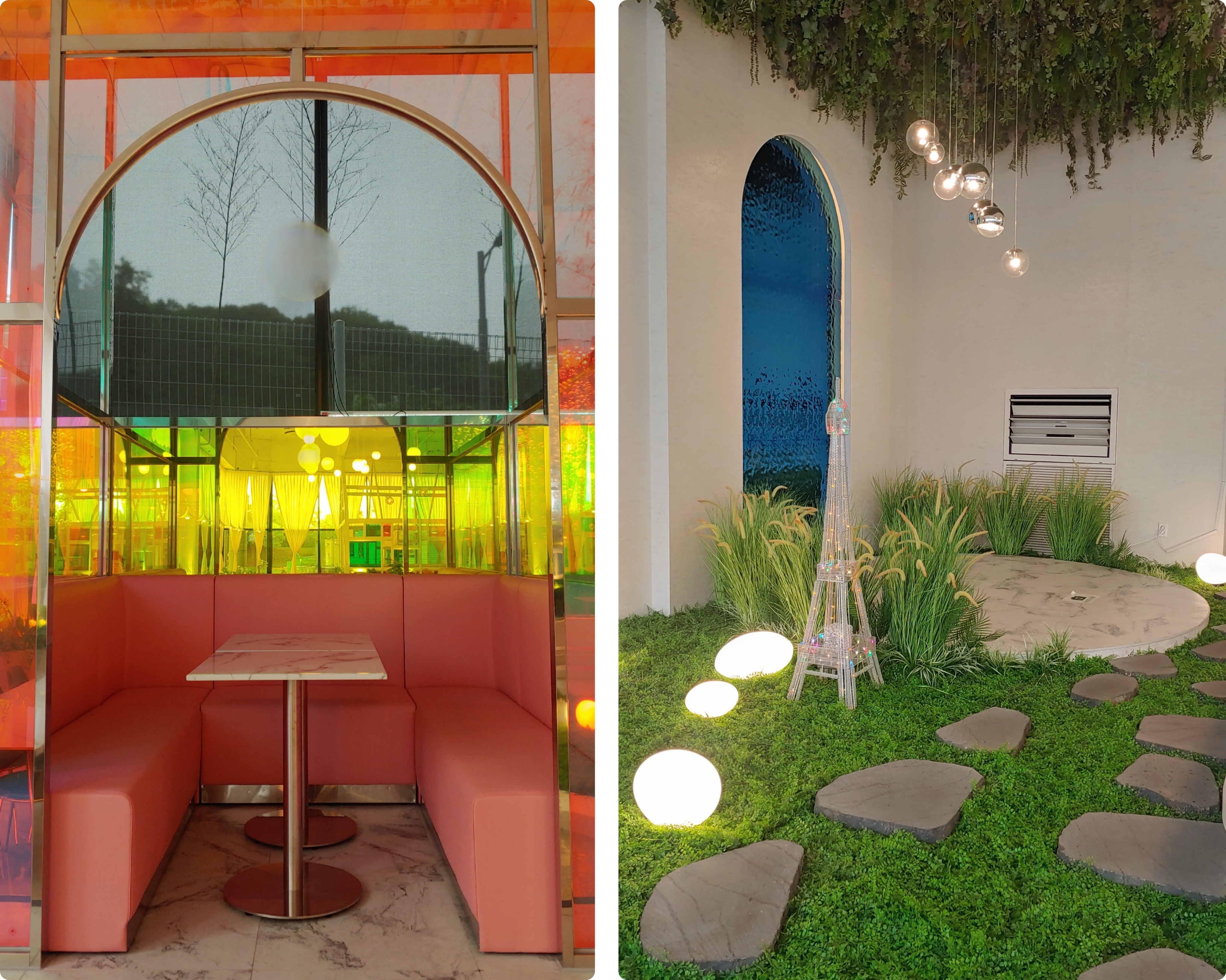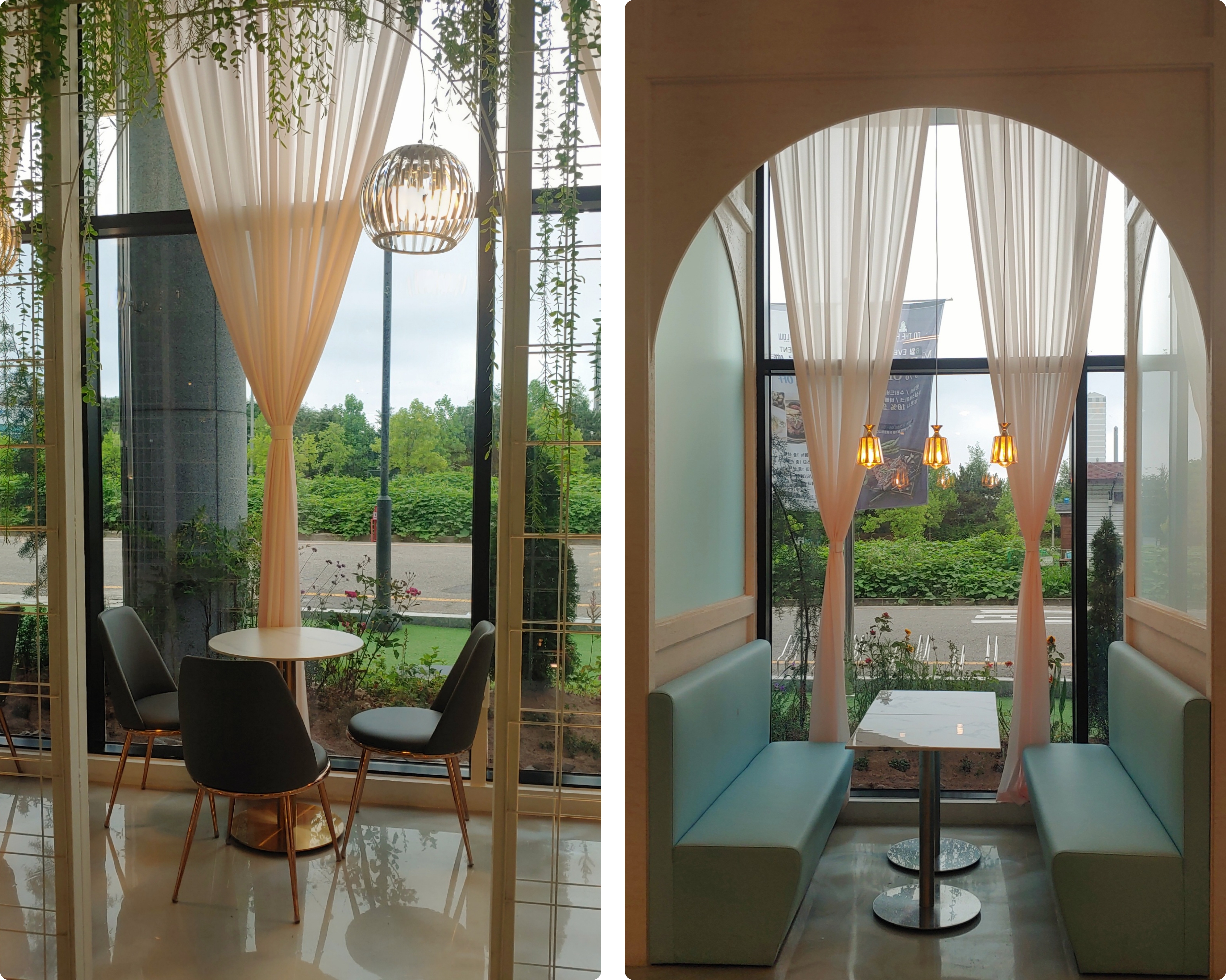 야외 주차장 쪽 창 앞에는 두 가지 다른 분위기로 만들어진 자리가 있다.