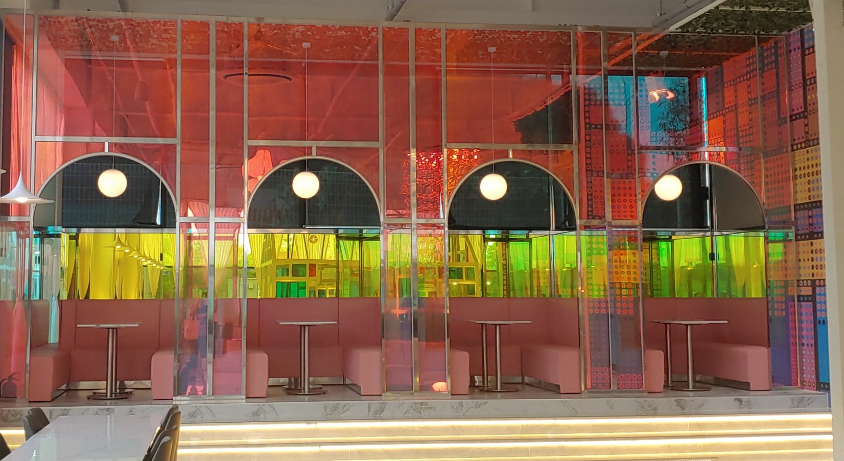 엘리베이터 오른쪽은 좀 더 강한 색으로 인테리어가 되어 있다.