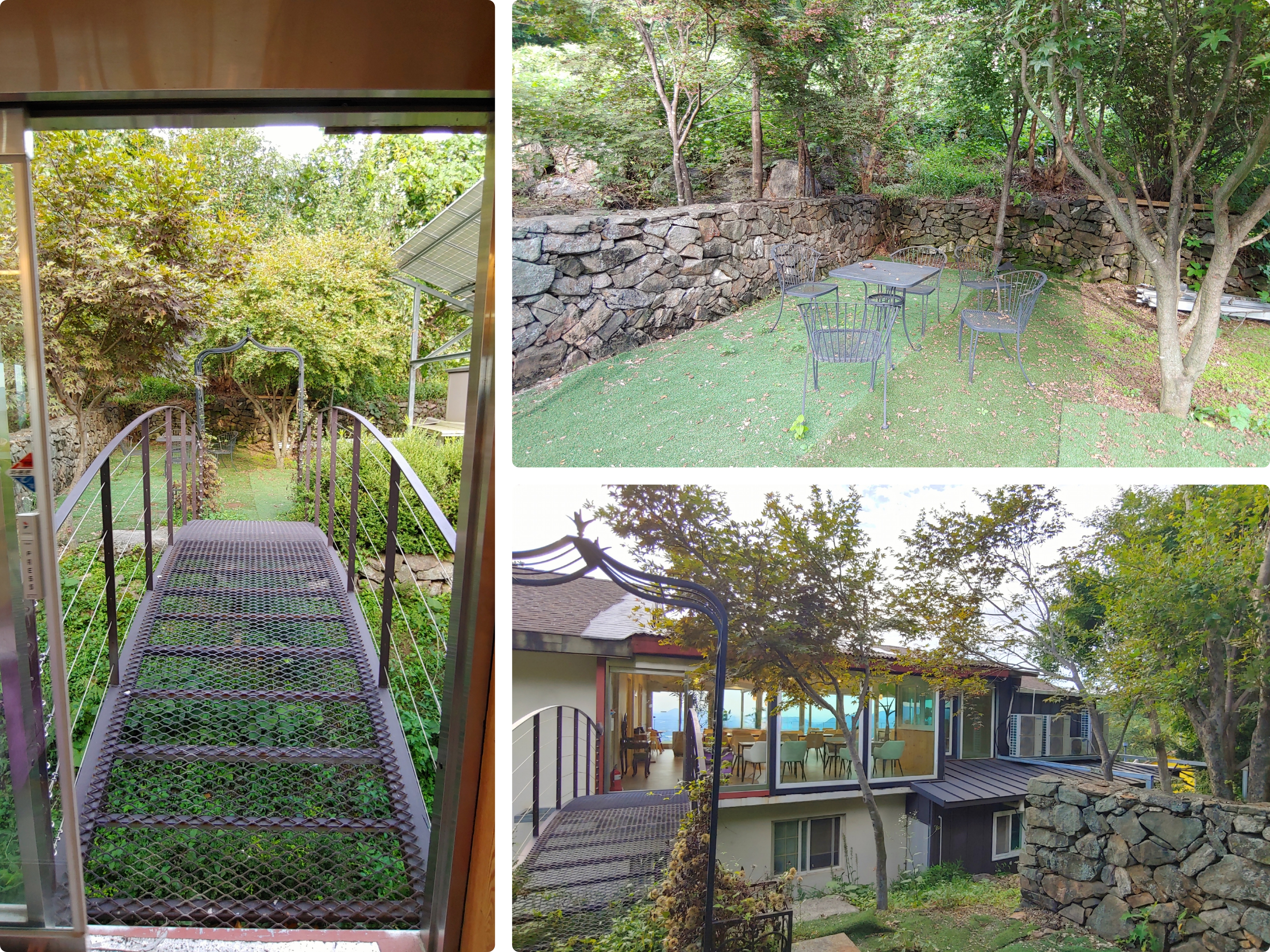 카페 주차장에 차를 세우고 올라 가면 오른쪽부터 데크, 1층 실내, 2층으로 가는 길이 순서대로 나온다.