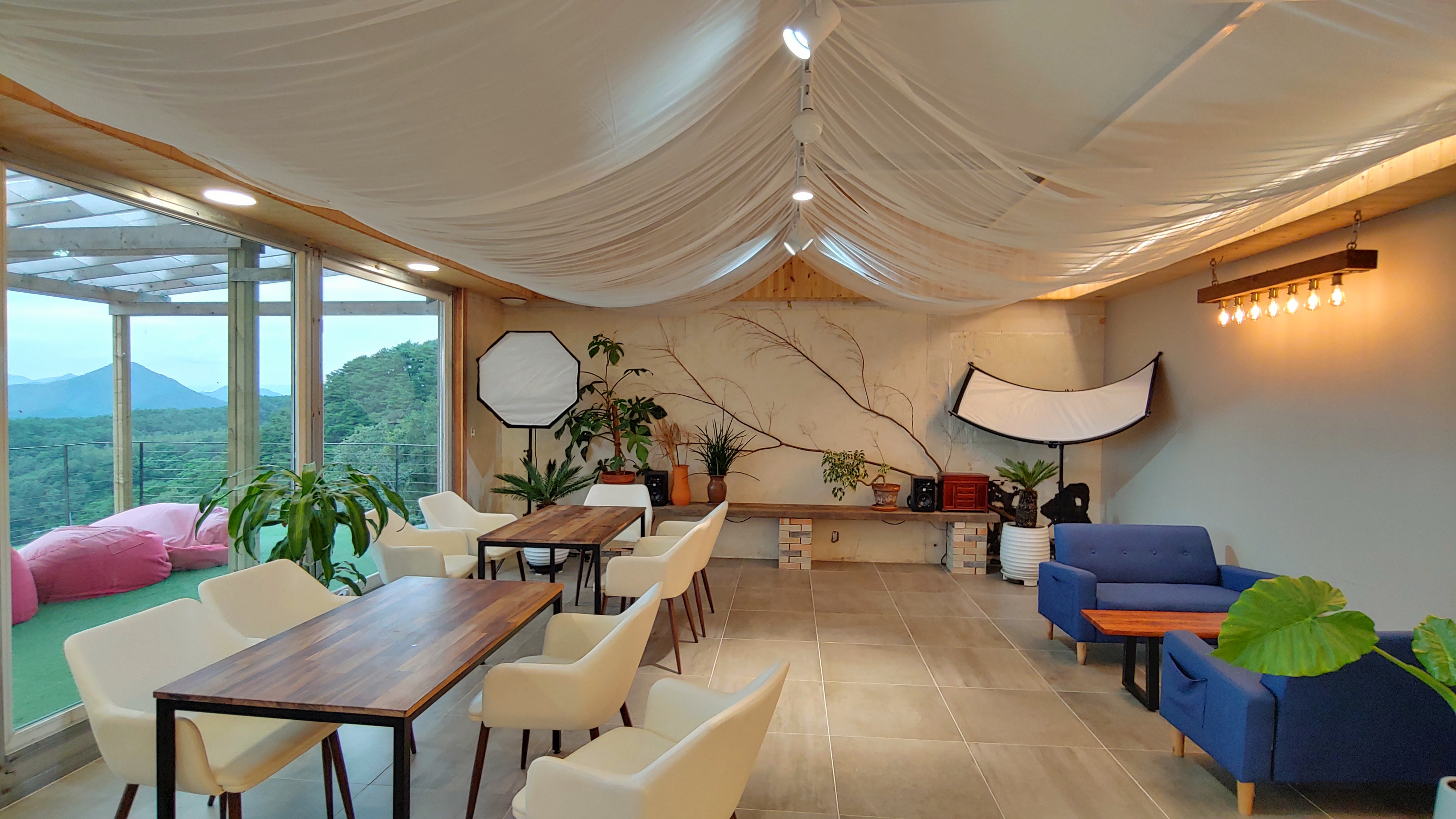 오른쪽은 통창으로 되어 있다. 통창 밖에는 빈백이 놓여있는 발코니다 있다. 안과 바깥 모두 마운틴뷰를 즐기기에 좋다.