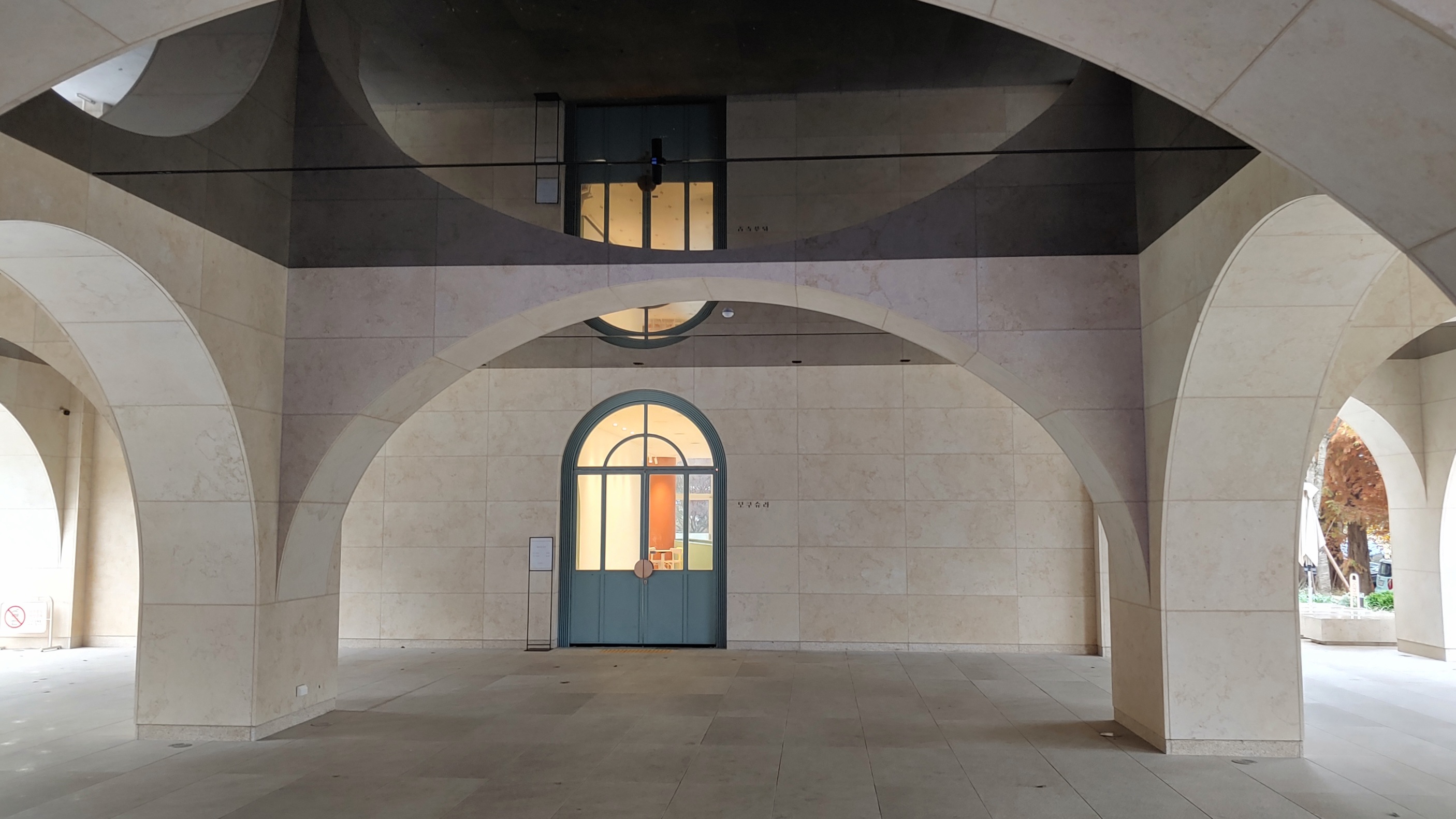 카페 뒤 주차장에 차를 세우고 들어가면 오른쪽에는 대형 유리문 너머로 미디어 아트가 보인다. 왼쪽에는 아치형 작은 문이 보인다. 1층은 입구에 따라서 나눠져 있지만 2층부터는 하나로 연결되어 있다.